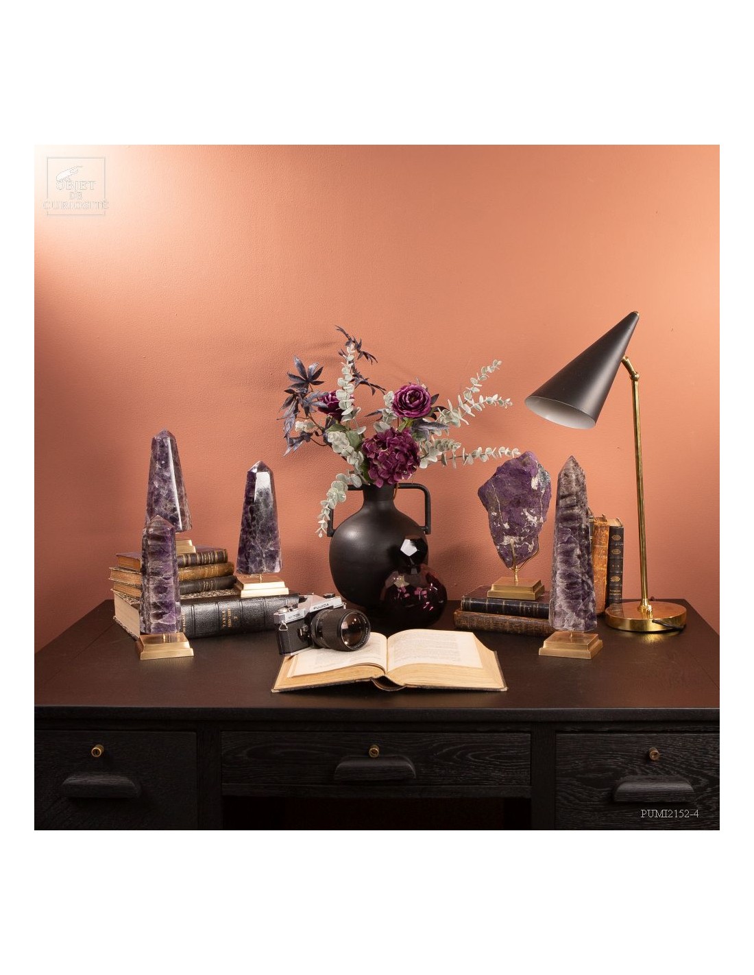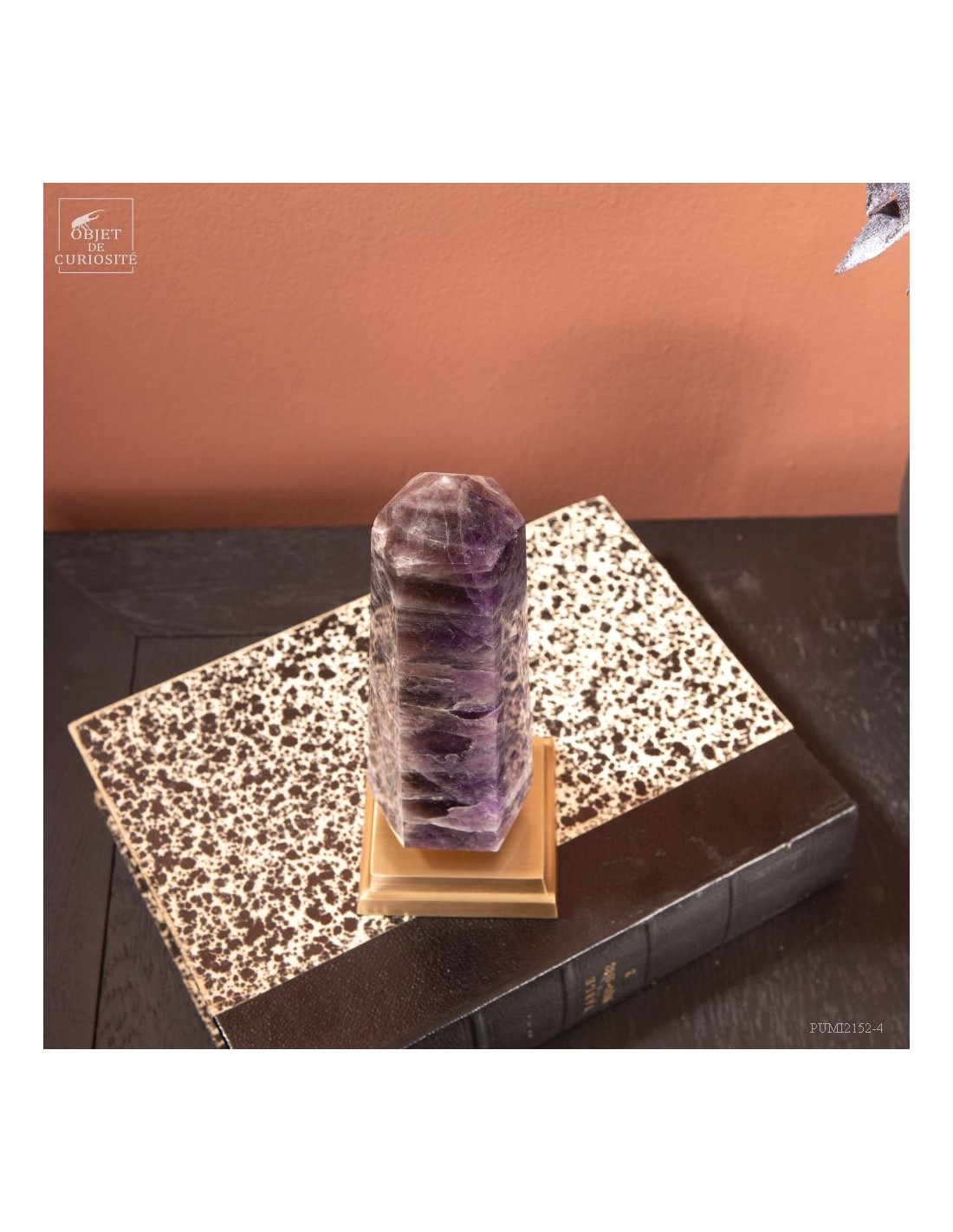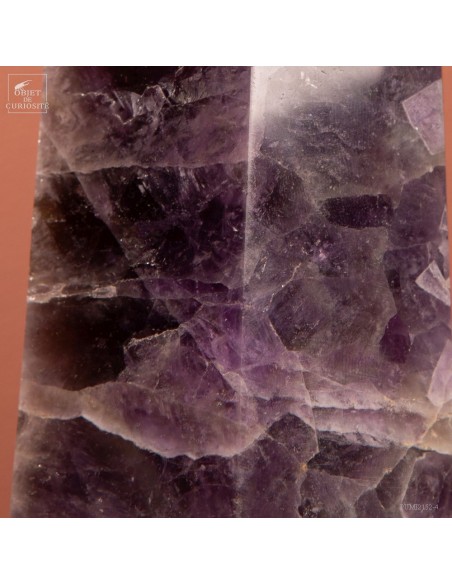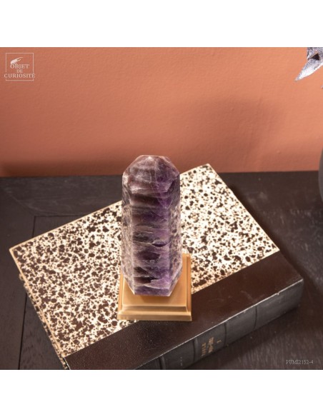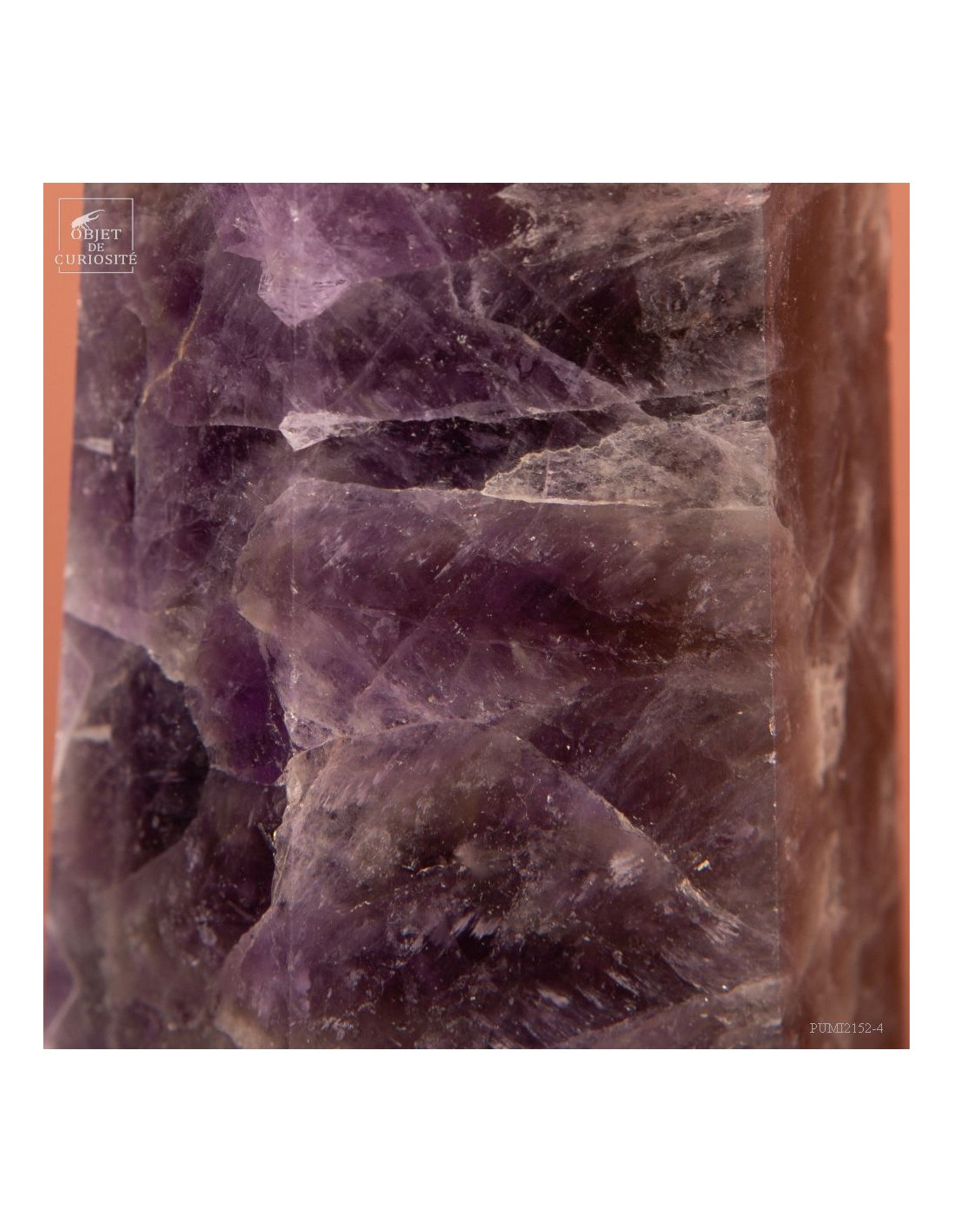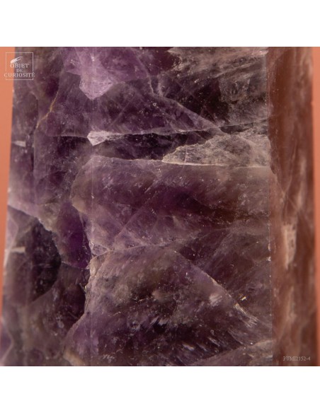 Pour obtenir ces motifs dans l'améthyste, ce prisme a été taillé dans un sens inhabituel: horizontalement. Les motifs dessinés par les pointes naturelles, le rendent unique. C'est pour cela qu'il peut atteindre la hauteur de 24cm!