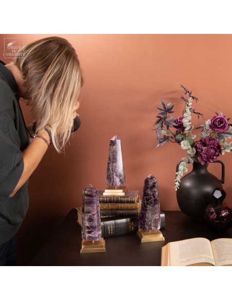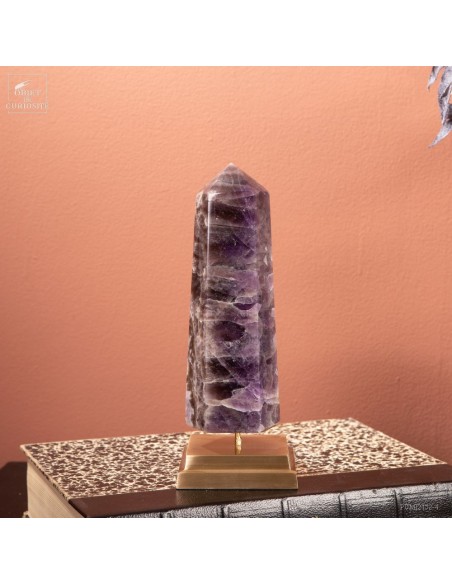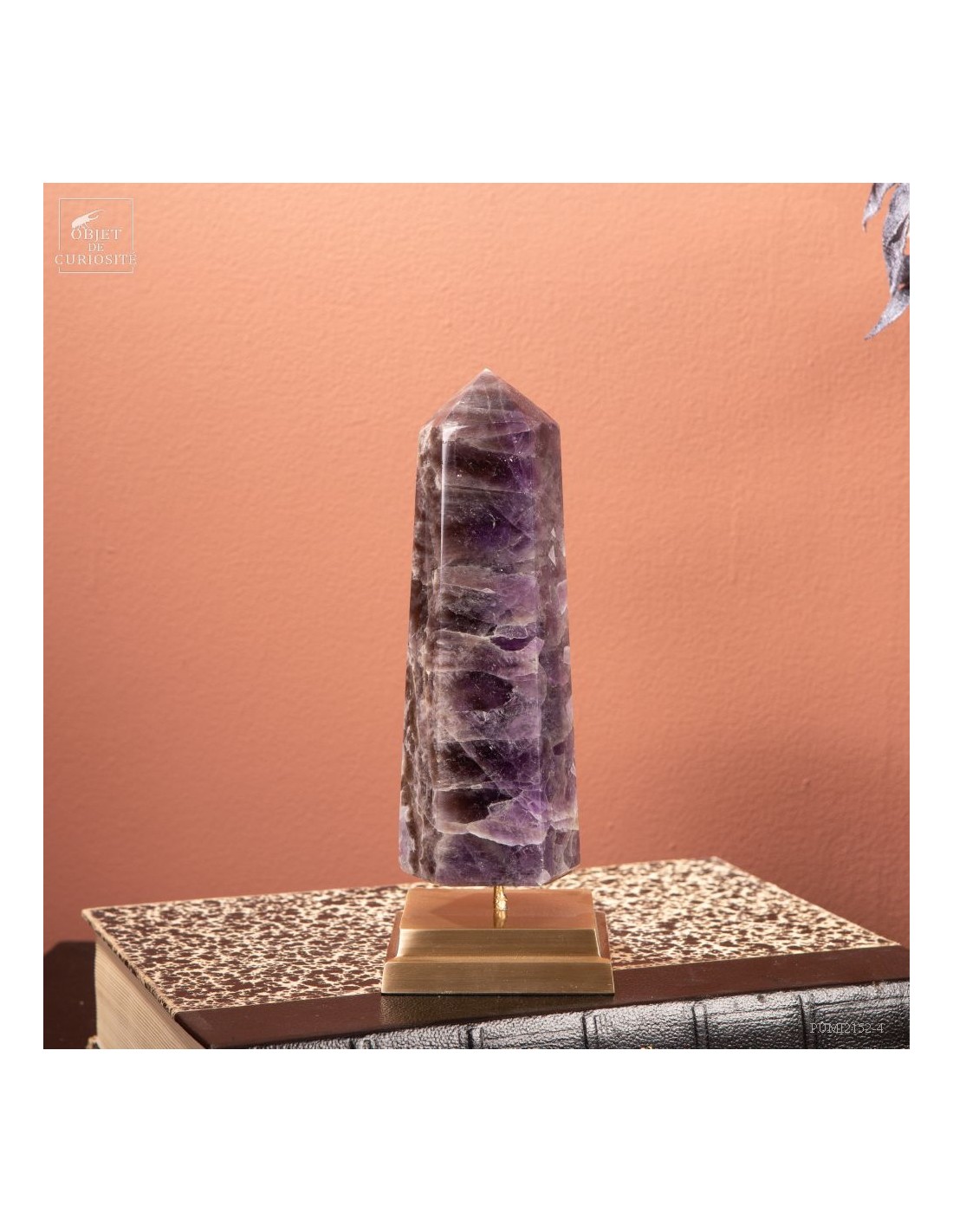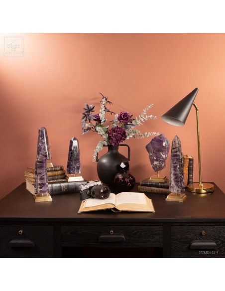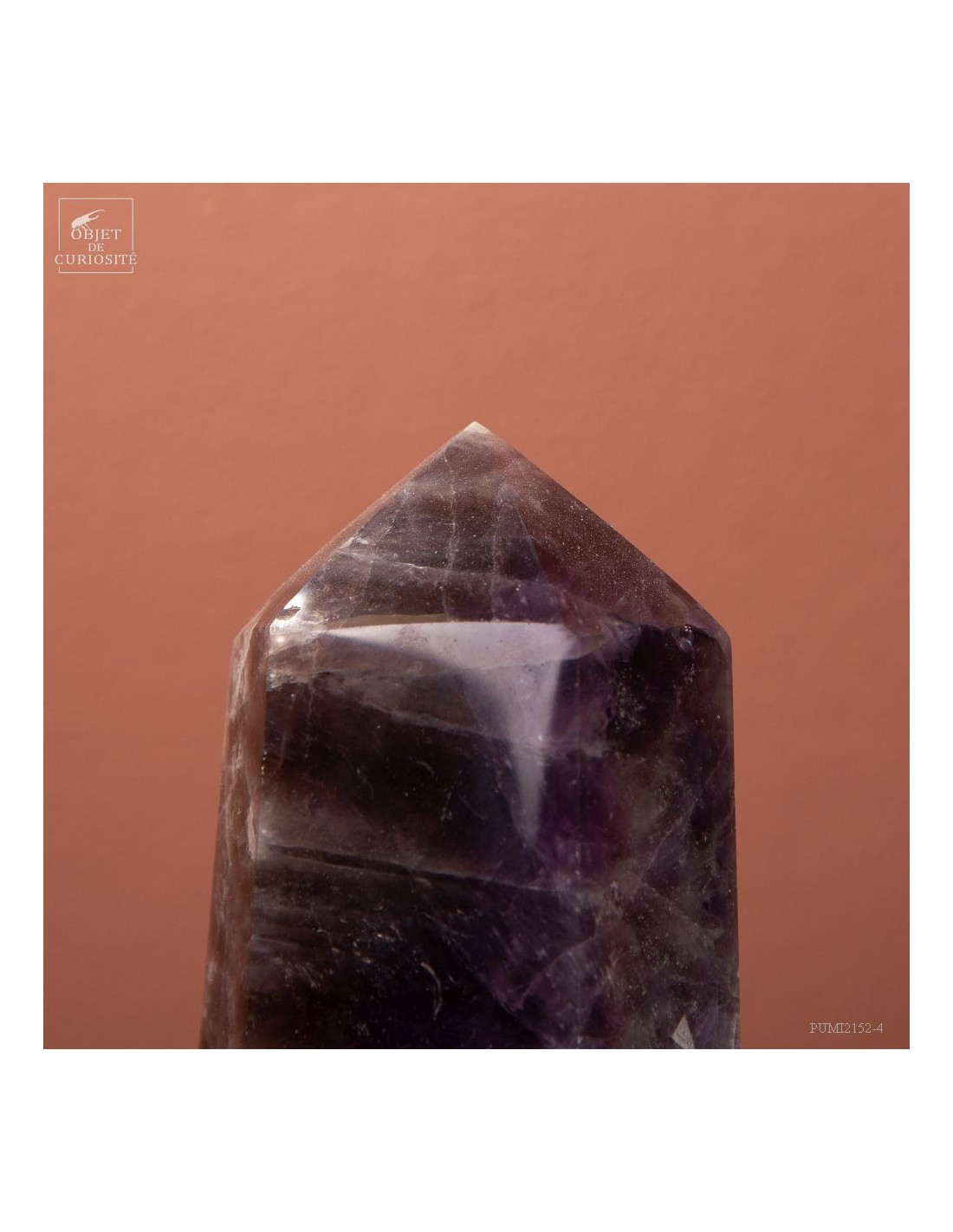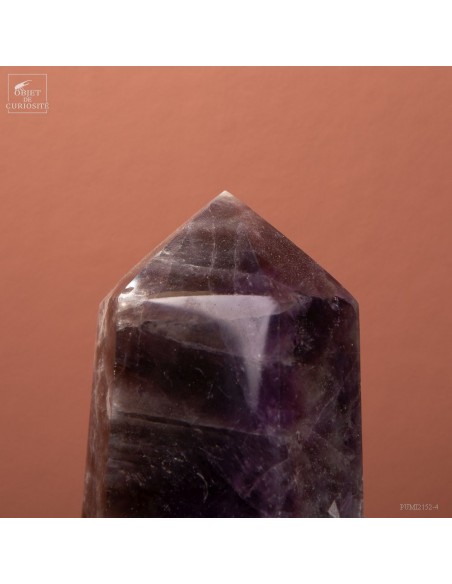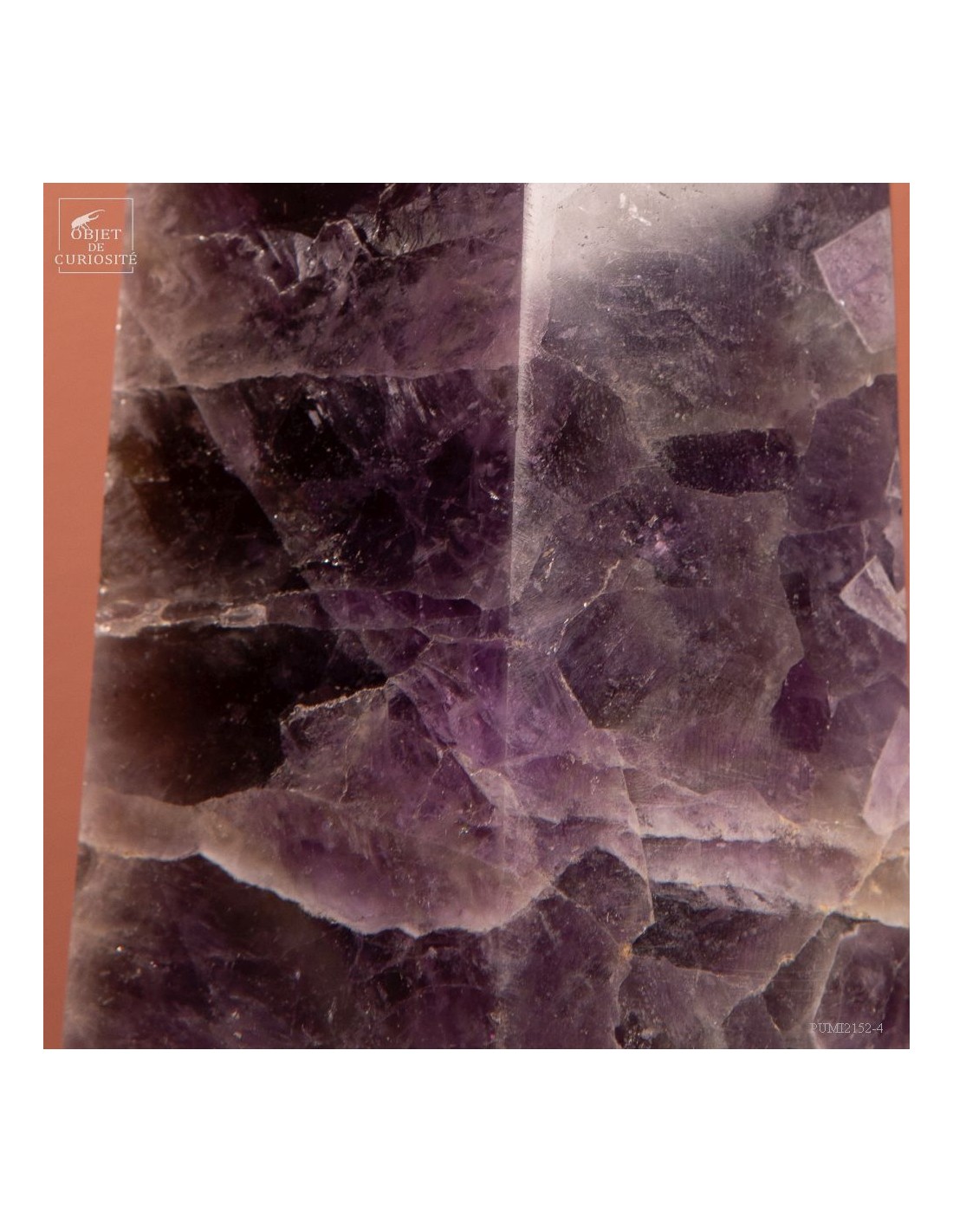 Pour obtenir ces motifs dans l'améthyste, ce prisme a été taillé dans un sens inhabituel: horizontalement. Les motifs dessinés par les pointes naturelles, le rendent unique. C'est pour cela qu'il peut atteindre la hauteur de 24cm!