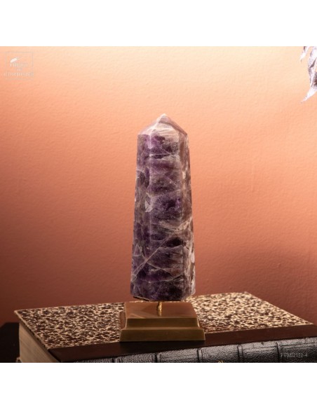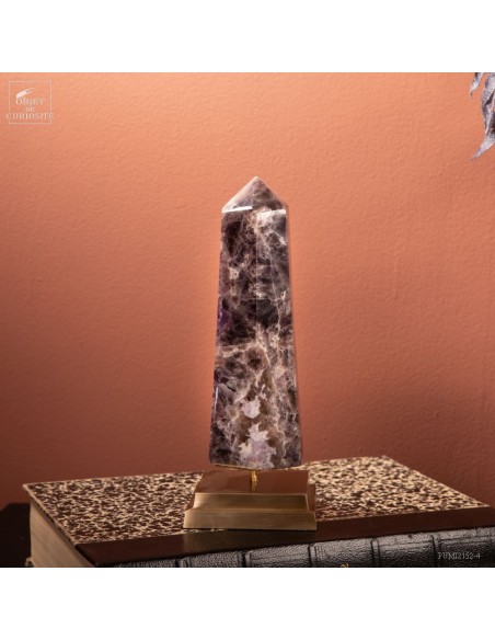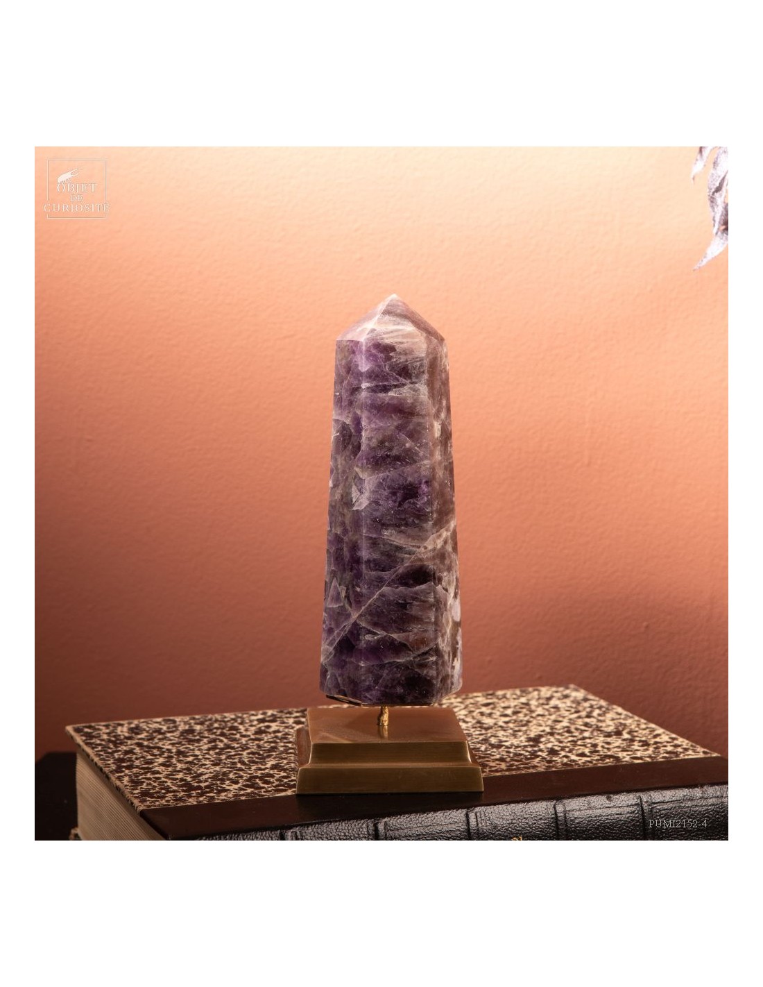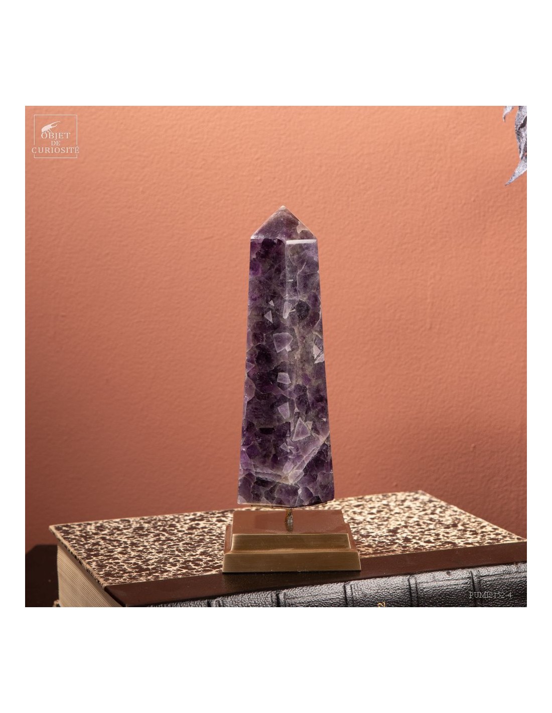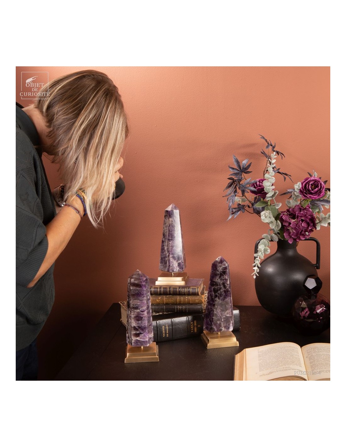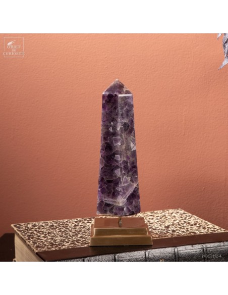 Pour obtenir ces motifs dans l'améthyste, ce prisme a été taillé dans un sens inhabituel: horizontalement. Les motifs dessinés par les pointes naturelles, le rendent unique. C'est pour cela qu'il peut atteindre la hauteur de 24cm!