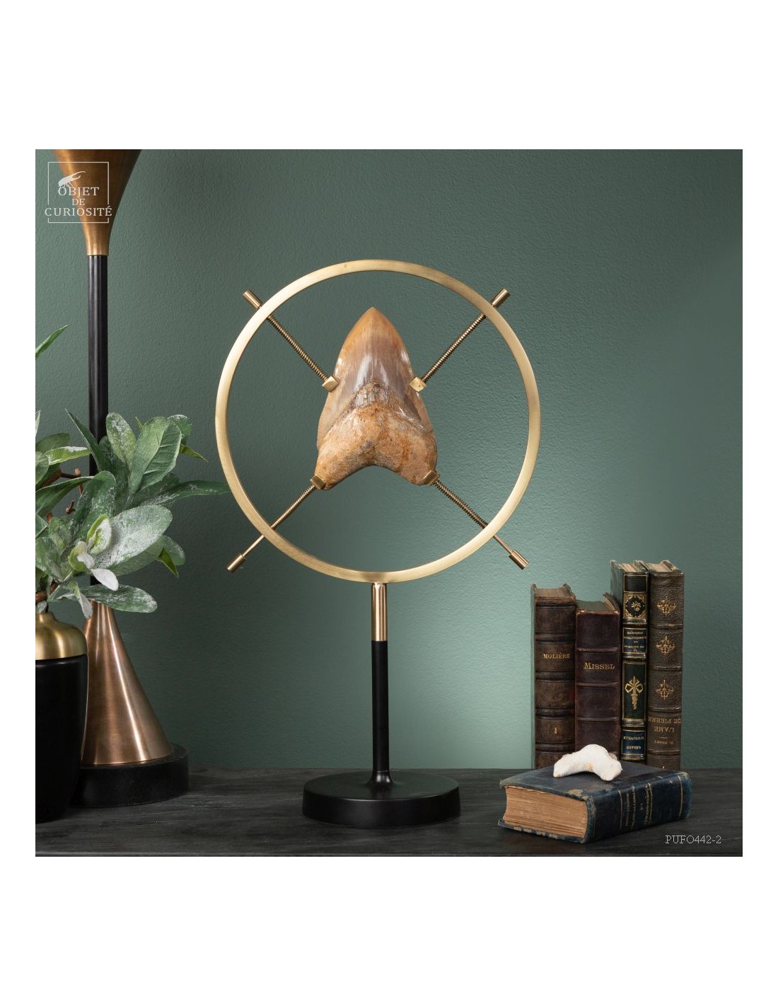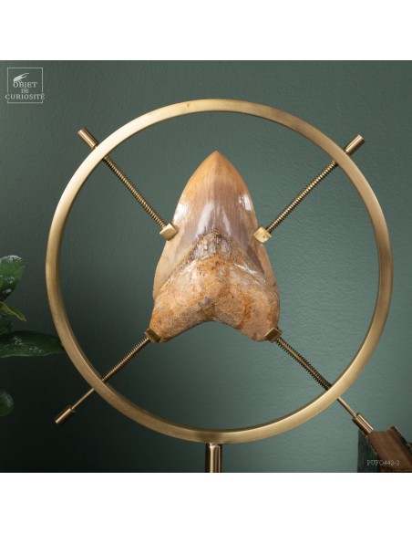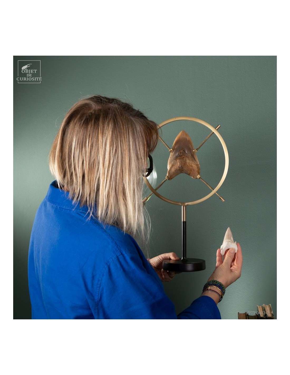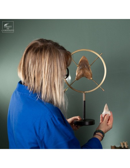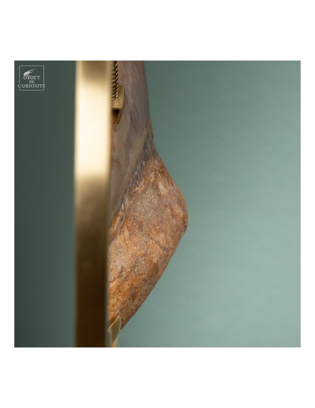 De ce géant des mers on ne connaît que les dents. Mais quelles dents! Celle-ci est particulièrement grande: 13,5cm (de la pointe à la base de la racine). Ce fossile découvert en Caroline du Sud aux USA à entre 25 et 2.5 millions d'années. Il appartenait à un requin géant: l'Odontus Megalodon qui pouvait mesurer jusqu'à 16 mètres de long. comme tous les requins, son squelette était composé uniquement de cartilage, et la seule partie que nous pouvons tenir dans nos mains ce sont les dents. et, chose incroyable: elle est encore tranchante.