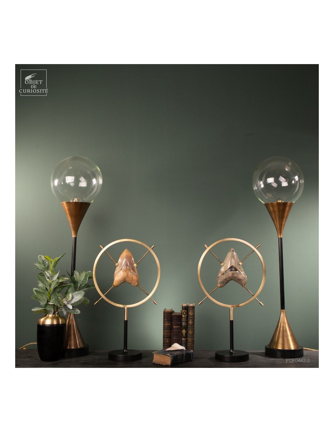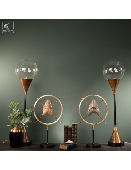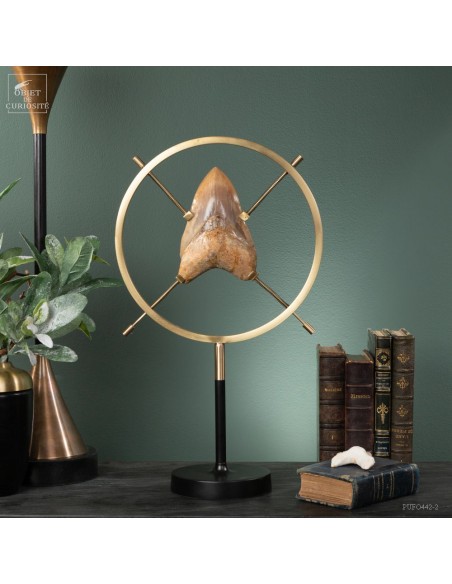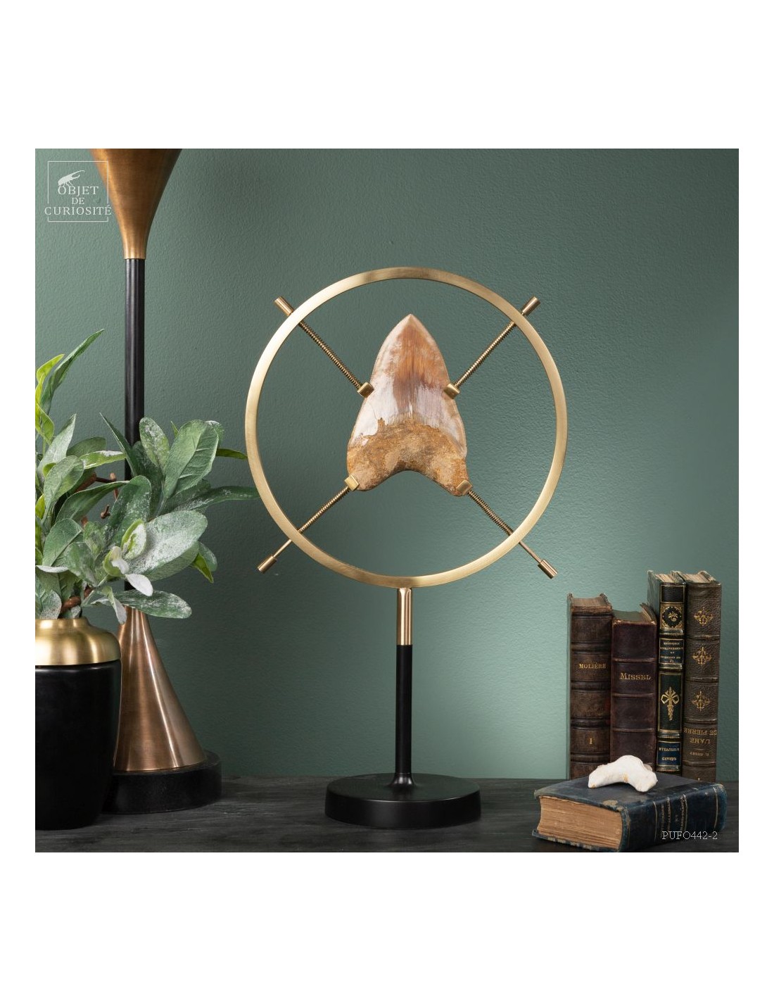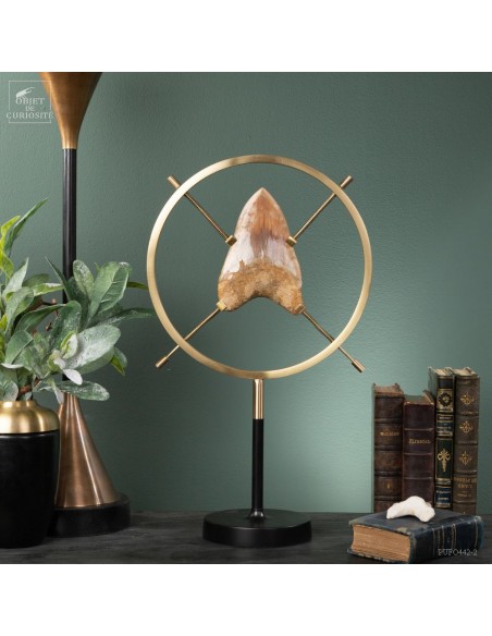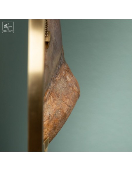 De ce géant des mers on ne connaît que les dents. Mais quelles dents! Celle-ci est particulièrement grande: 13,5cm (de la pointe à la base de la racine). Ce fossile découvert en Caroline du Sud aux USA à entre 25 et 2.5 millions d'années. Il appartenait à un requin géant: l'Odontus Megalodon qui pouvait mesurer jusqu'à 16 mètres de long. comme tous les requins, son squelette était composé uniquement de cartilage, et la seule partie que nous pouvons tenir dans nos mains ce sont les dents. et, chose incroyable: elle est encore tranchante.