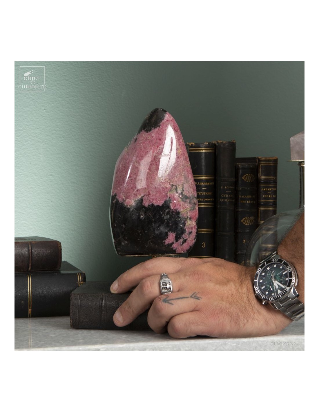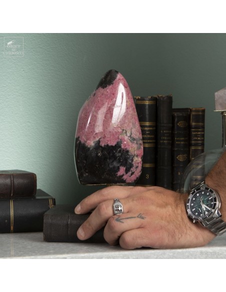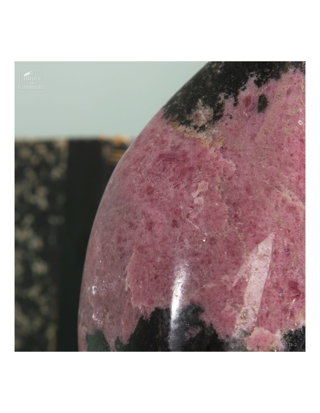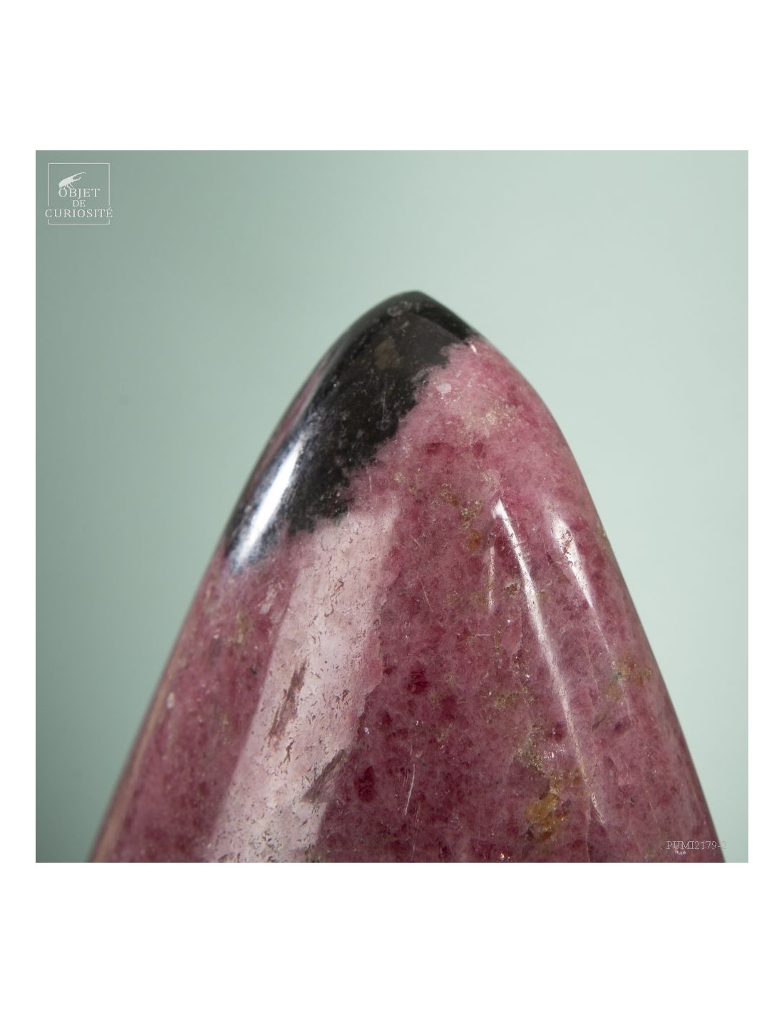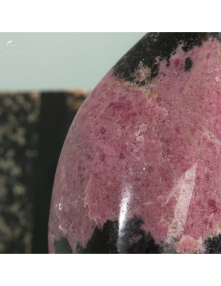 La Rhodonite est un minéral du groupe des Silicates comprenant un fort taux de Manganèse. Cette pierre marbrée de rose provient de Madagascar, Mais il y a des mines également aux États Unis ou en France.