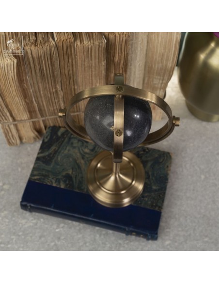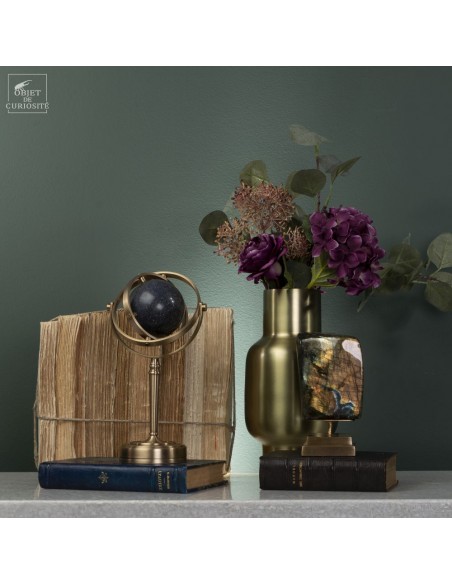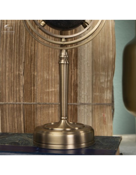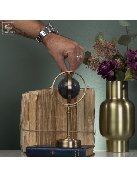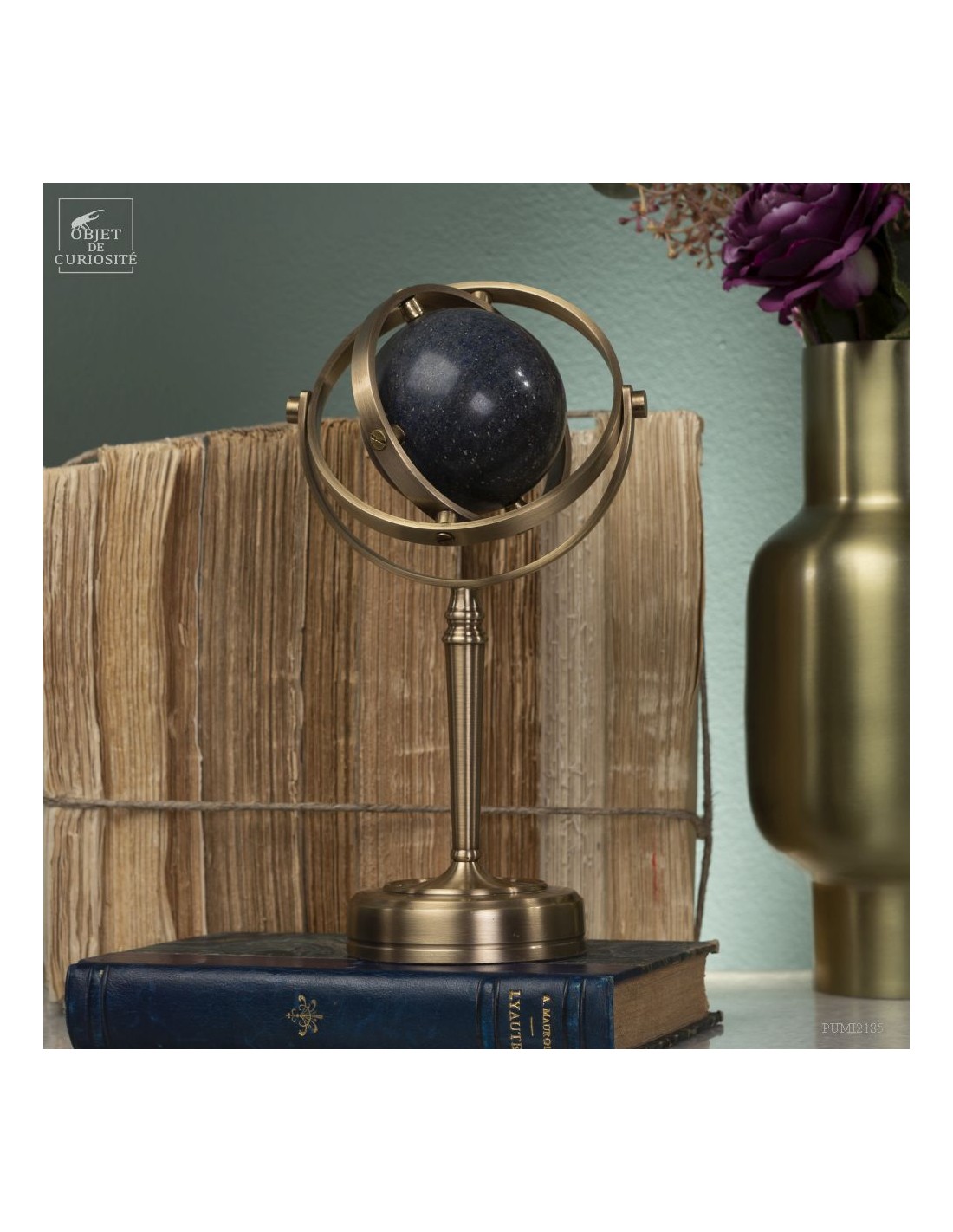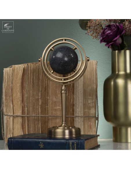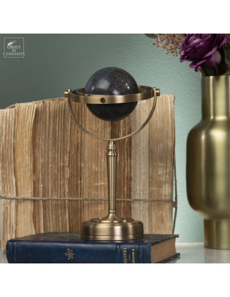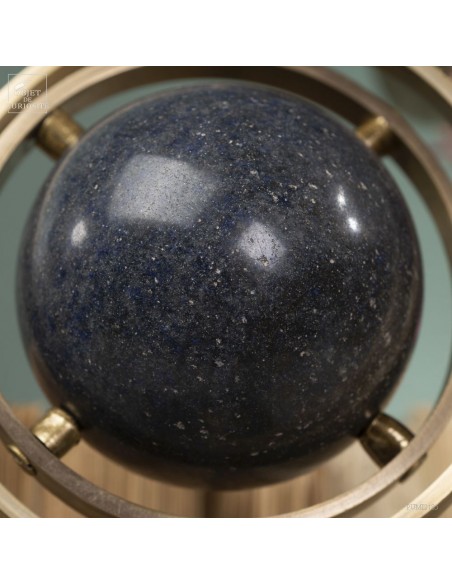 Bien sûr la Lazurite est l'un des composants du célèbre Lapis-lazuli, mais ce minéral lorsqu'il est isolé, ressemble à un ciel d'été constellé de petites étoiles blanches. On perçoit encore mieux ses nuances en la faisant tourner sur elle même grâce à ce support gyroscopique en laiton.