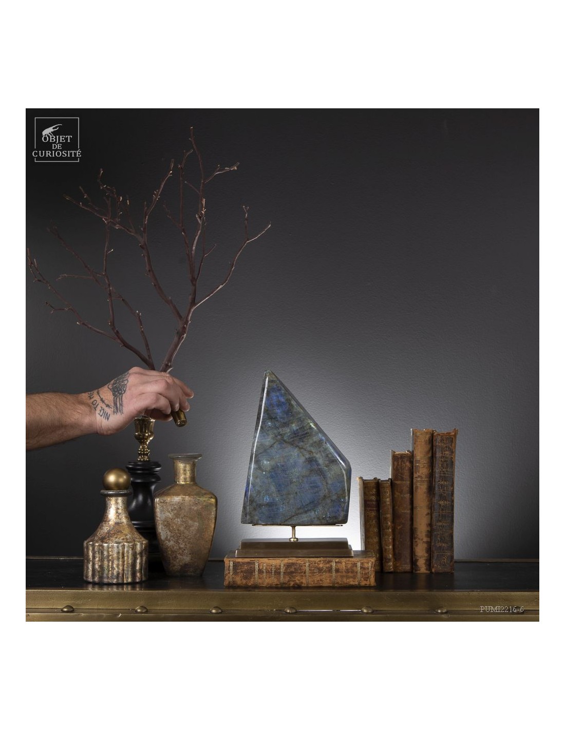 Cette pierre de Madagascar présente des reflets métalliques incroyables allant de bleu foncé à vert/dorés, suivant l'angle dans laquelle on la regarde. Celle-ci gagne a être regardée par dessus, car elle montre alors un grand cristal bleu très intense. Ce minéral est souvent recherché pour ses vertus protectrices. Et définitivement pour son pouvoir attirant!
