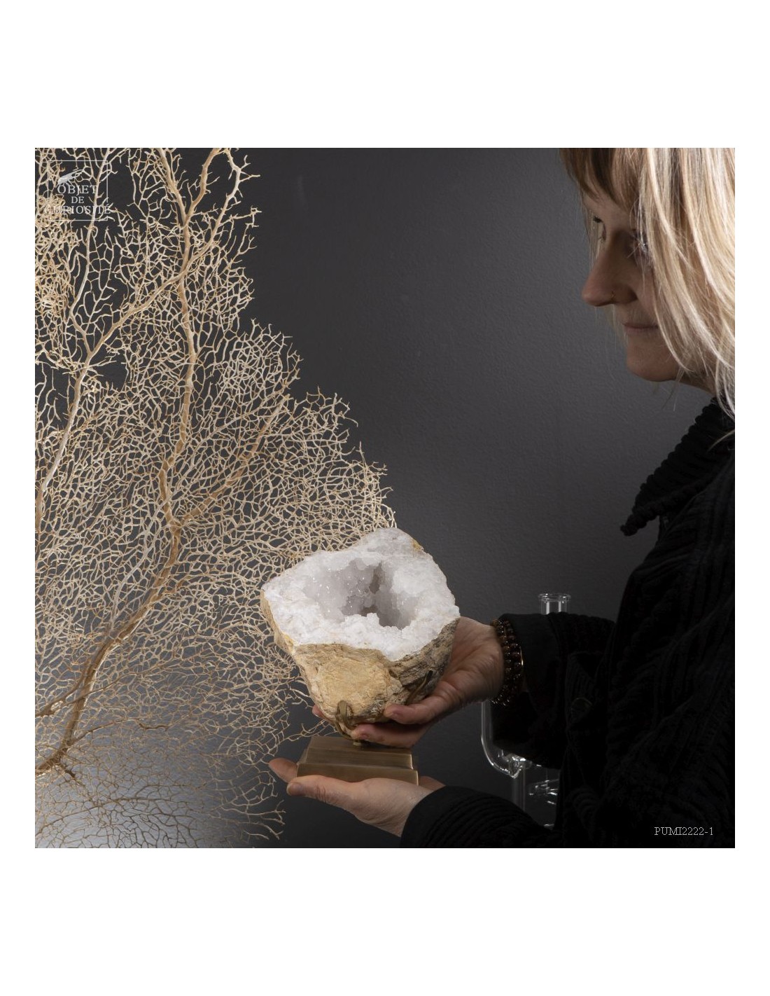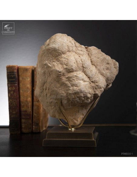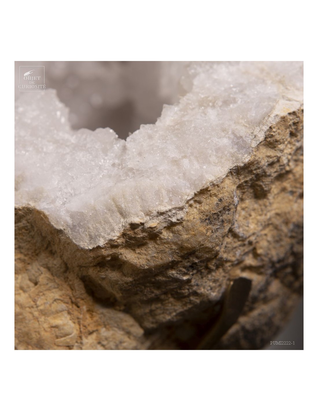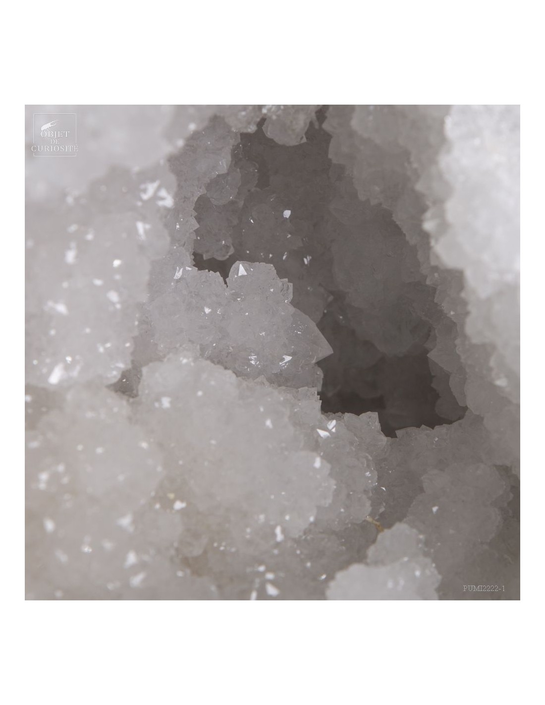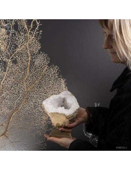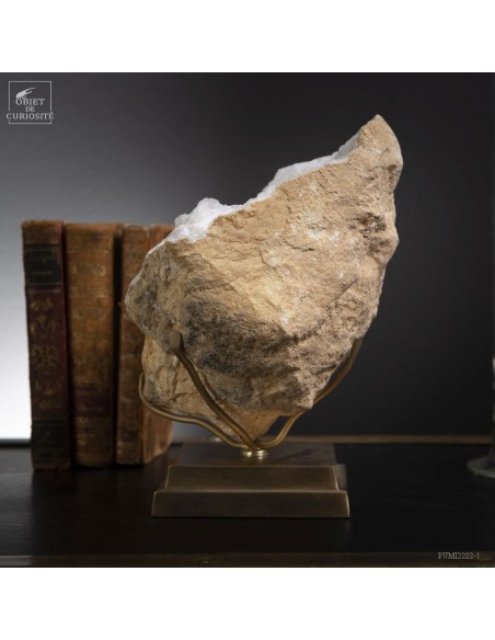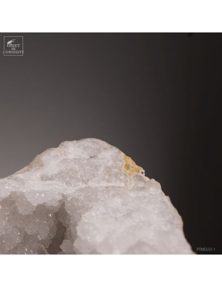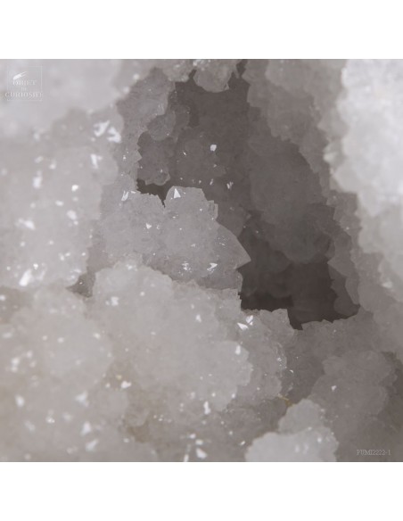 Ce minéral est une grande géode de Quartz blanc de l'extrême sud Marocain - près de Laâyoune - et qui a l'air d'une simple boule de pierre naturelle. L'intérieur est une vraie cavité de cristaux naturels. Un contraste saisissant avec L'extérieur très simple de ce minéral.