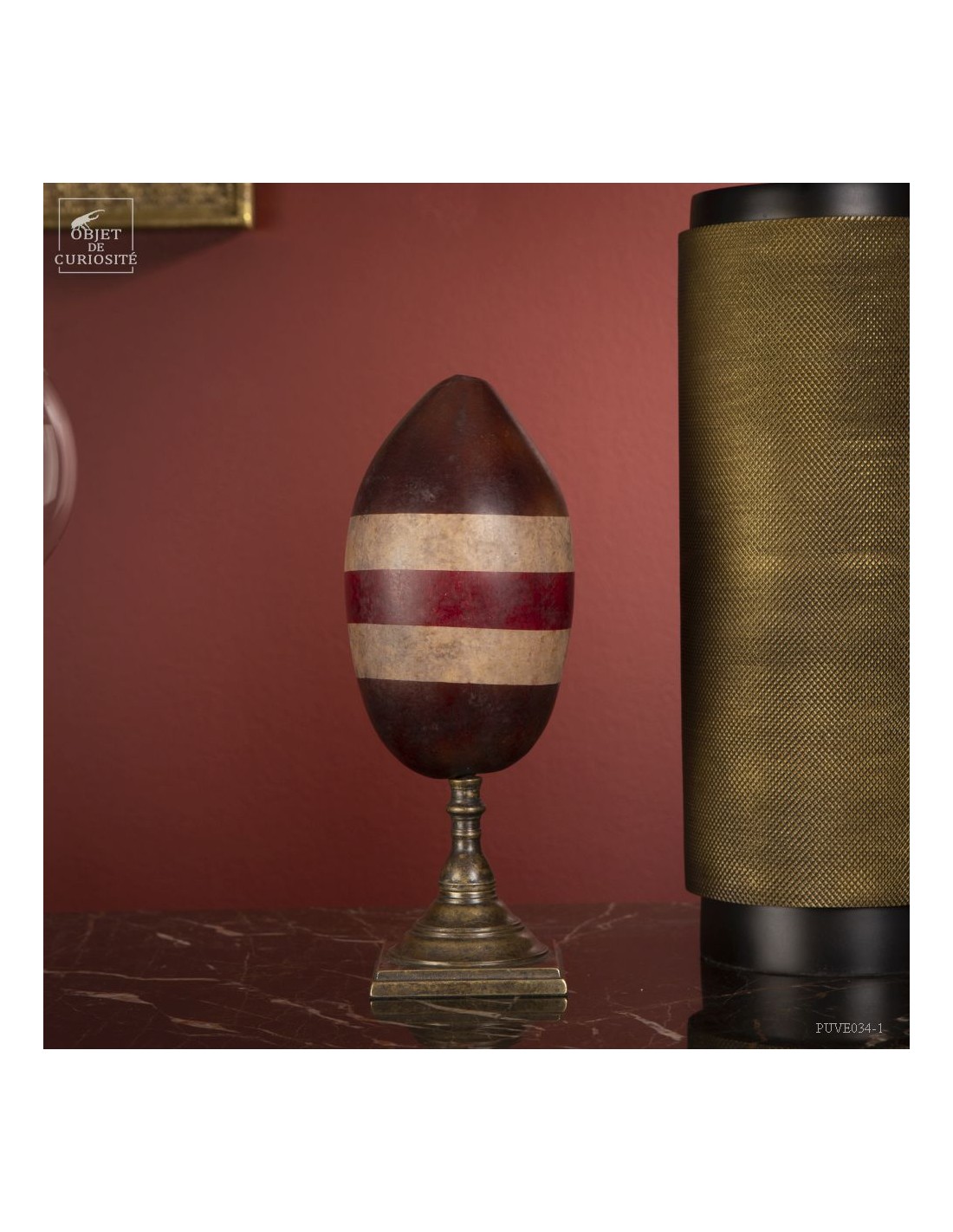 C'est en utilisant des teintures végétales uniquement que cet artiste Sud-africain a transformé ces légumes, traditionnellement utilisés comme récipients, en pièces d'art. Les motifs géométriques contemporains appliqués sur cette calebasse, évoquent des motifs et couleurs Africains. Le mélange avec nos socles de laiton bien Européens en fait des objets uniques.