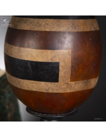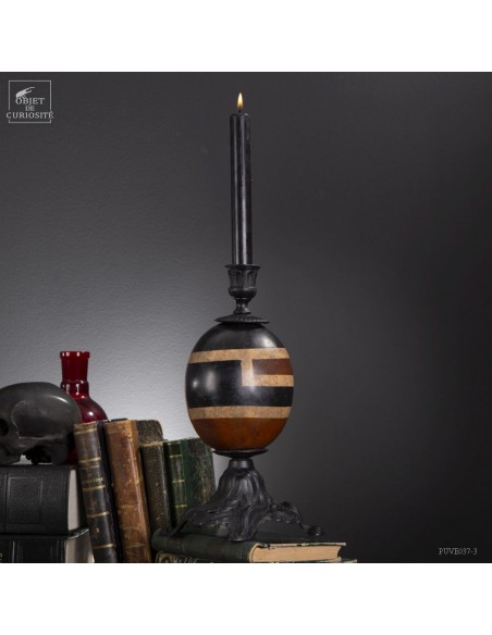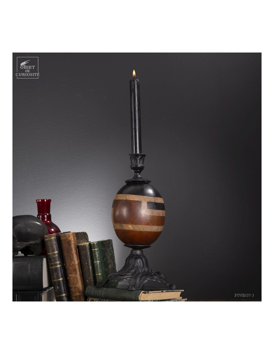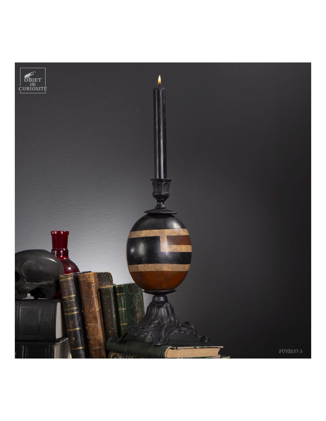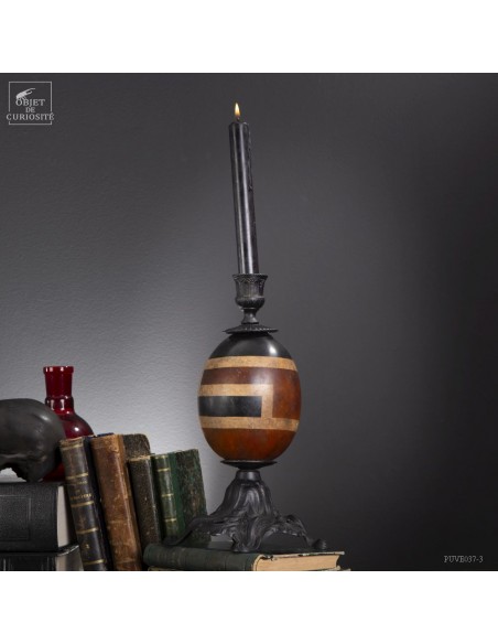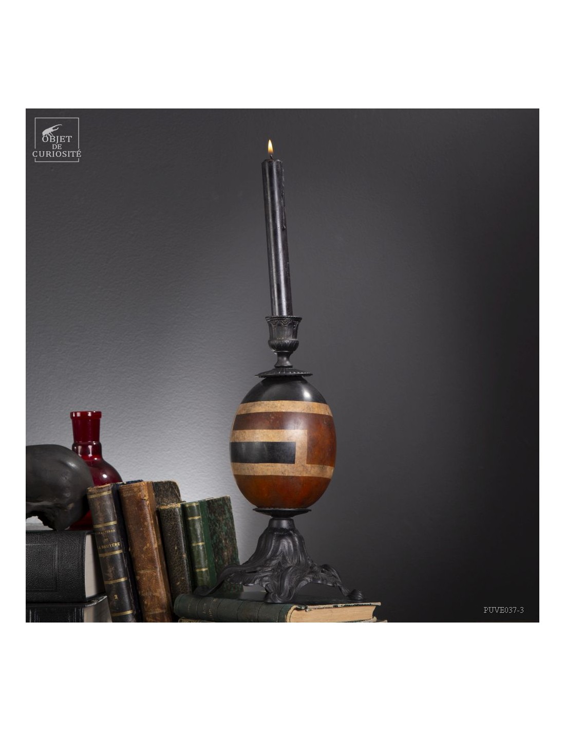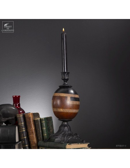 C'est en utilisant des teintures végétales uniquement que cet artiste Sud-africain a transformé ces légumes, traditionnellement utilisés comme récipients, en pièces d'art. Les motifs géométriques contemporains appliqués sur cette calebasse, évoquent des motifs et couleurs Africains. Le mélange avec notre laiton noir bien Européen en fait ce bougeoir unique, ou presque, puisque 4 pièces seulement ont été réalisées.