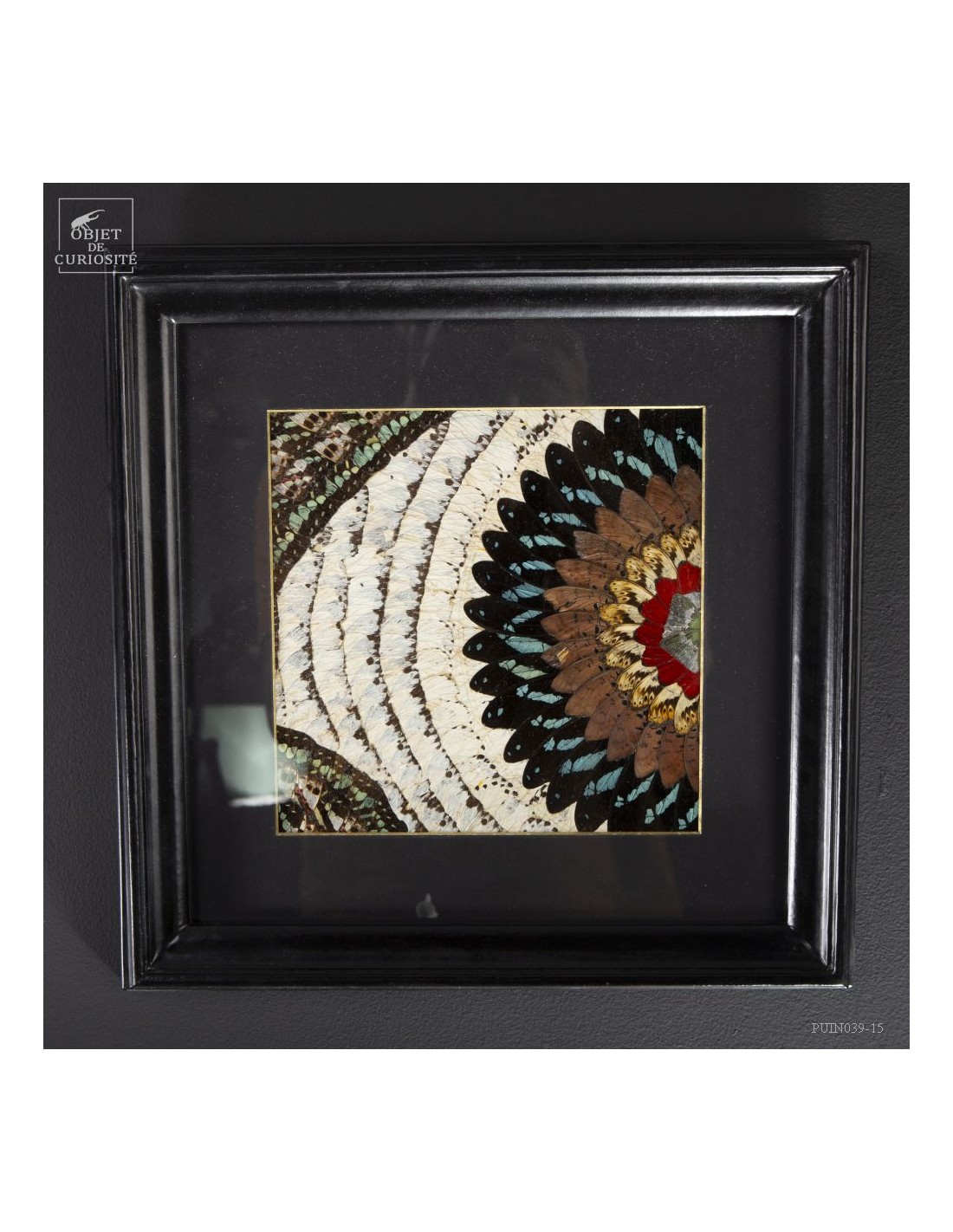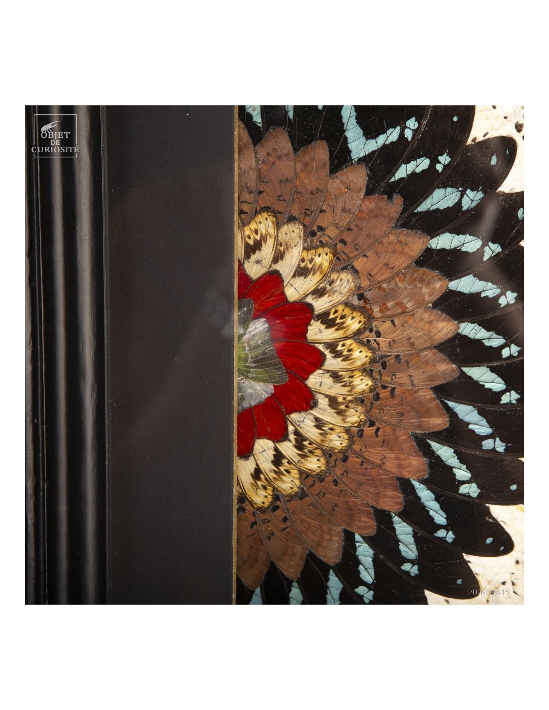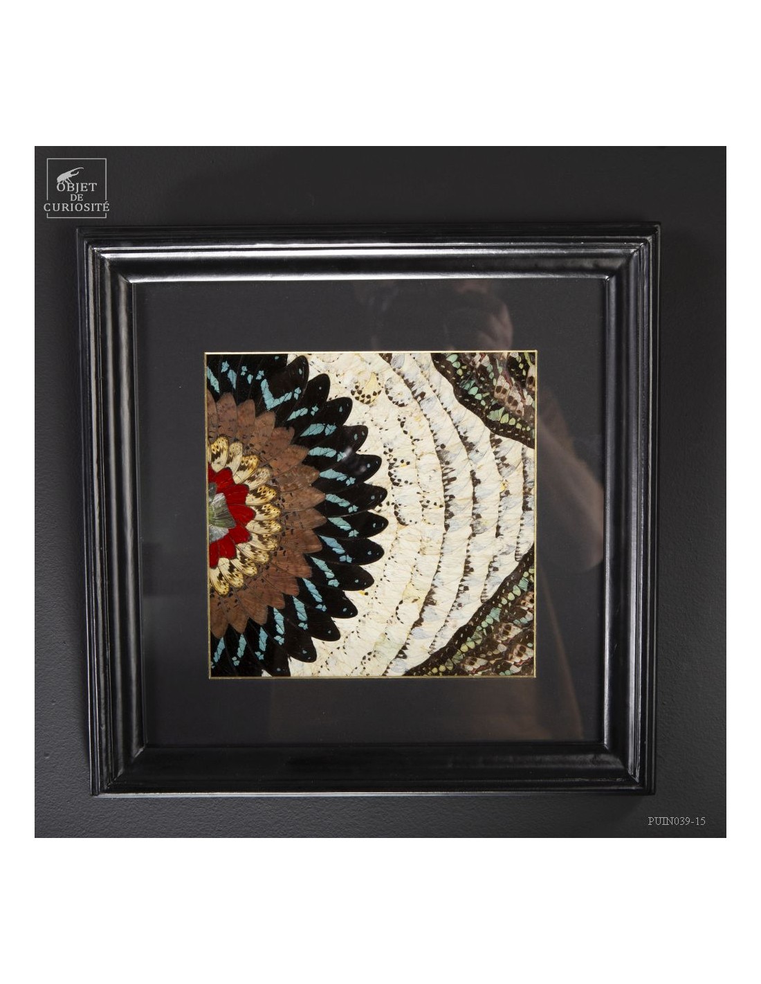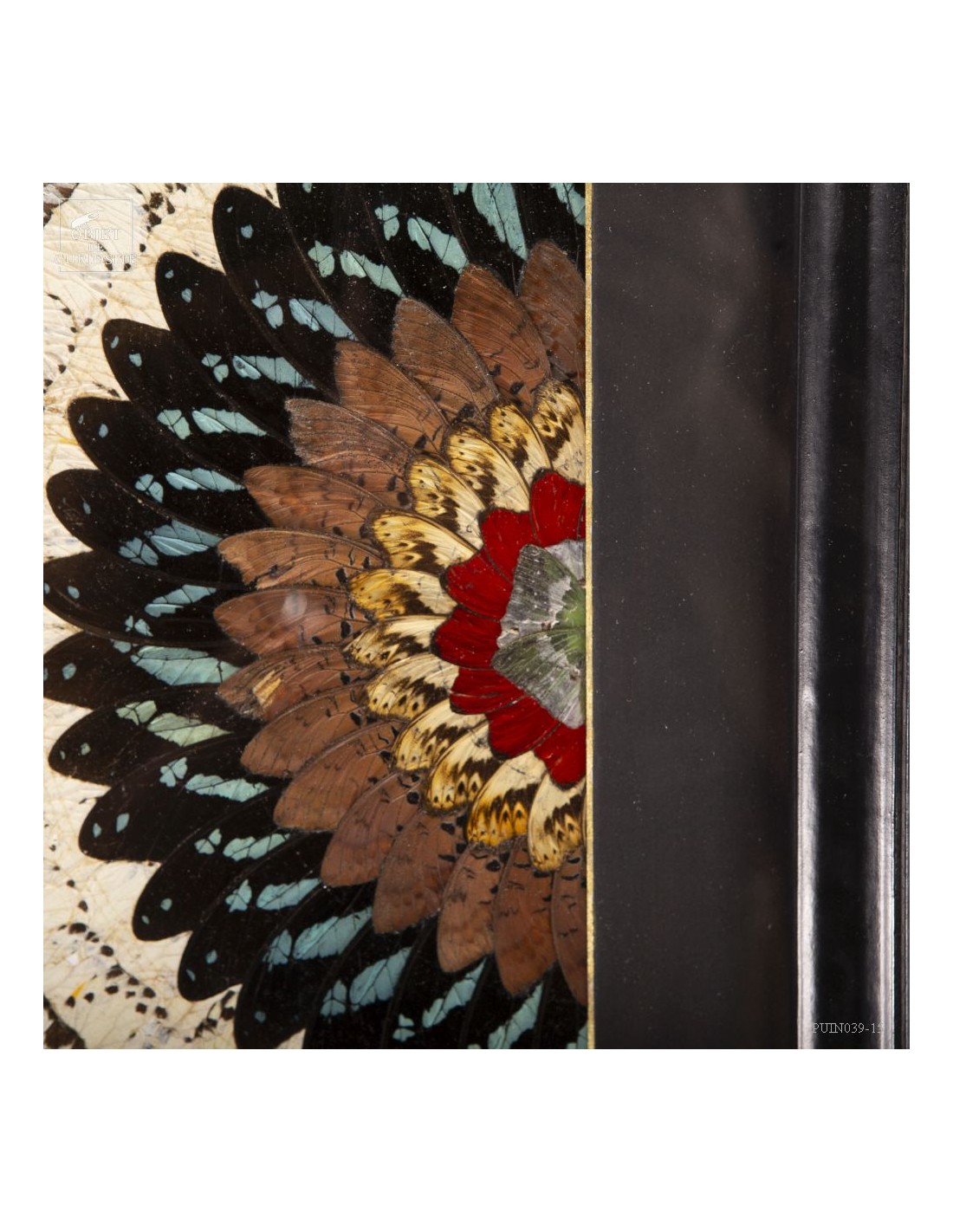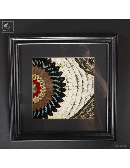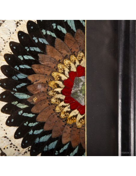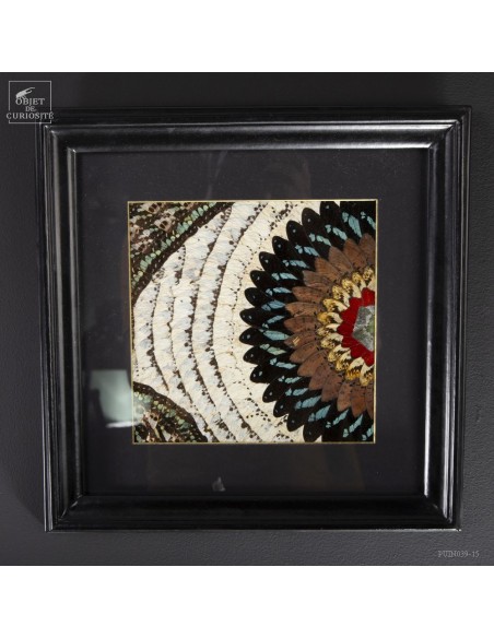 Deux tableaux composés uniquement d'ailes de papillons de Tanzanie. Une paire symétrique . Le contraste entre les Cimothoe Sangaris rouges au centre,  et les Piérides blancs est très réussi. Le cadre est en Manguier massif. L'ensemble est unique.