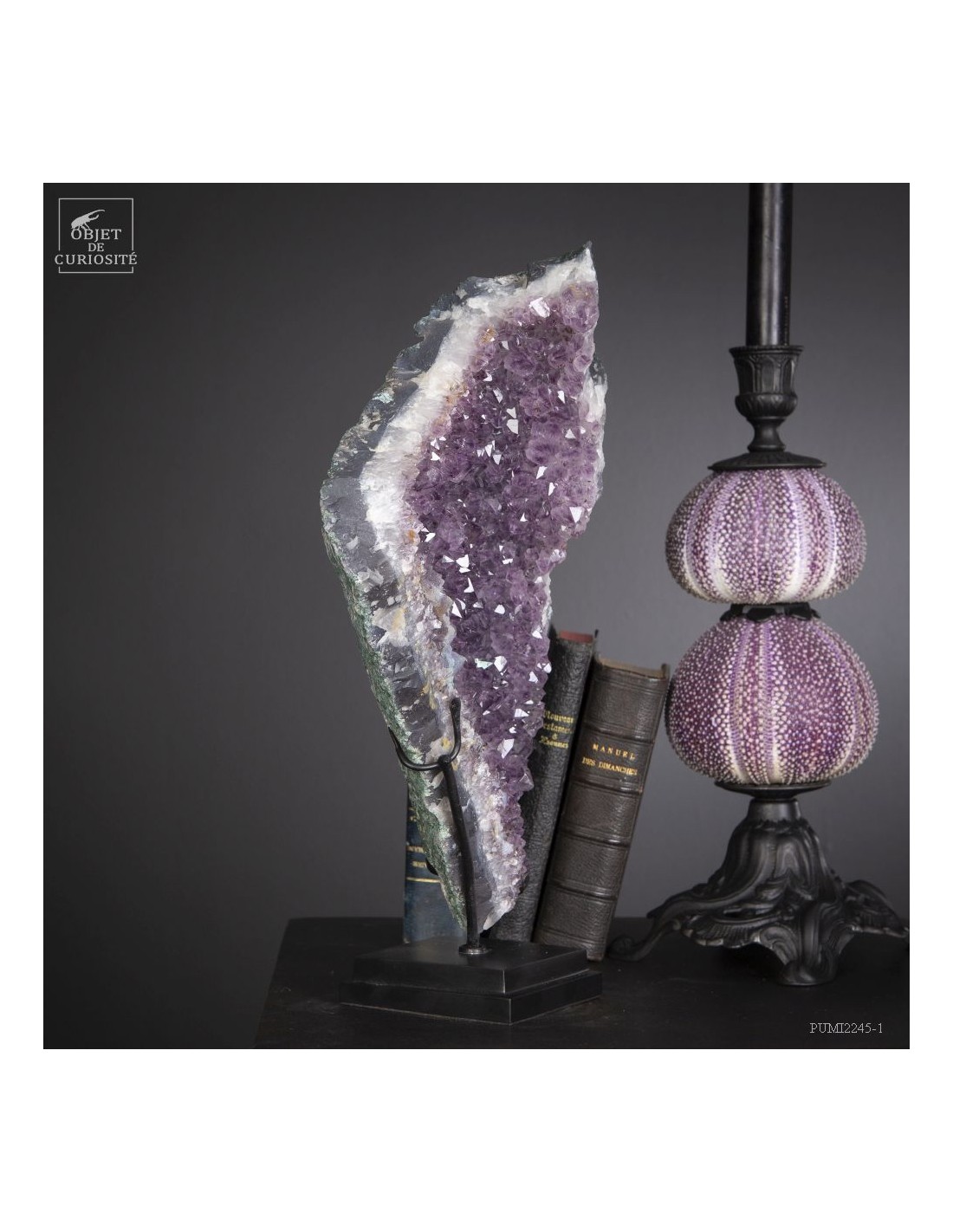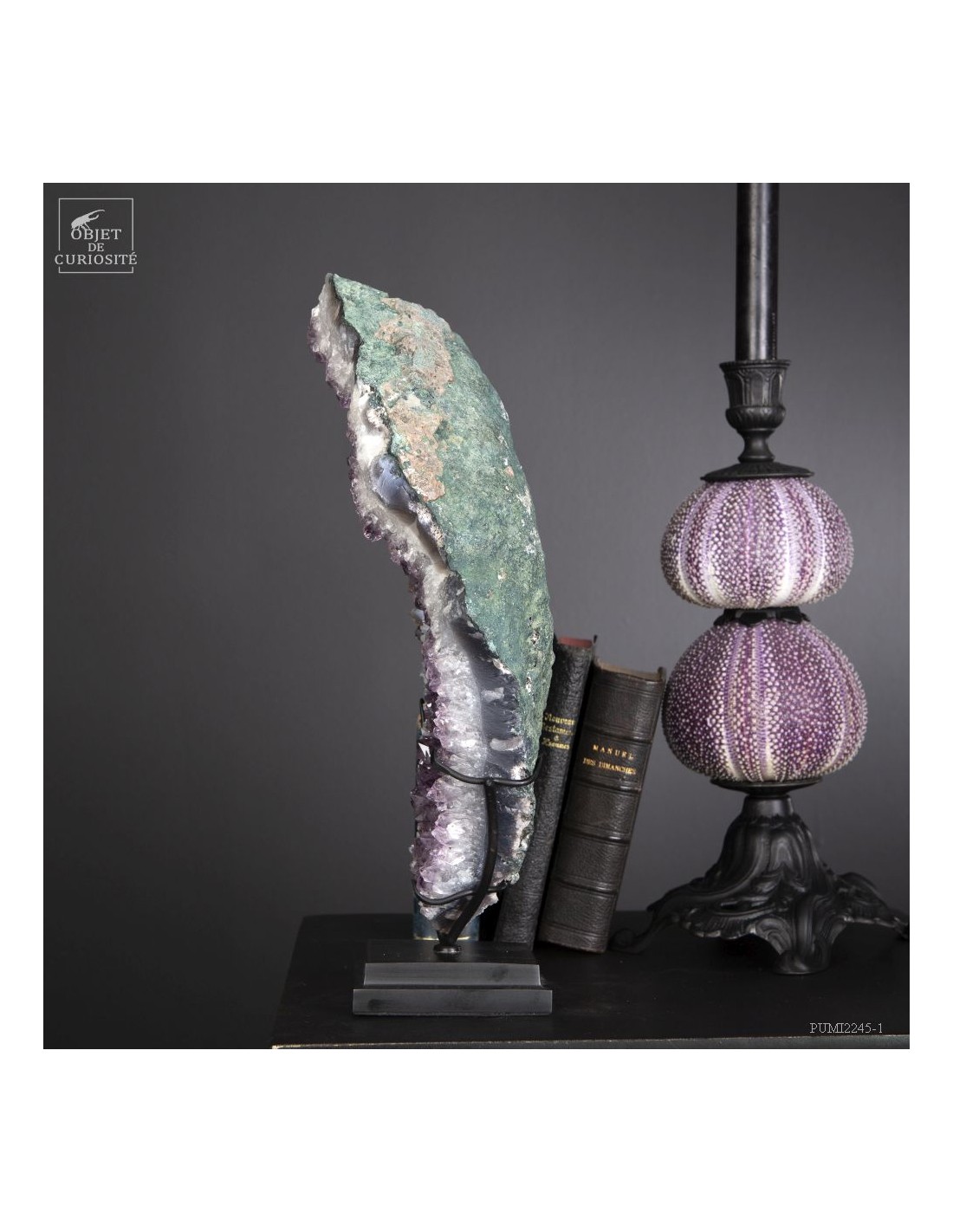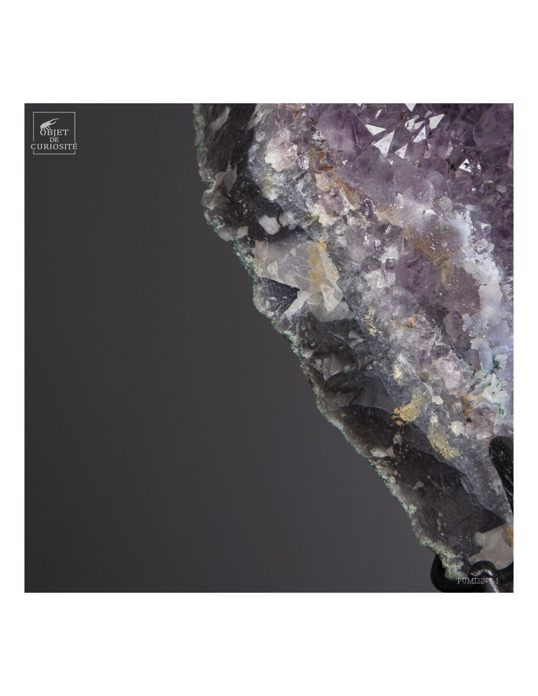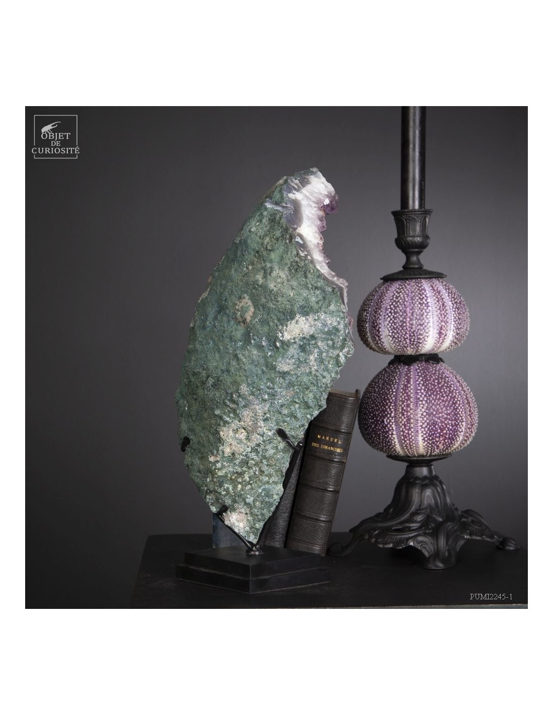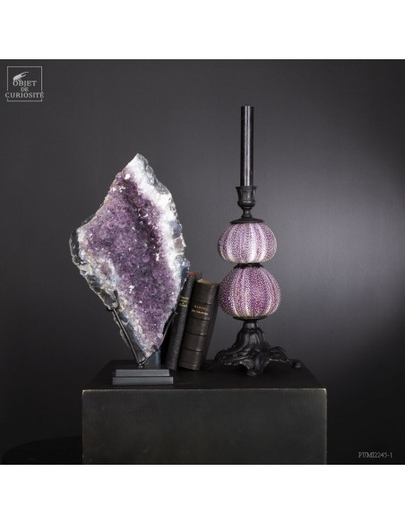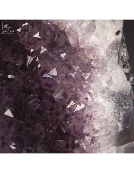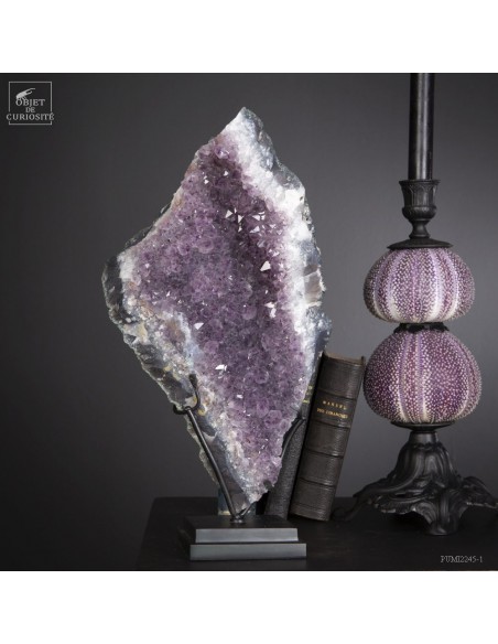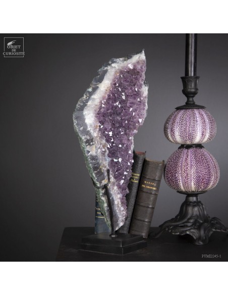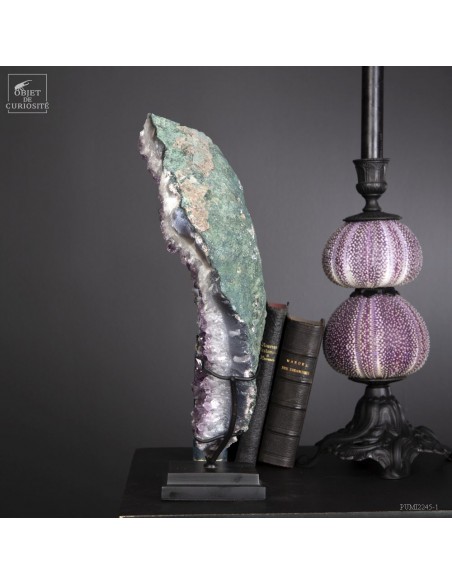 Cette améthyste en plaque du Brésil est en fait une partie d'une géode retrouvée dans sa gangue de Basalte. Très souvent, en essayant de l'extraire de la masse de la lave volcanique où elle a "grandi", les mineurs brisent cette énorme géode. Cette fois, pas de réparation, juste une grande plaque partie, qui montre tout le contraste des cristaux violets avec la gangue de Basalte vert..