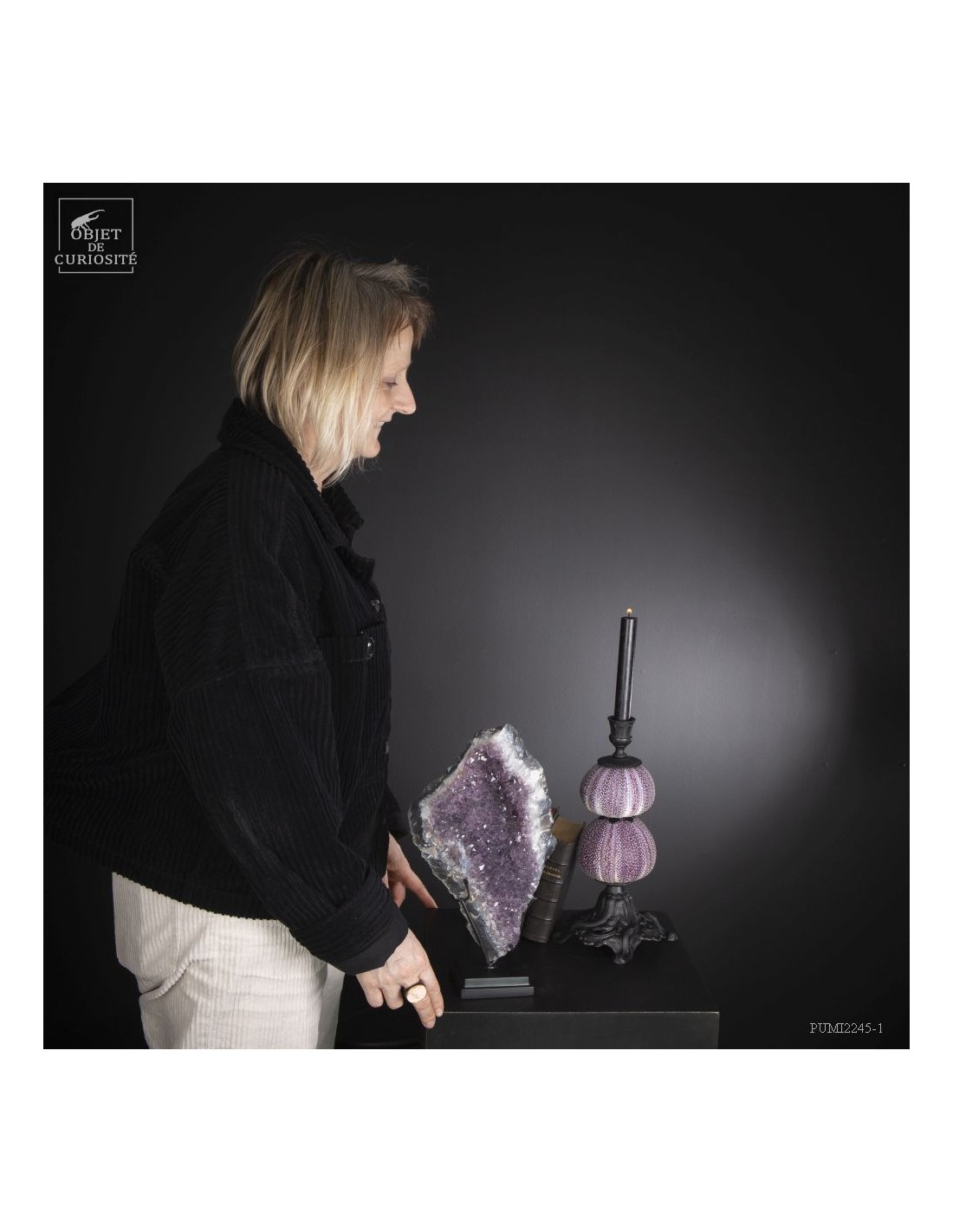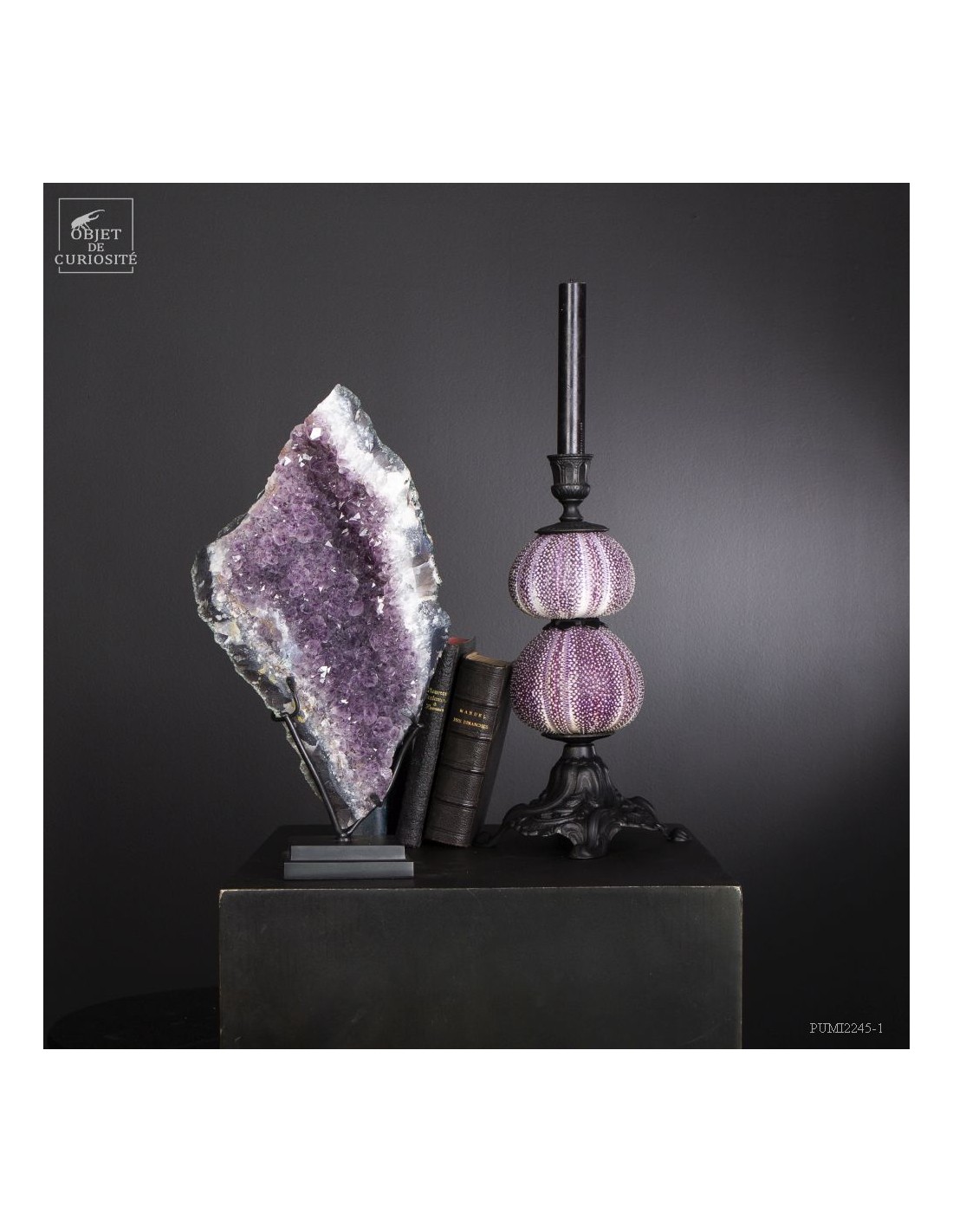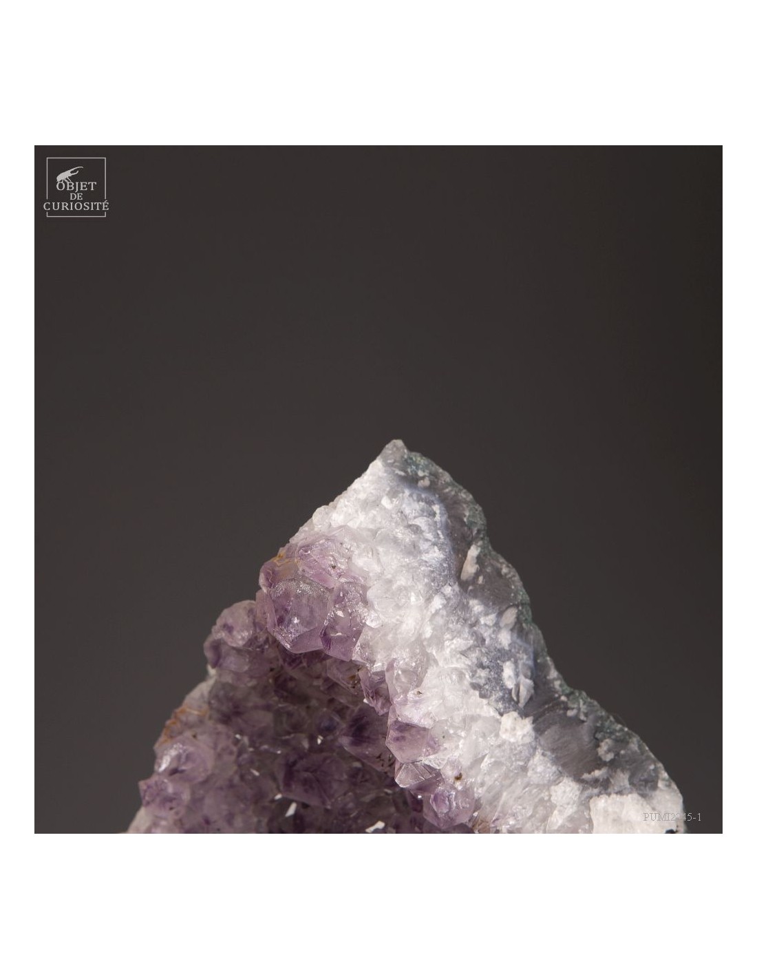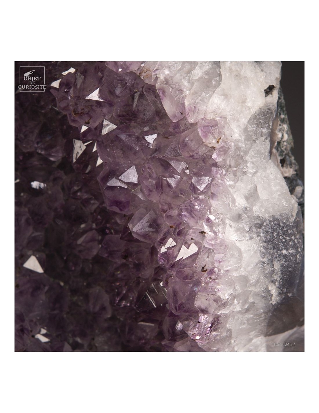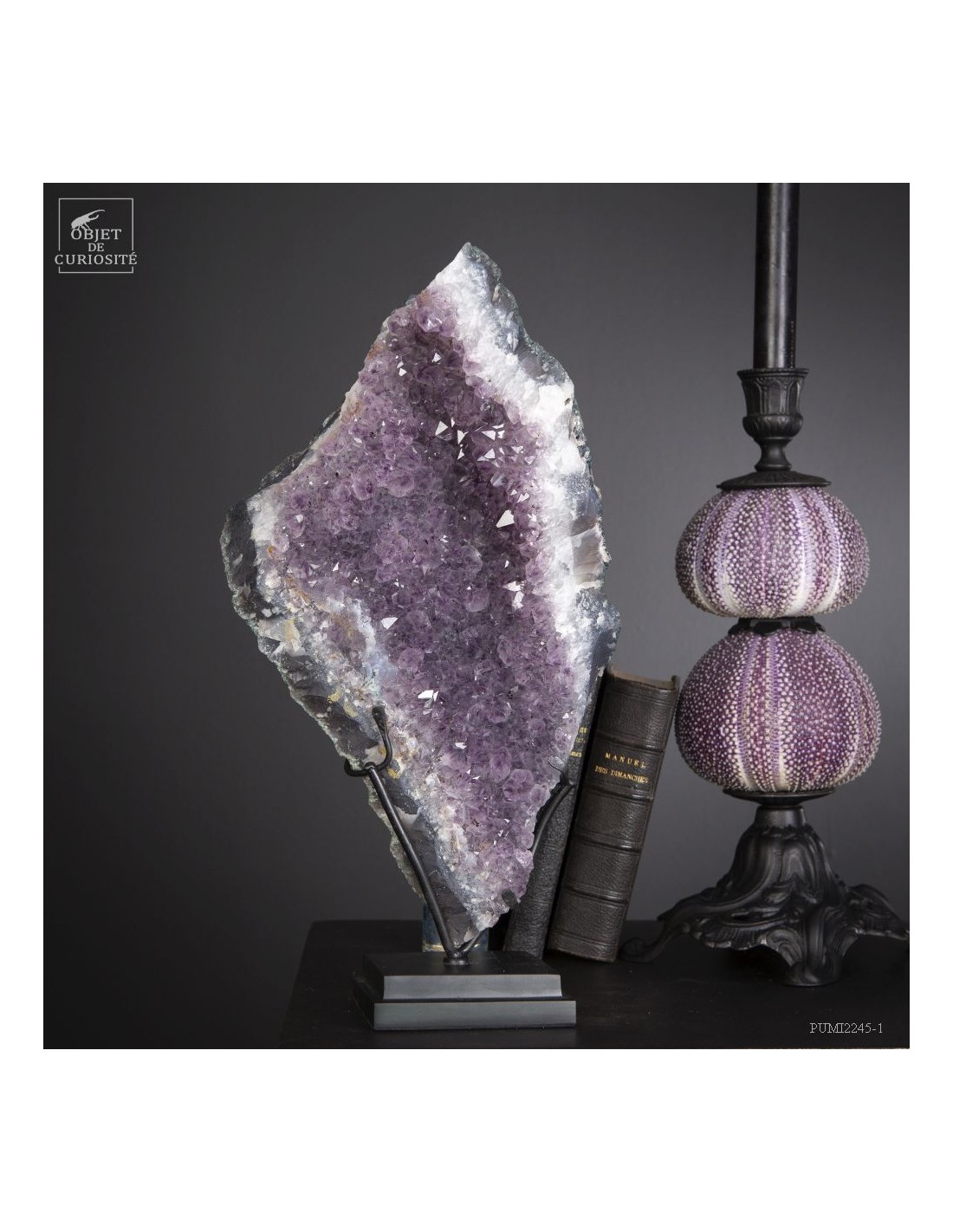 Cette améthyste en plaque du Brésil est en fait une partie d'une géode retrouvée dans sa gangue de Basalte. Très souvent, en essayant de l'extraire de la masse de la lave volcanique où elle a "grandi", les mineurs brisent cette énorme géode. Cette fois, pas de réparation, juste une grande plaque partie, qui montre tout le contraste des cristaux violets avec la gangue de Basalte vert..