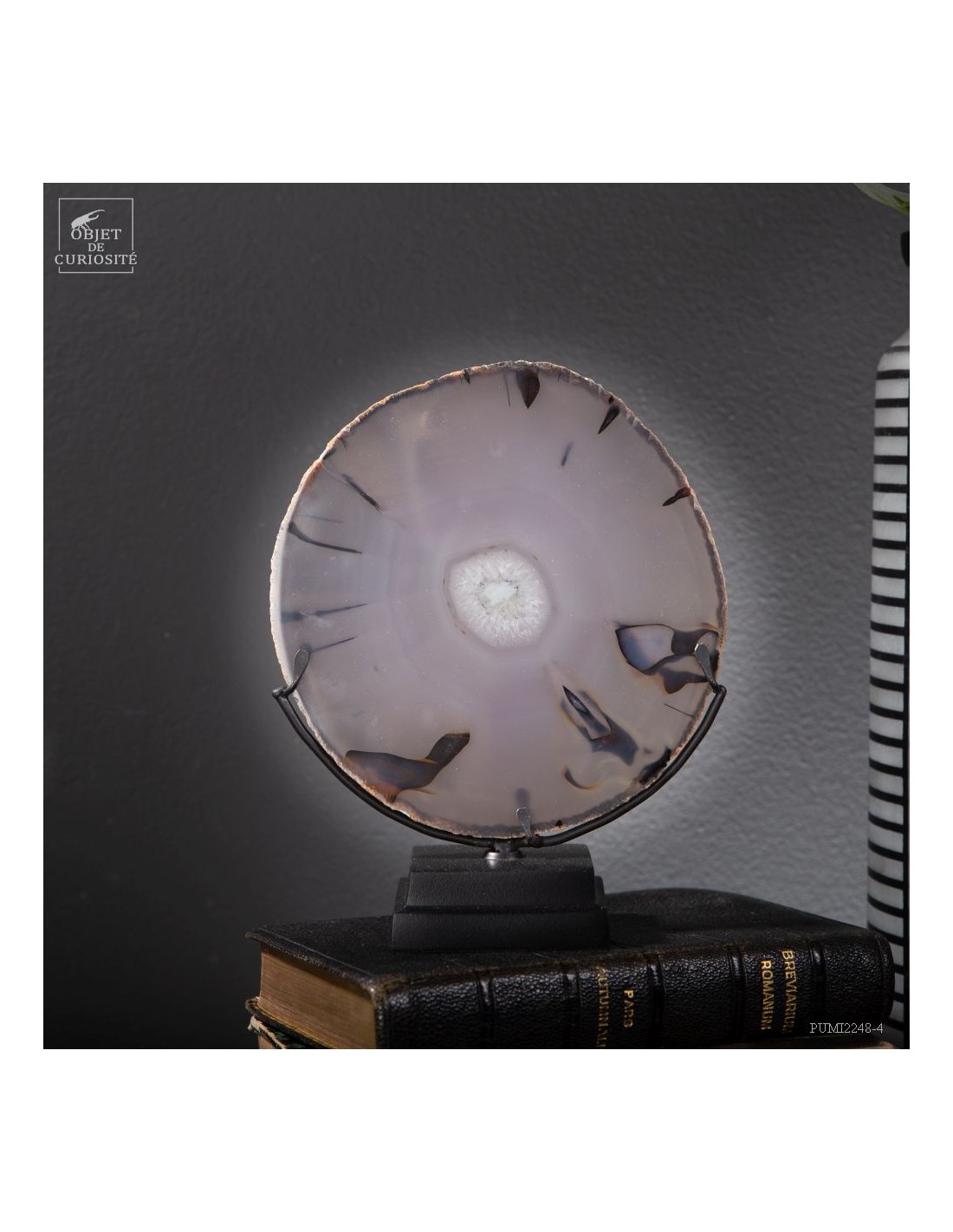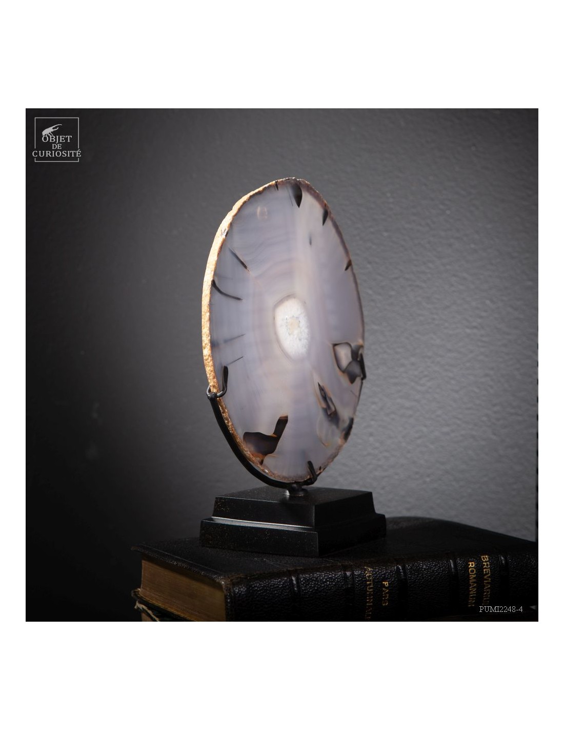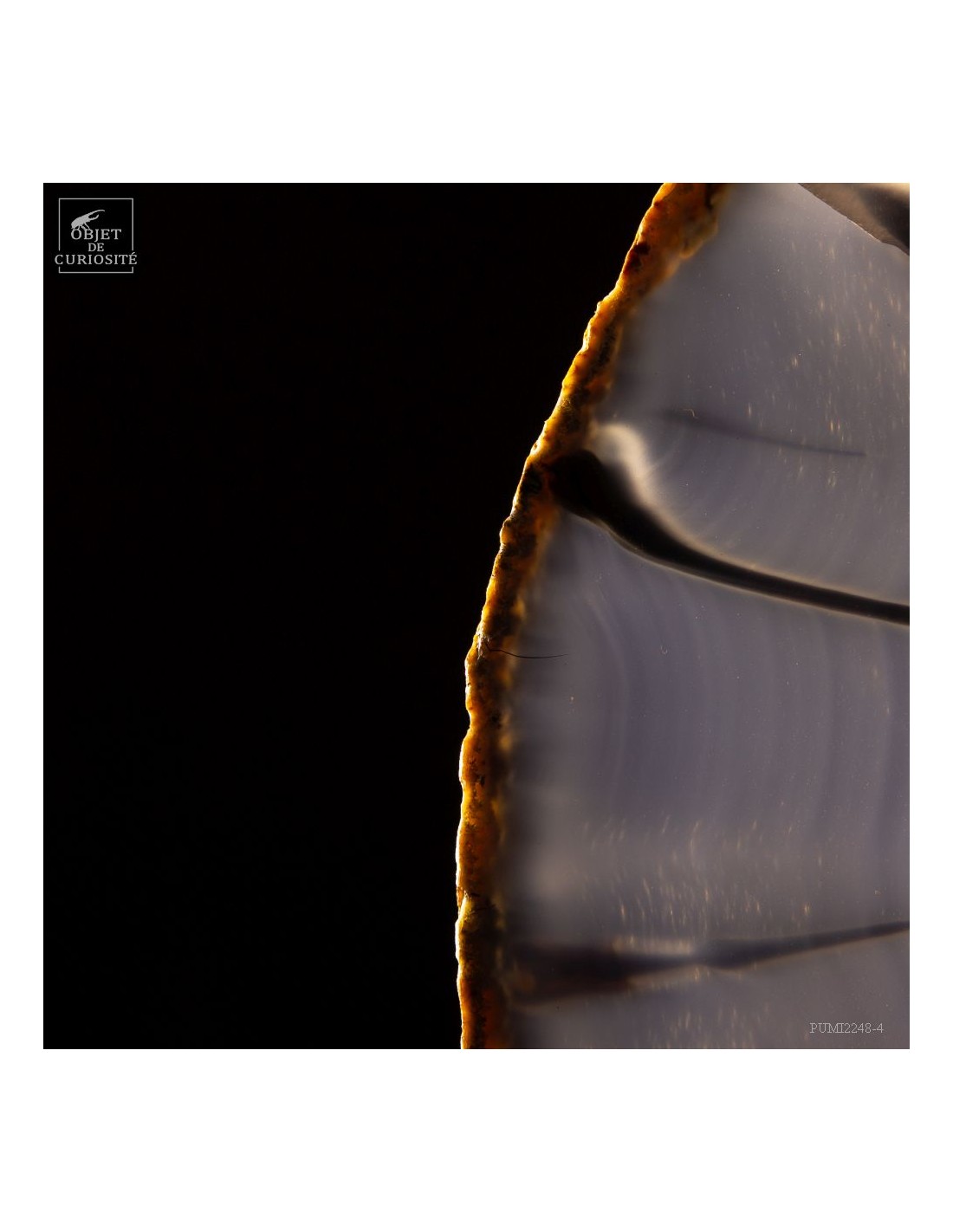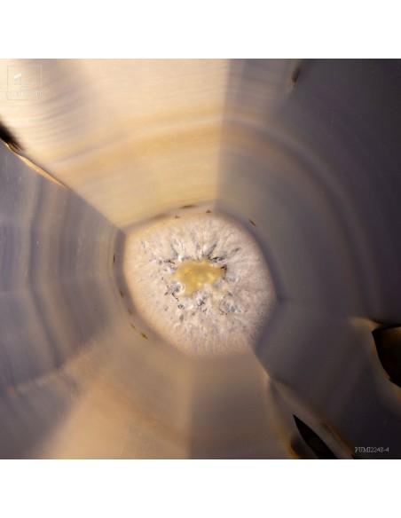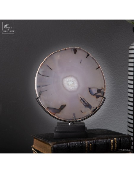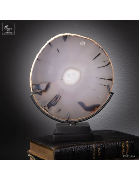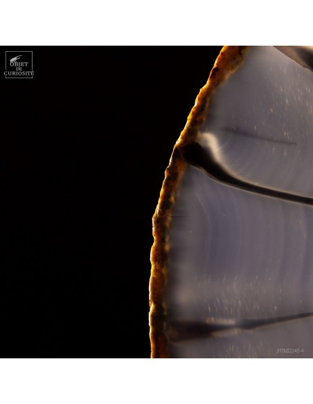 Chaque Agate est différente et celle-ci, diaphane, peut faire penser à un oeil avec la pupille au centre... Taillée en fine tranche, cette agate du Brésil devient translucide, et lorsque la lumière la traverse, elle devient iridescente (photo avec la main). Un œil lumineux.
