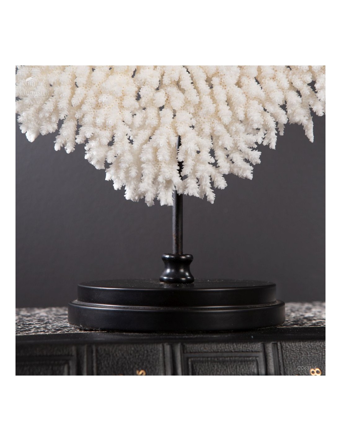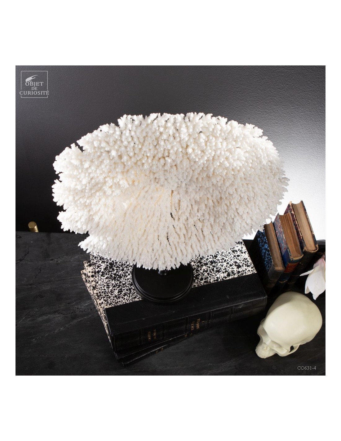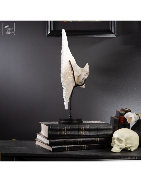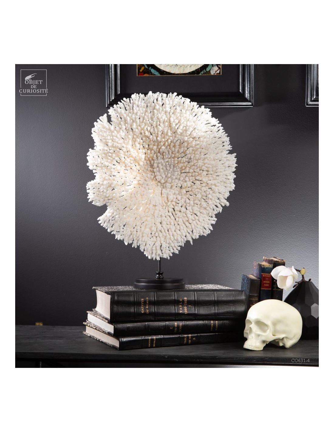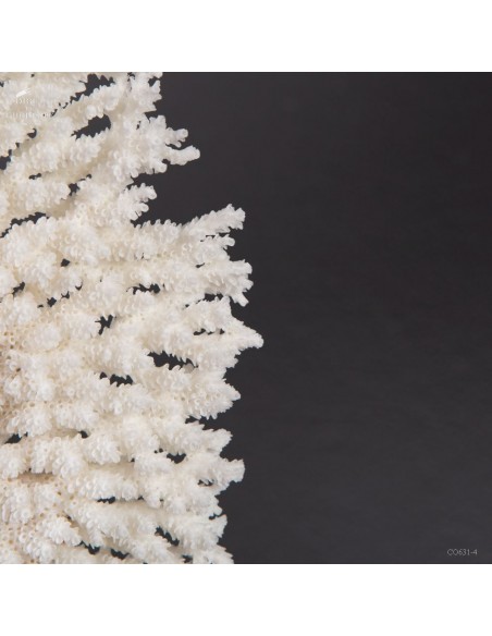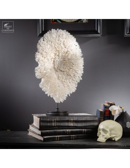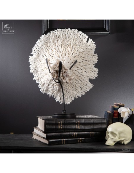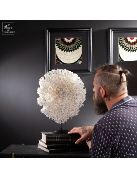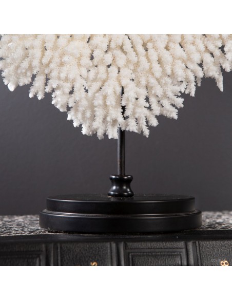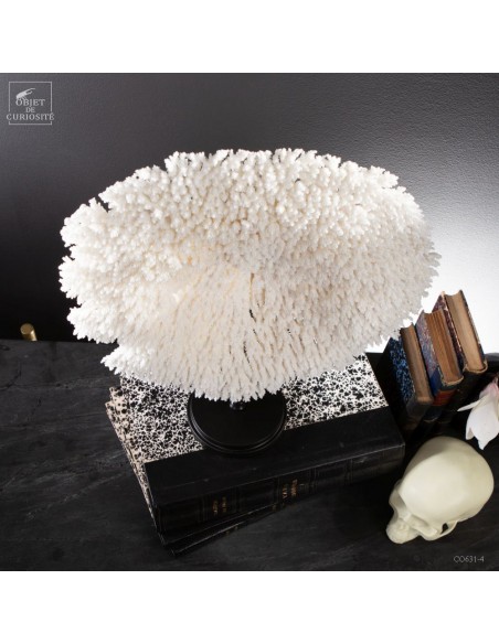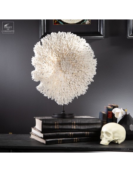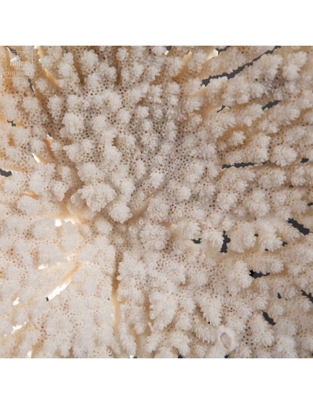 Une couronne blanche d'Acropora Hyacinthus en position verticale. Ce cercle de dentelle blanche délicate est un corail qui a poussé sur les fonds marins des îles Salomon, à l'abri du courant. Bien sûr sa position naturelle sous l'eau est à l'horizontale, mais cette forme solaire lui va tellement bien! Elle vous sera livrée avec son propre numéro CITES, car c'est une espèce à commerce réglementé.