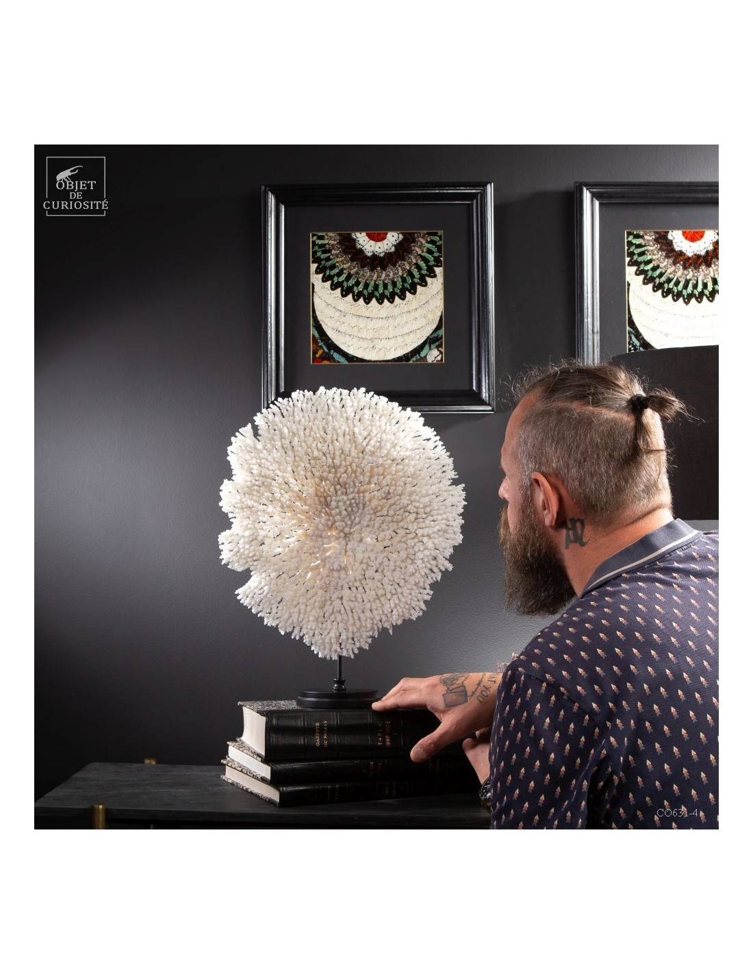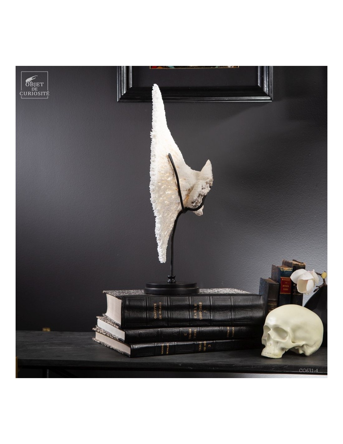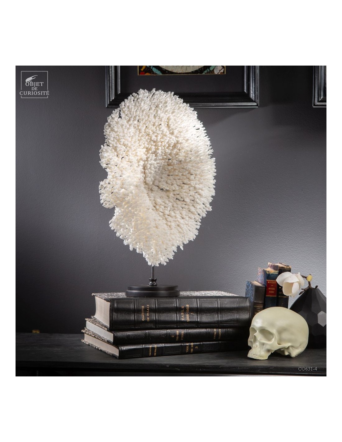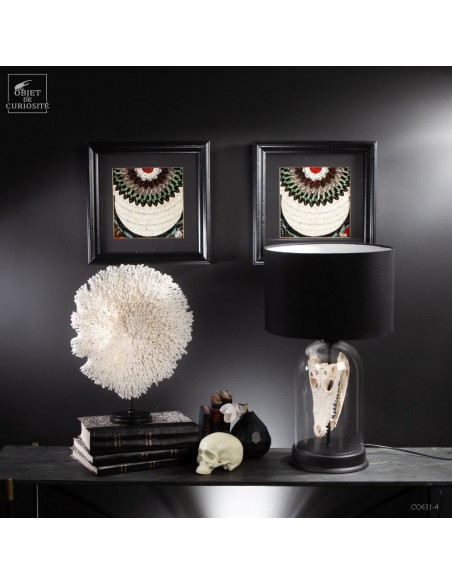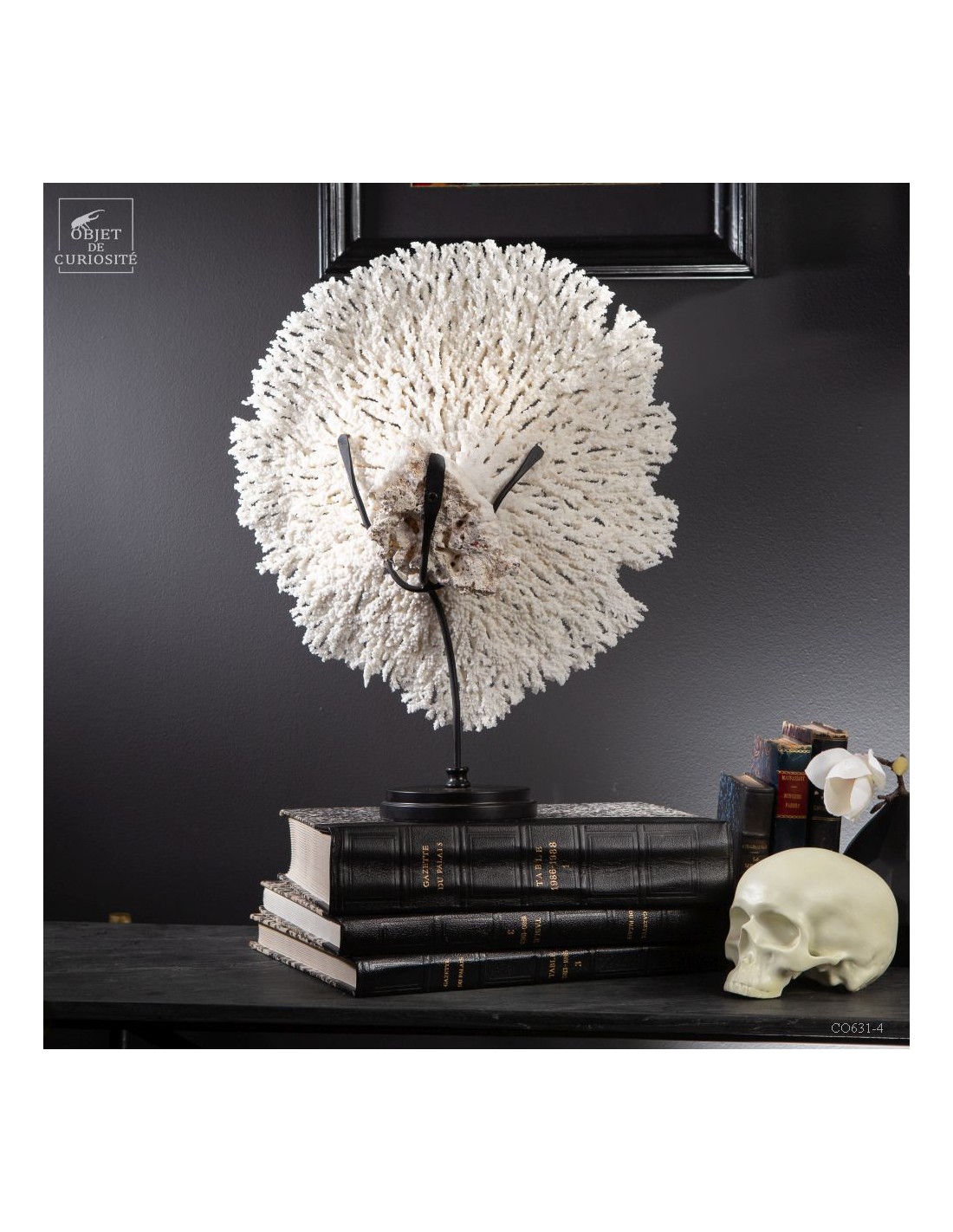 Une couronne blanche d'Acropora Hyacinthus en position verticale. Ce cercle de dentelle blanche délicate est un corail qui a poussé sur les fonds marins des îles Salomon, à l'abri du courant. Bien sûr sa position naturelle sous l'eau est à l'horizontale, mais cette forme solaire lui va tellement bien! Elle vous sera livrée avec son propre numéro CITES, car c'est une espèce à commerce réglementé.