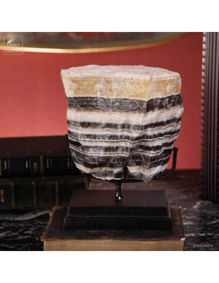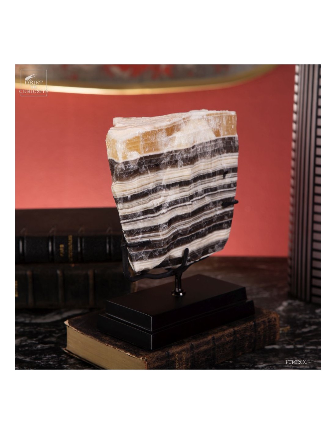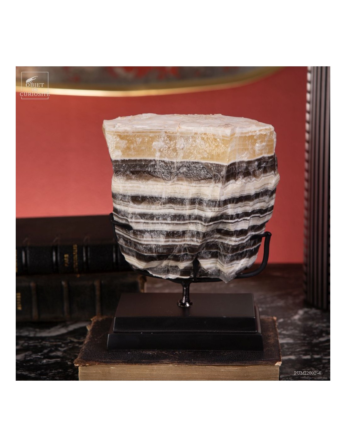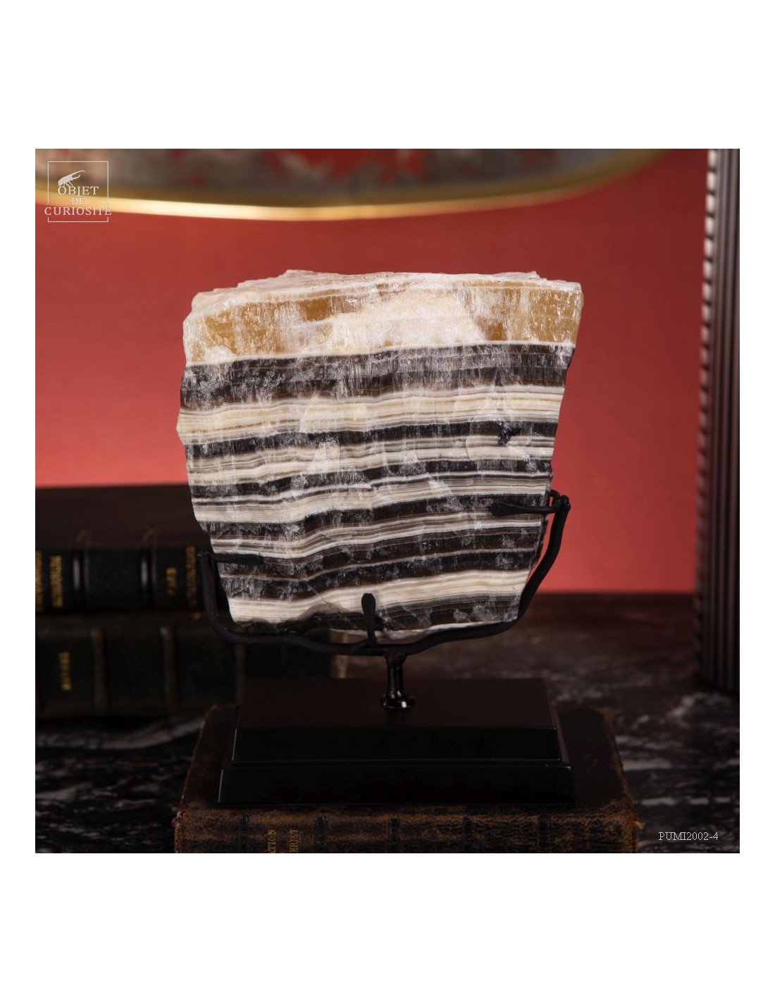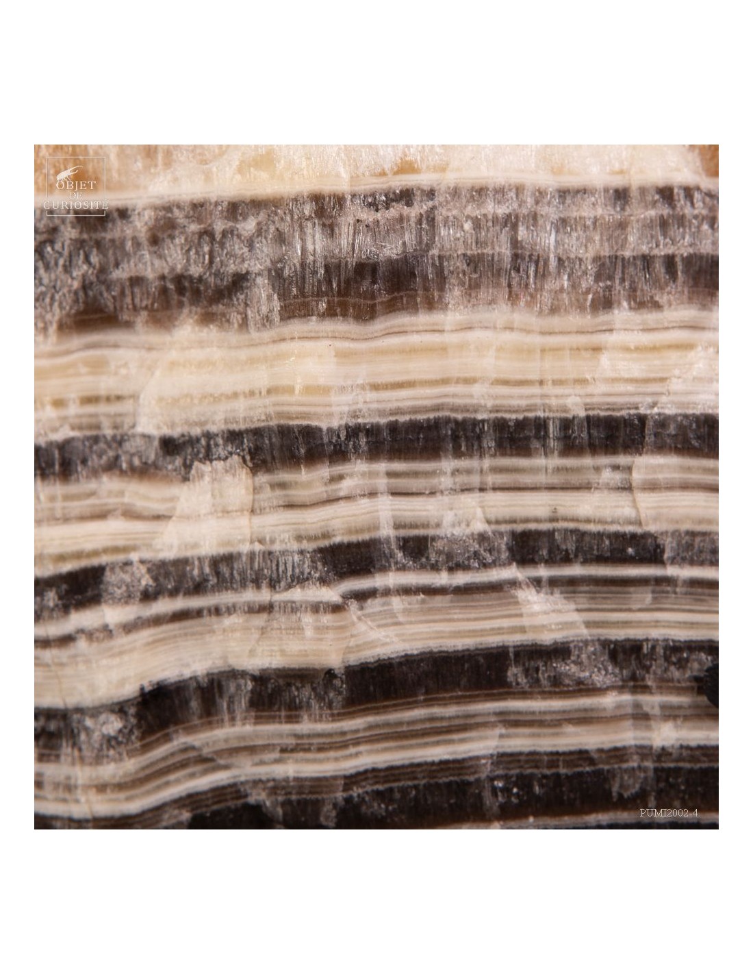 Calcite zebrée de Chihuahua, Mexique. Cette alternance de rayures foncées et presque blanches est dû aux minéraux dissous dans le Carbonate de Calcium (CaCO3) qui constitue la Calcite. La forme transparente est la couleur naturelle de la Calcite. Comme la Calcite optique (MI058). Ici nous avons sélectionné unique ment celles qui alternent la forme blanche et une forme teintée de Manganèse, qui la rend noire. Le nom de zebré est donc parfaitement mérité!