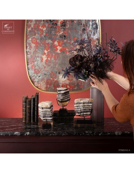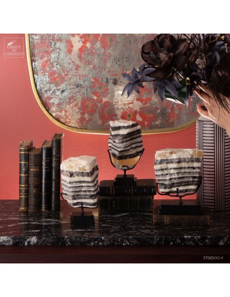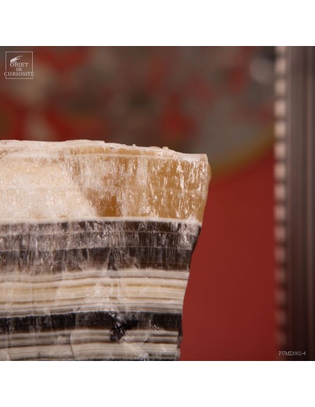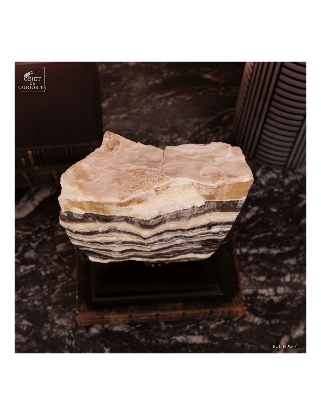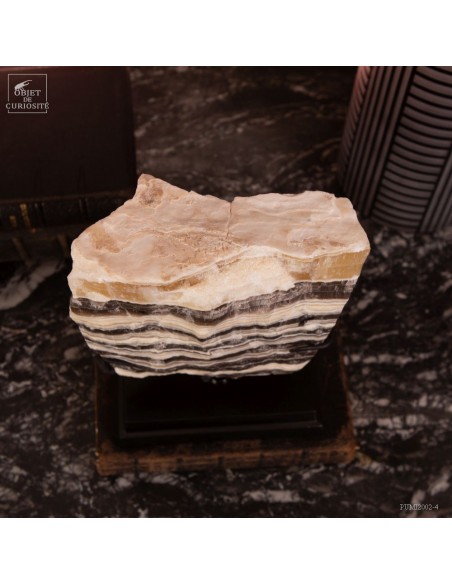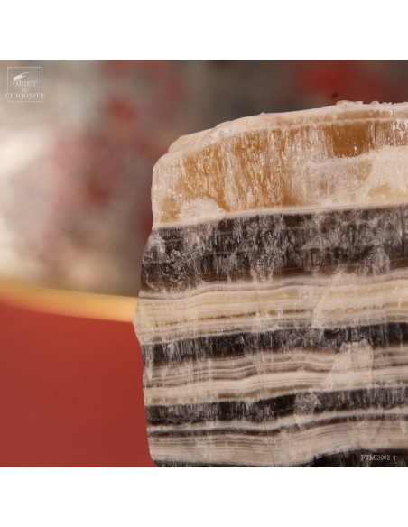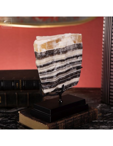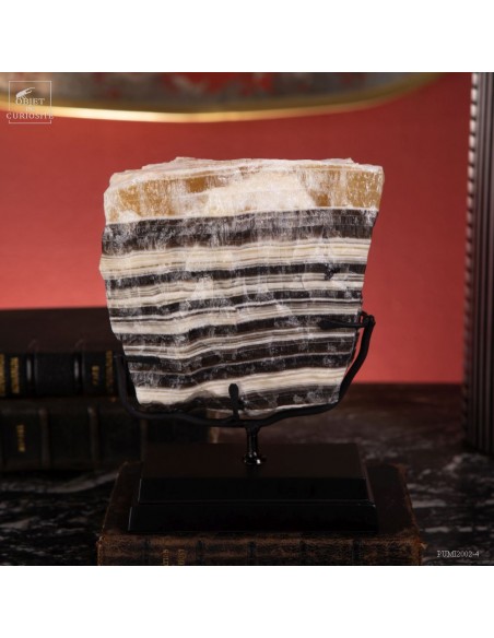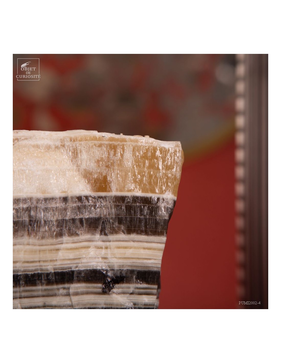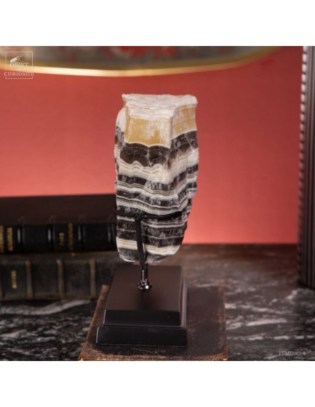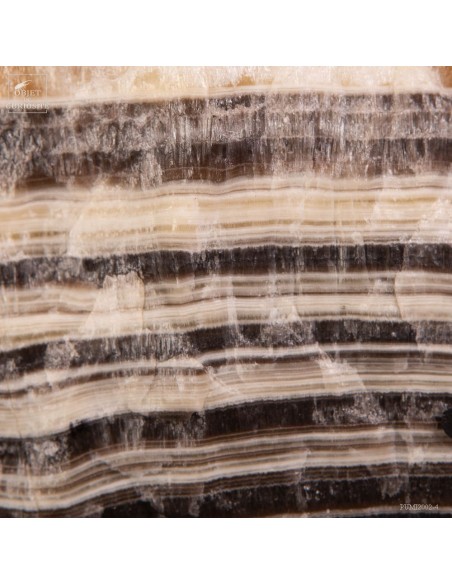 Calcite zebrée de Chihuahua, Mexique. Cette alternance de rayures foncées et presque blanches est dû aux minéraux dissous dans le Carbonate de Calcium (CaCO3) qui constitue la Calcite. La forme transparente est la couleur naturelle de la Calcite. Comme la Calcite optique (MI058). Ici nous avons sélectionné unique ment celles qui alternent la forme blanche et une forme teintée de Manganèse, qui la rend noire. Le nom de zebré est donc parfaitement mérité!