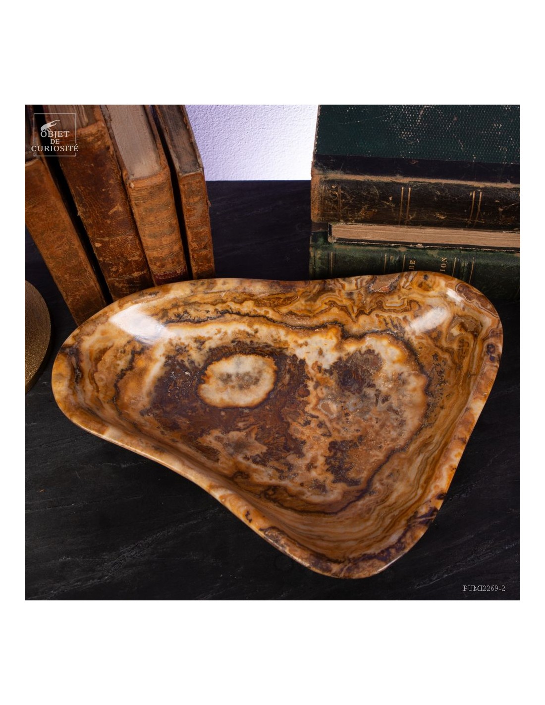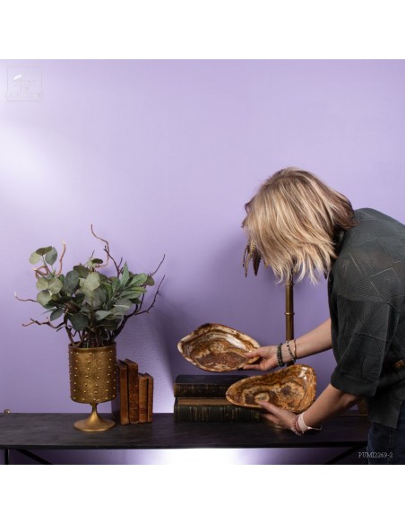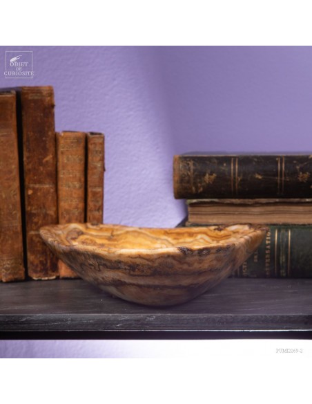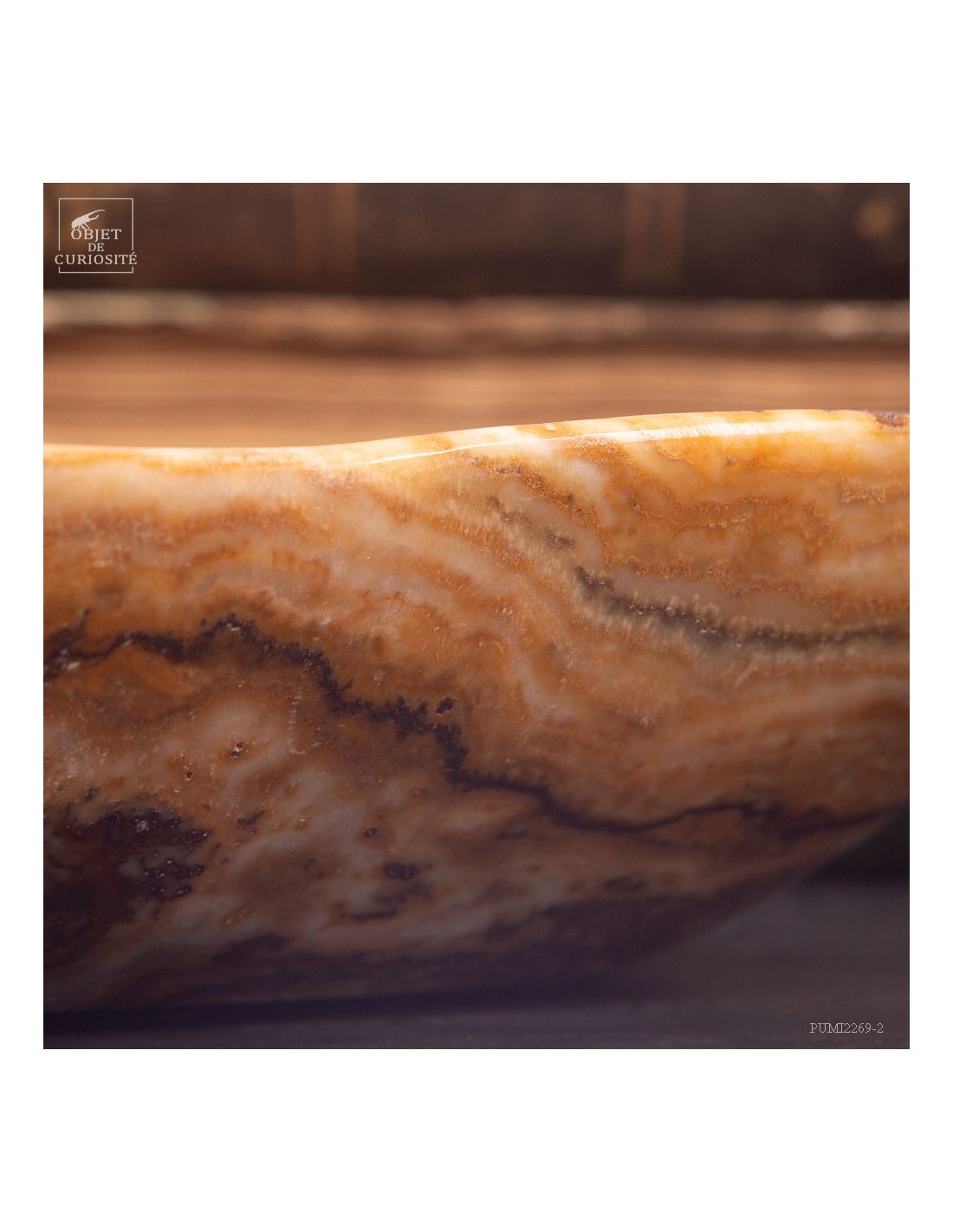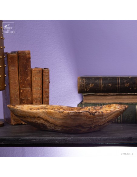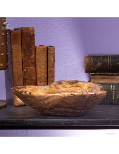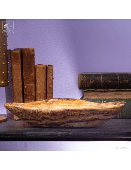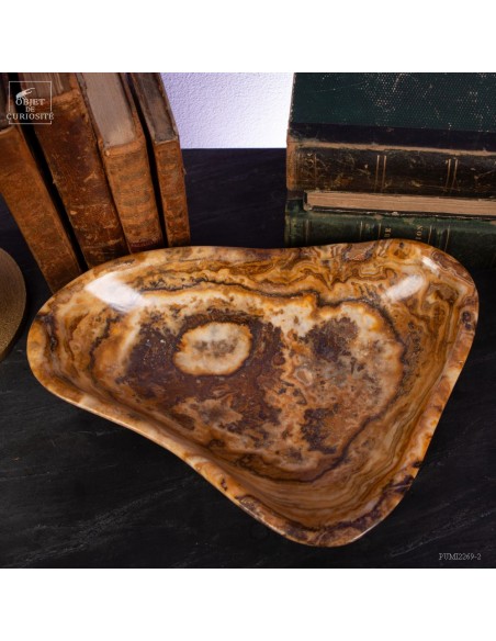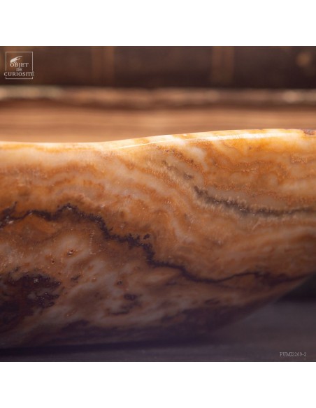 Ce plat de forme libre est d'une belle couleur ambrée. Il vient du Maroc et est en Aragonite. C'est en tout cas sous ce nom que nous l'avons découvert en 2022. Il s'agit donc d'une variété de Calcite à bandes qui reprend exactement les couleurs de la célèbre Aragonite Marocaine qui , elle, se présente sous forme de cristaux tabulaires qui poussent dans toutes les directions. Un artisan Marocain de Sefrou s'est inspiré des formes taillées par les Mexicains dans de la Fluorite.
