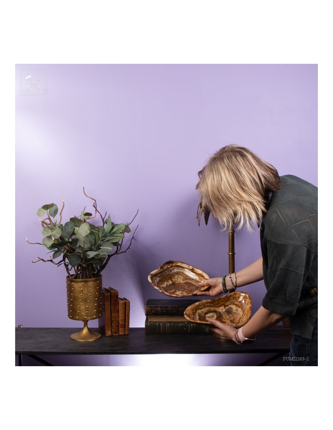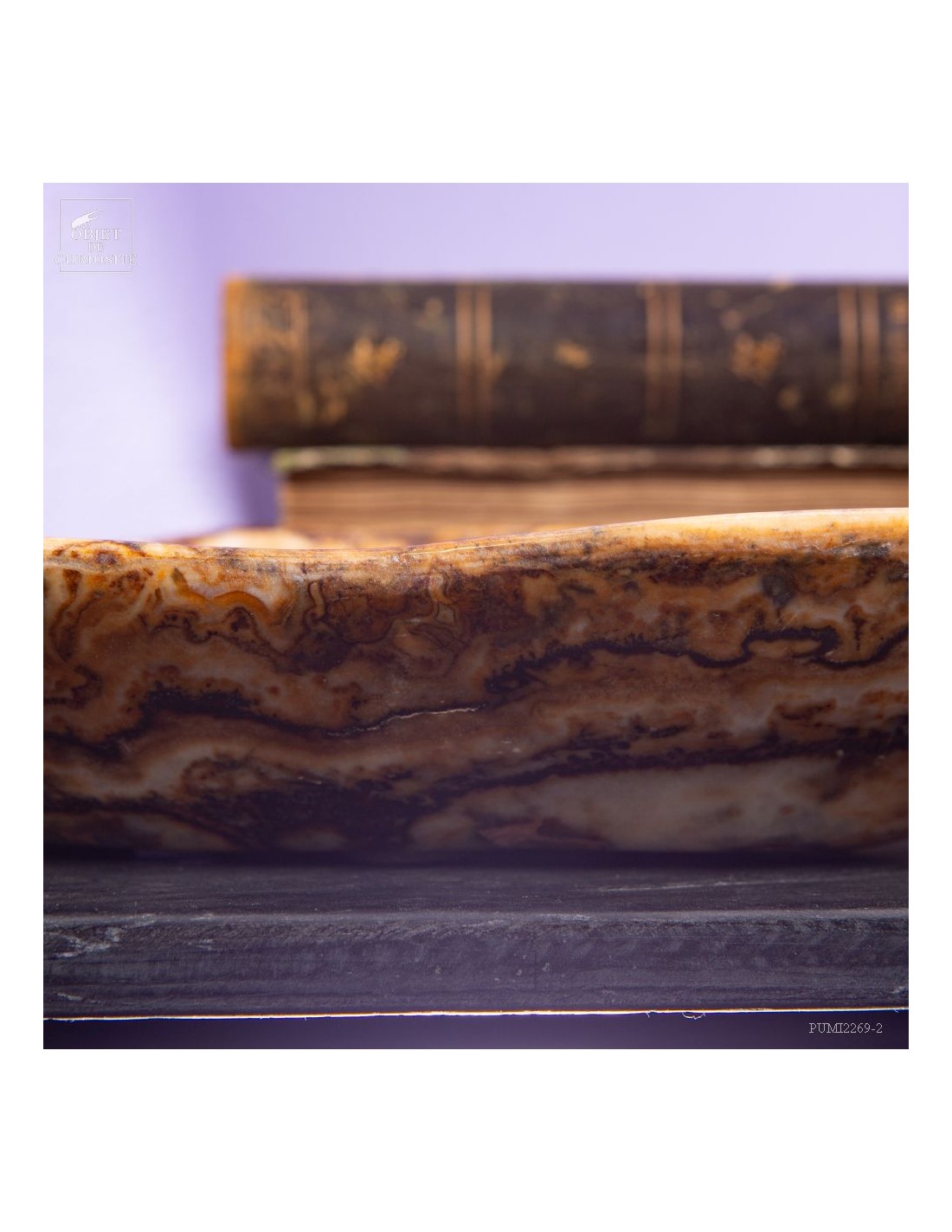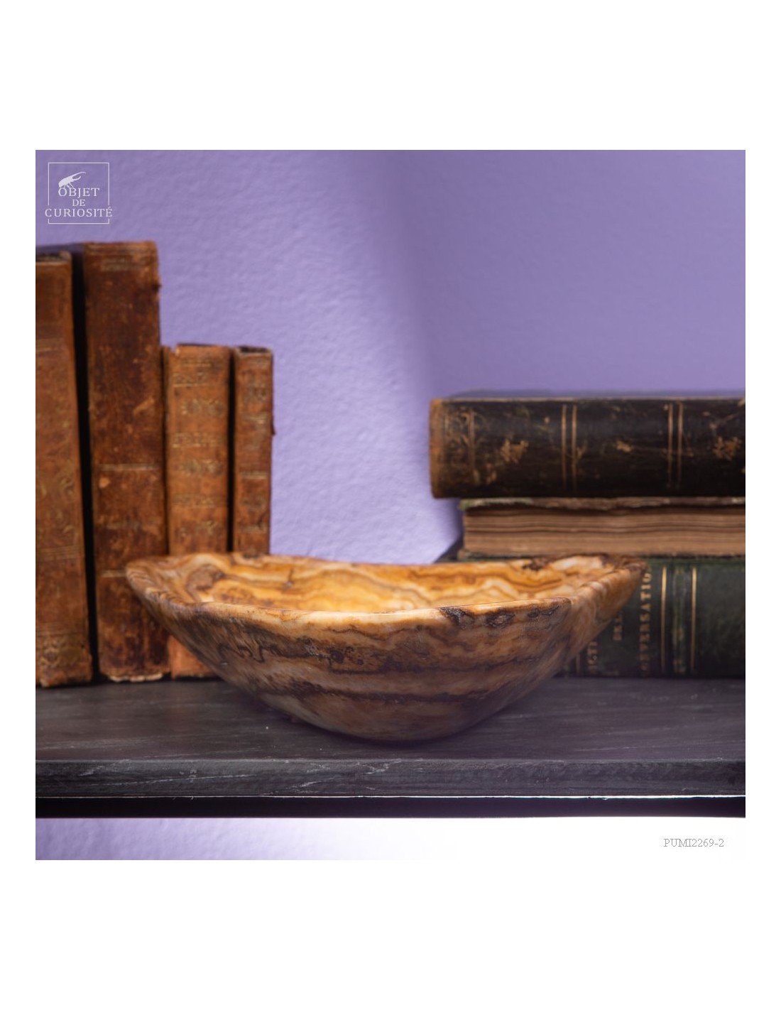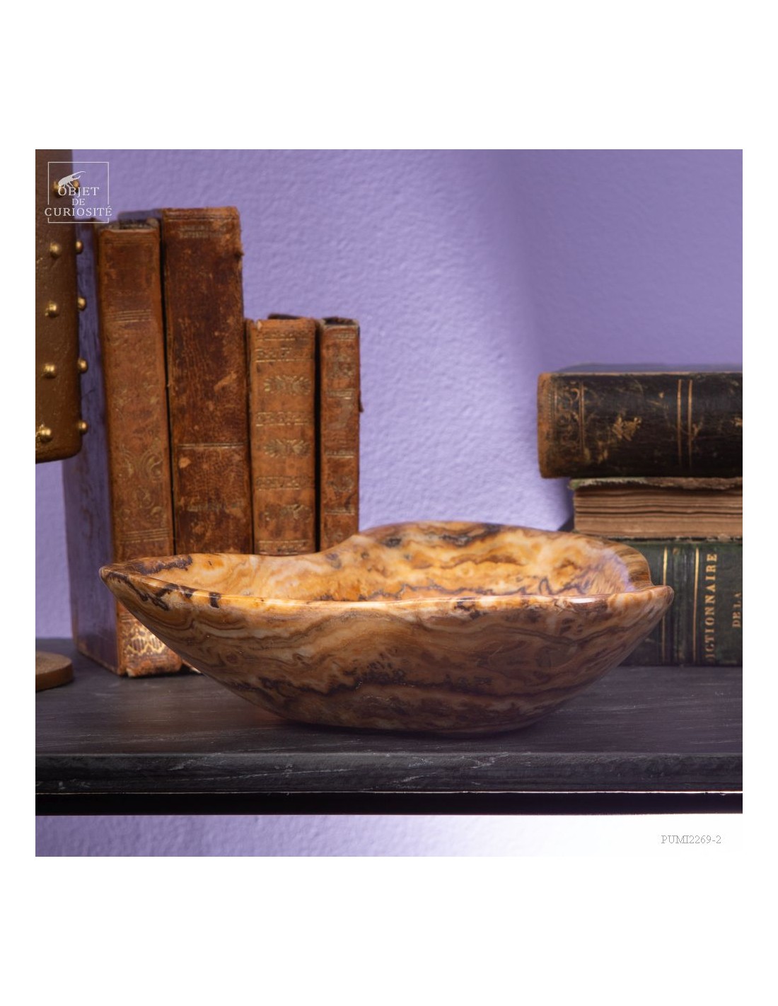 Ce plat de forme libre est d'une belle couleur ambrée. Il vient du Maroc et est en Aragonite. C'est en tout cas sous ce nom que nous l'avons découvert en 2022. Il s'agit donc d'une variété de Calcite à bandes qui reprend exactement les couleurs de la célèbre Aragonite Marocaine qui , elle, se présente sous forme de cristaux tabulaires qui poussent dans toutes les directions. Un artisan Marocain de Sefrou s'est inspiré des formes taillées par les Mexicains dans de la Fluorite.