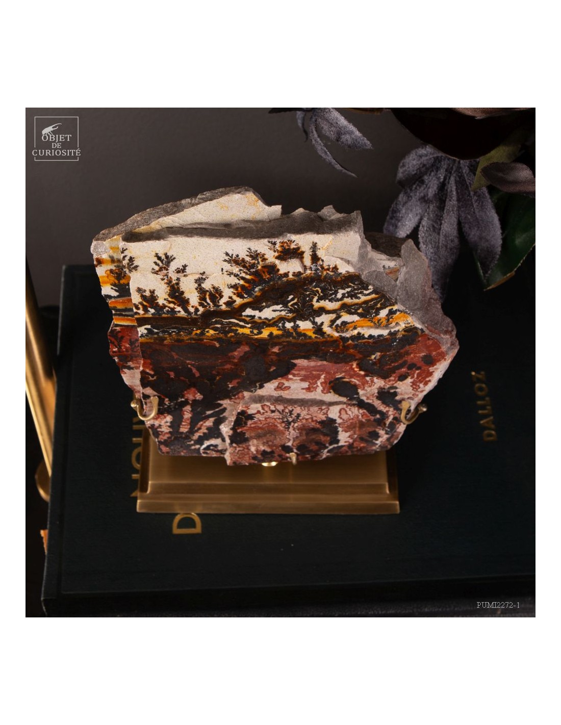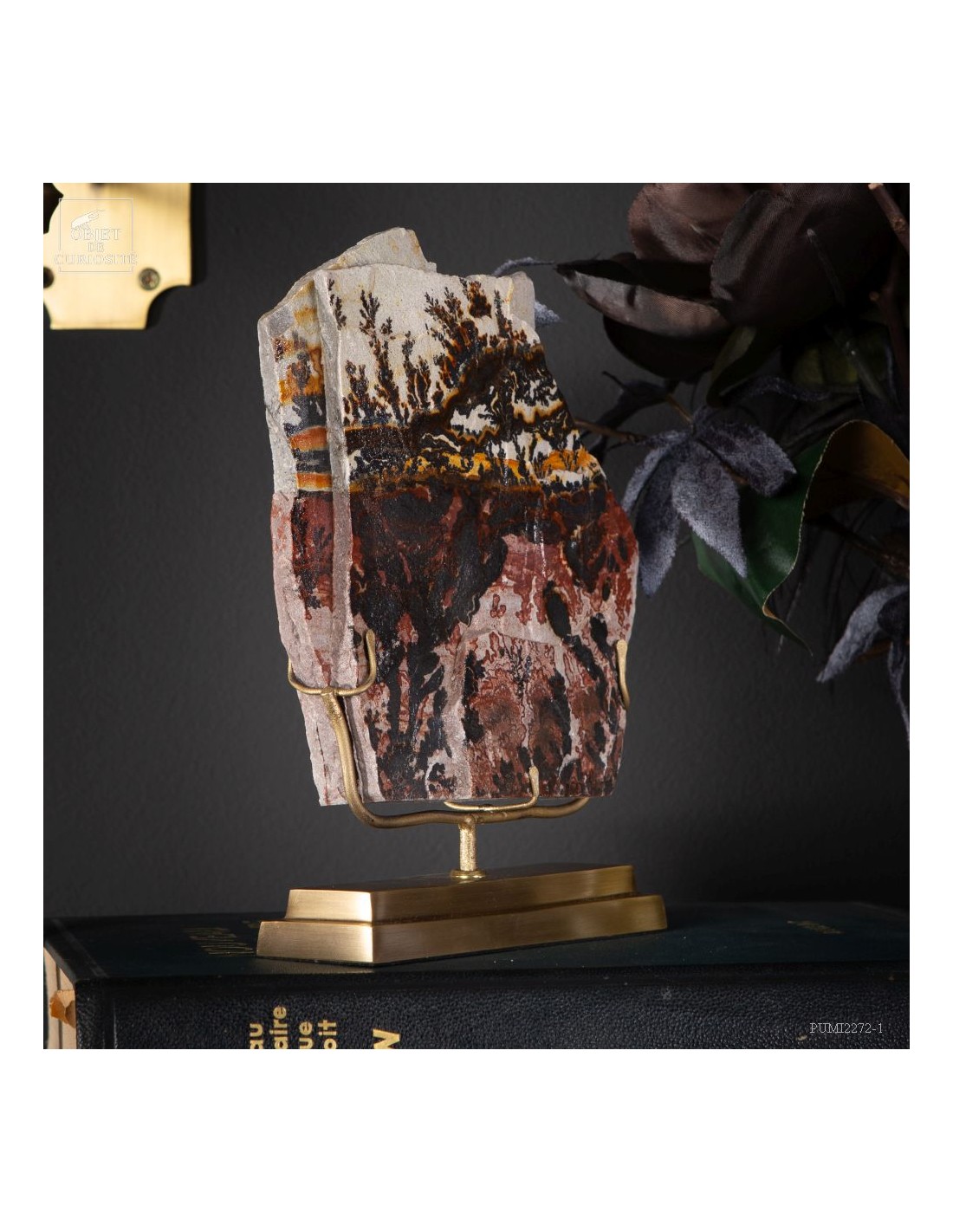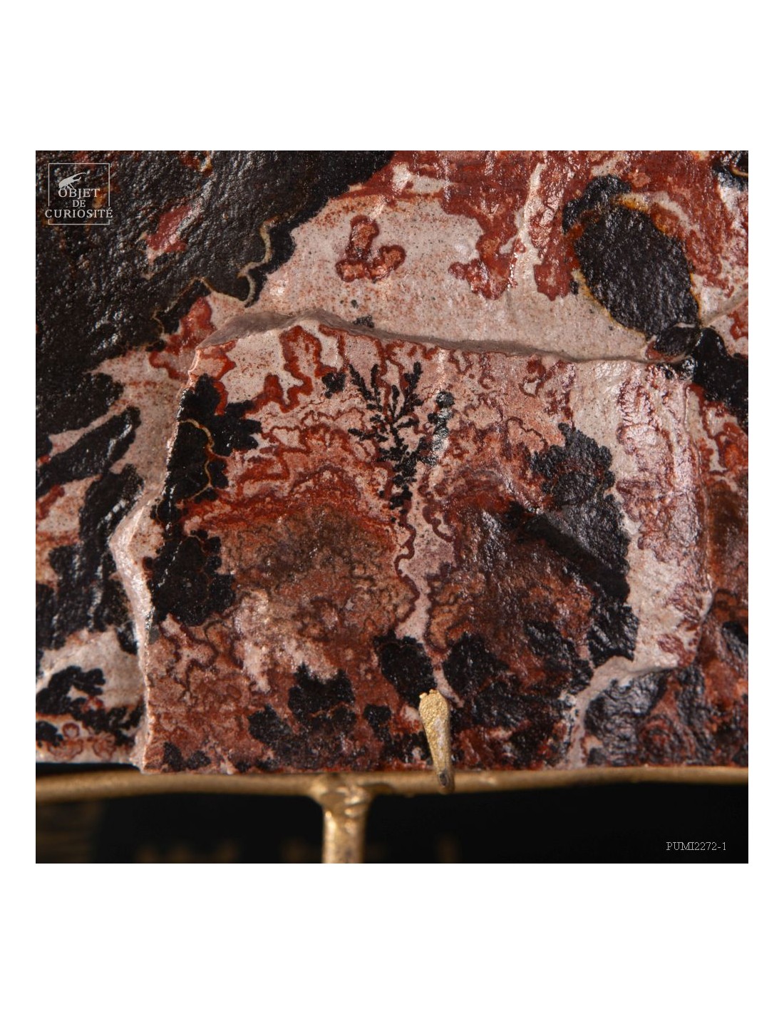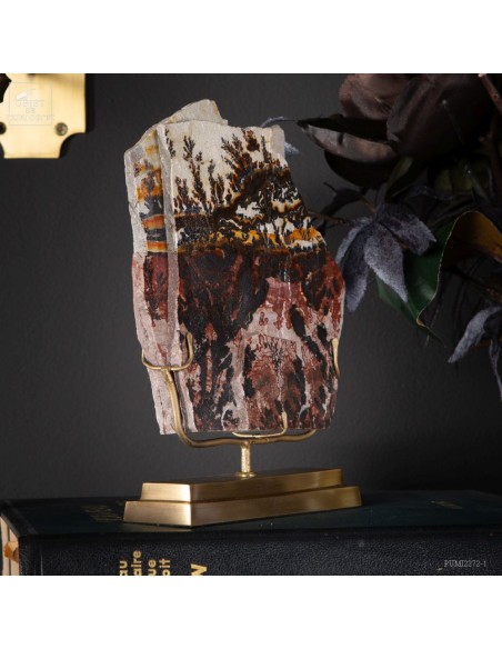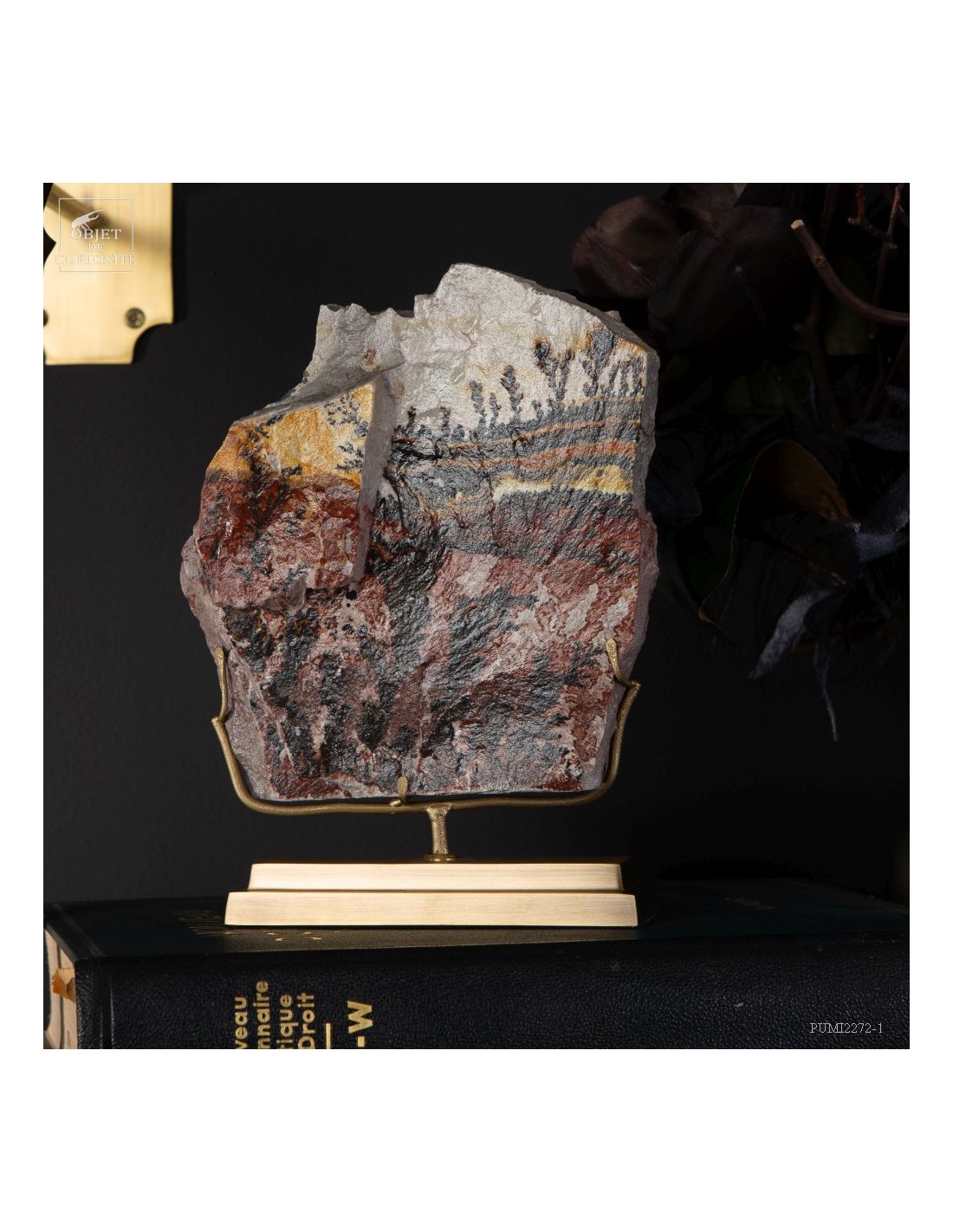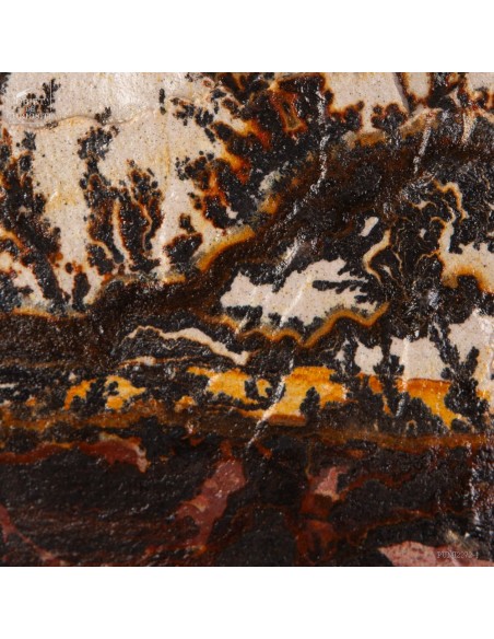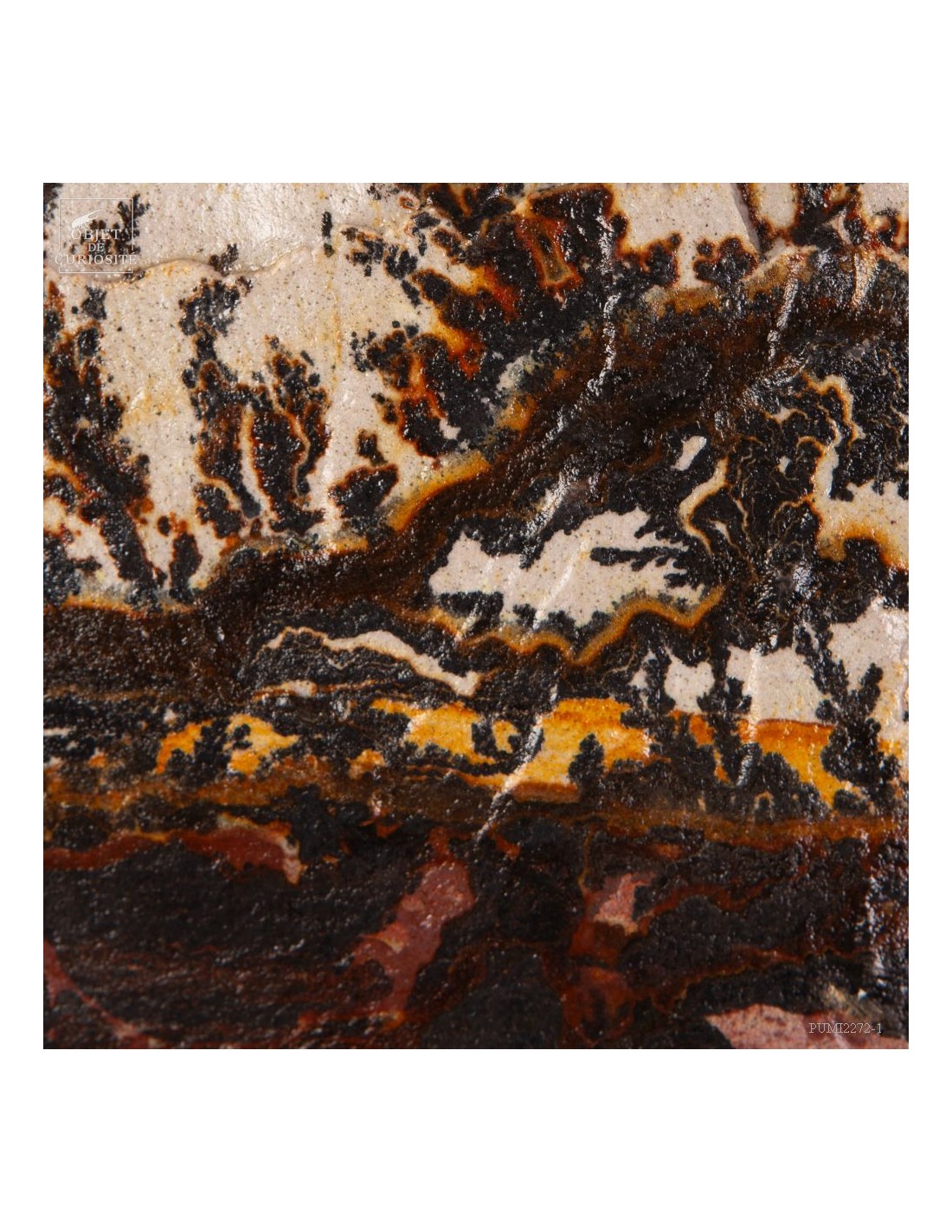 Cette explosion de couleurs fait penser à une fresque rupestre réalisée par des Homo Sapiens avec des ocres et des pigments naturels au fond d'une grotte. Mais ces couleurs sont bien naturelles et ont été découvertes au centre des Etats Unis, en Utah. La beauté de cette pierre vient des inclusions de manganèse qui ont suivi des micro-fissures: la Dendrite. Ces formes presque végétales sont donc une cristallisation unique de Manganèse. Ce Jaspe s'est formé par circulation hydrothermale des sédiments riches en silice parmi les coulées d'un volcan.