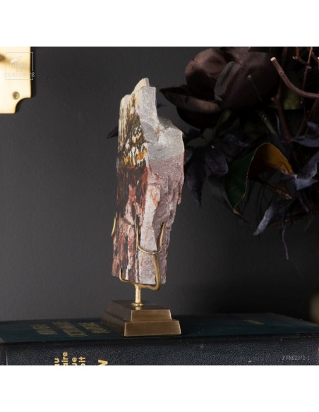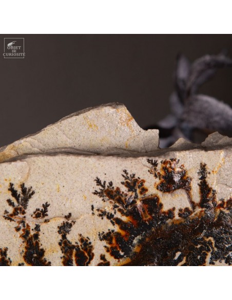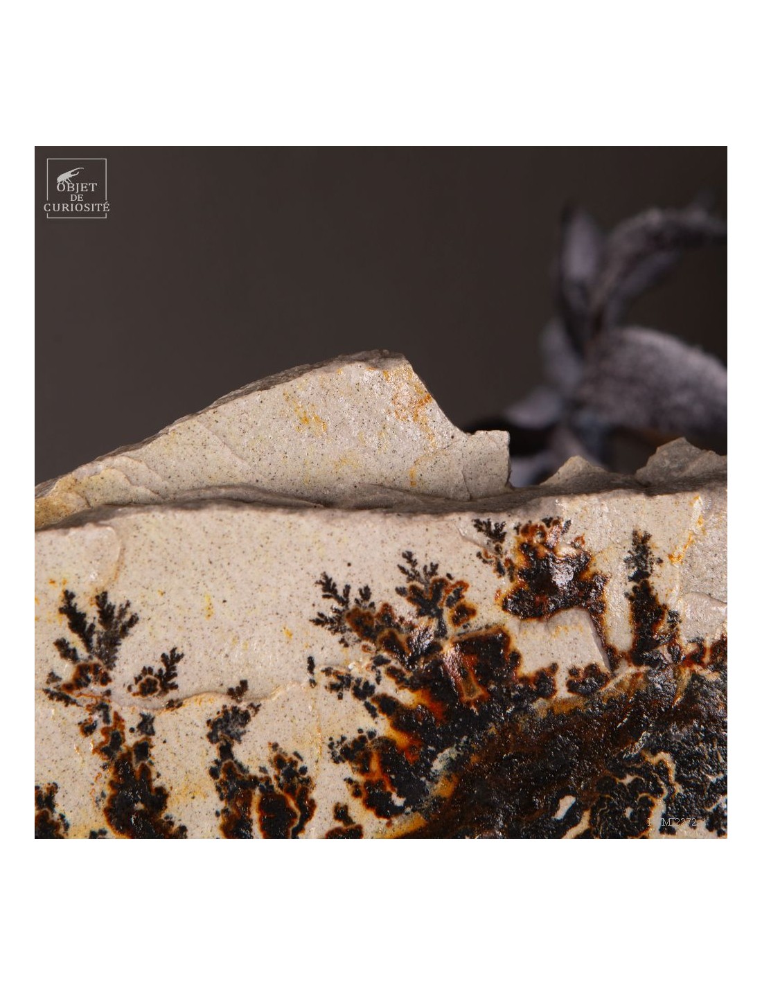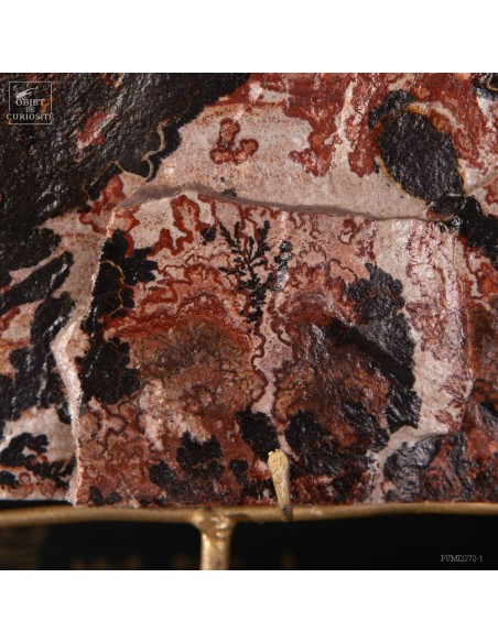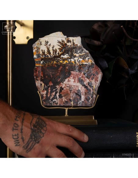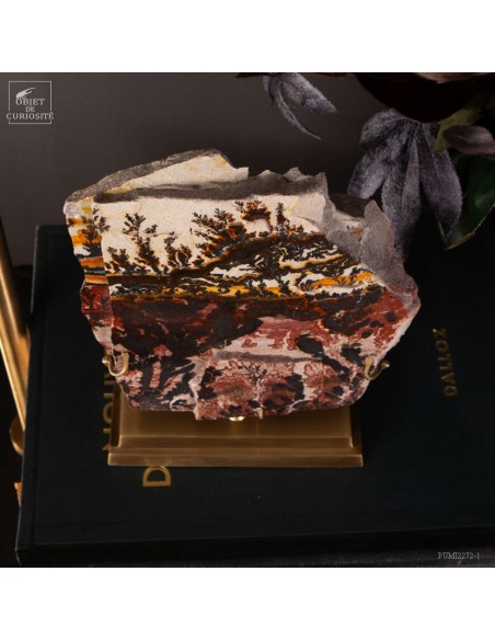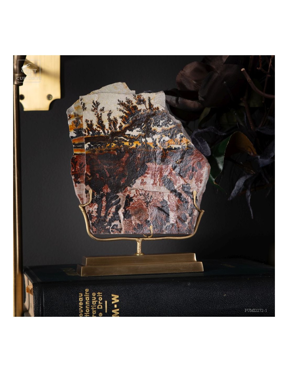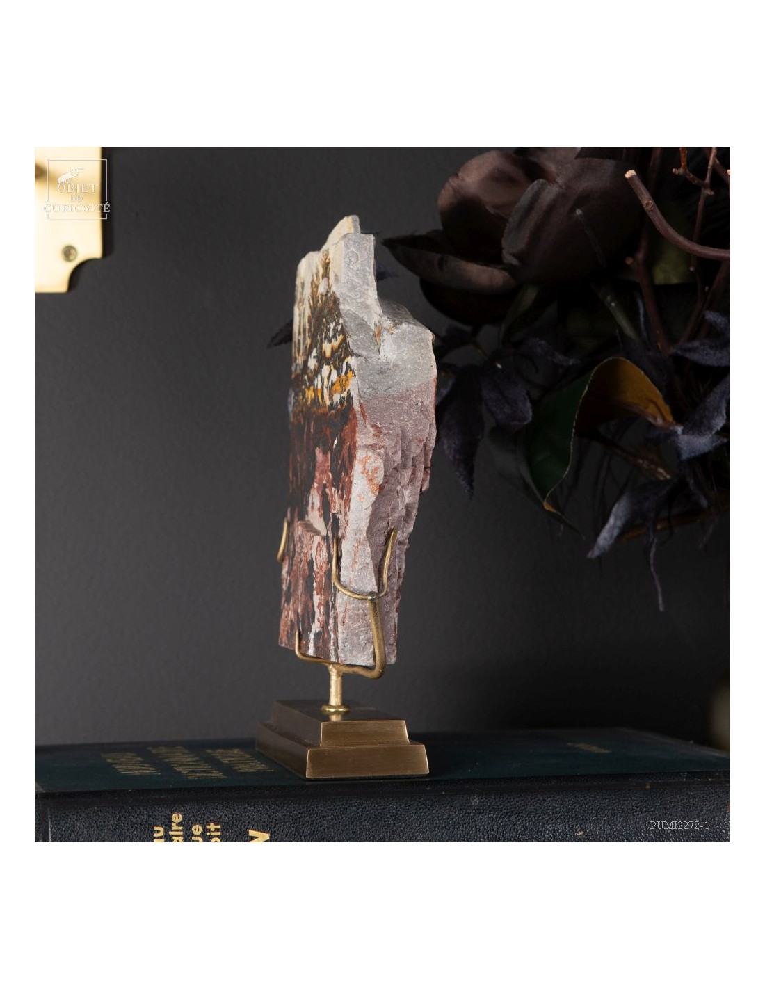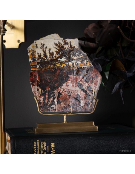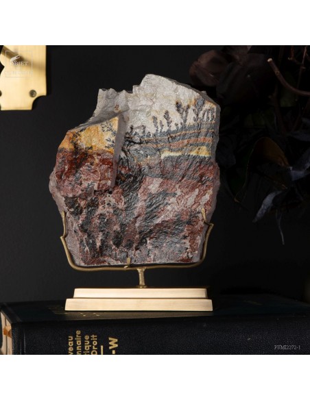 Cette explosion de couleurs fait penser à une fresque rupestre réalisée par des Homo Sapiens avec des ocres et des pigments naturels au fond d'une grotte. Mais ces couleurs sont bien naturelles et ont été découvertes au centre des Etats Unis, en Utah. La beauté de cette pierre vient des inclusions de manganèse qui ont suivi des micro-fissures: la Dendrite. Ces formes presque végétales sont donc une cristallisation unique de Manganèse. Ce Jaspe s'est formé par circulation hydrothermale des sédiments riches en silice parmi les coulées d'un volcan.