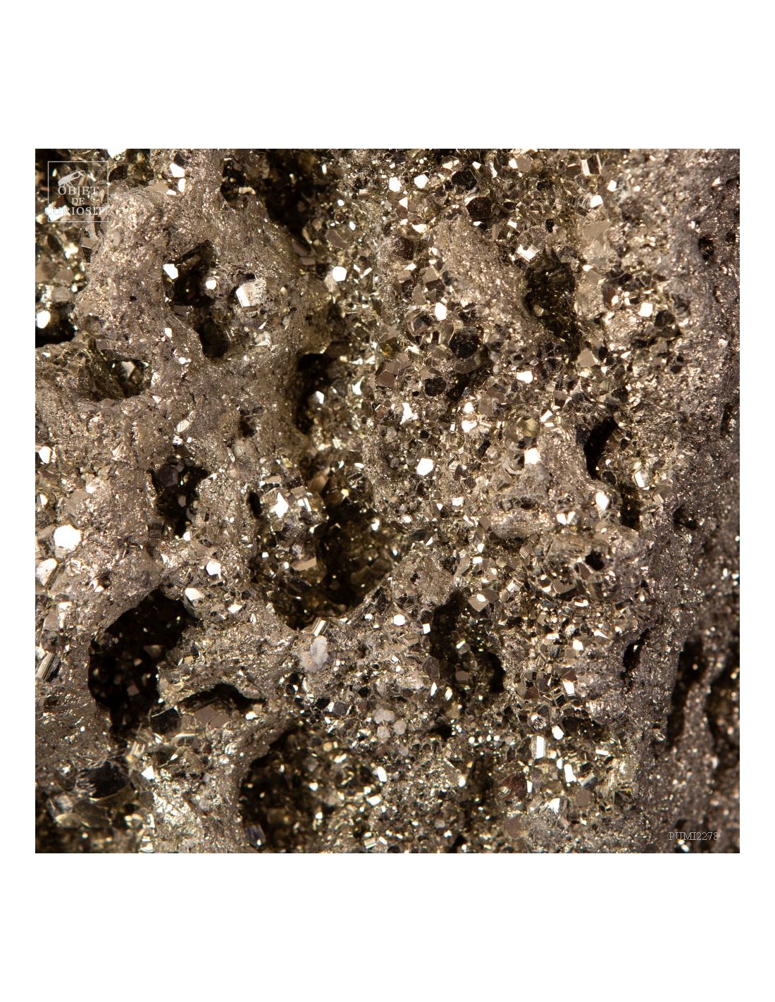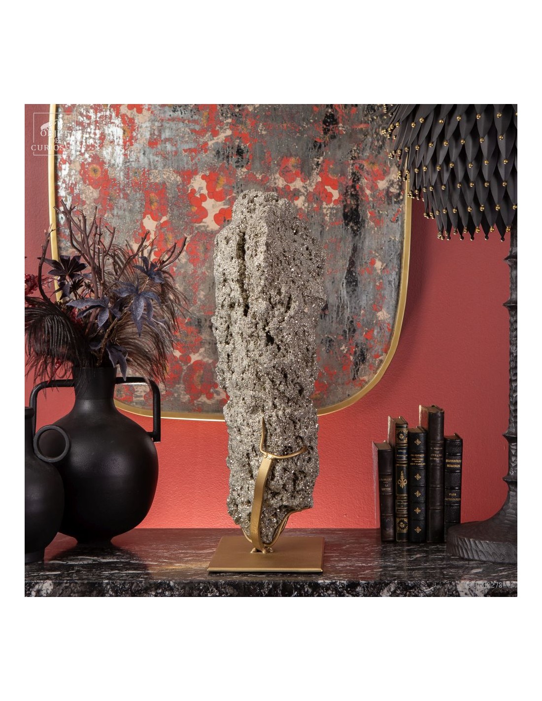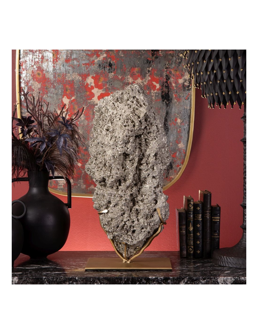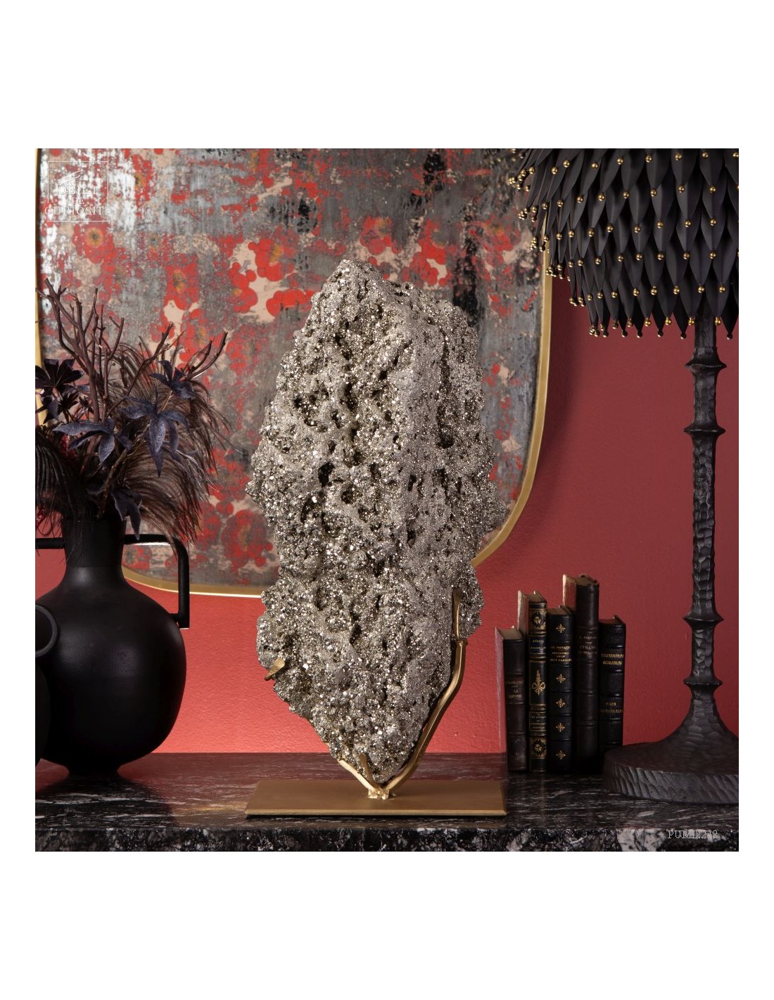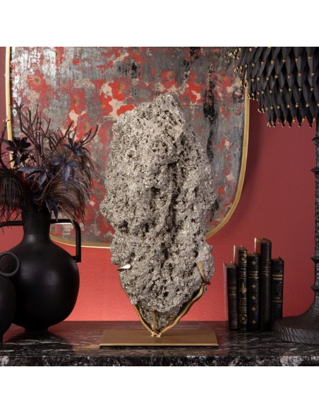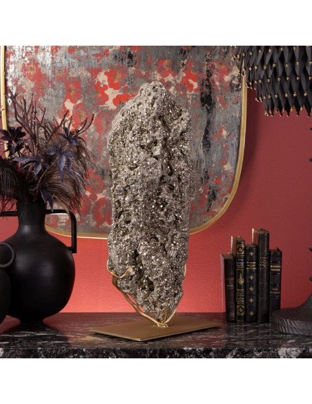 Bien sûr, avec 50cm de Haut, cette Pyrite ne pouvait pas être légère. Ce métal naturellement doré est un bloc constitué de centaine de milliers de magnifiques cristaux dodécaédriques (à douze faces), qui portent même le nom de Pyritoèdres. Ce minéral de 30 Kg vient du Pérou. Les petits cristaux sont parfois soudés entre eux, parfois nettement détachés, créant même de petites "grottes" entièrement dorées. La pyrite est un minéral composé de sulfure de fer (FeS₂) et est souvent appelée "l'or des fous" en raison de sa similitude avec l'or. Même si ce n'est pas de l'or, le pouvoir attractif de cette masse scintillante est indéniable.