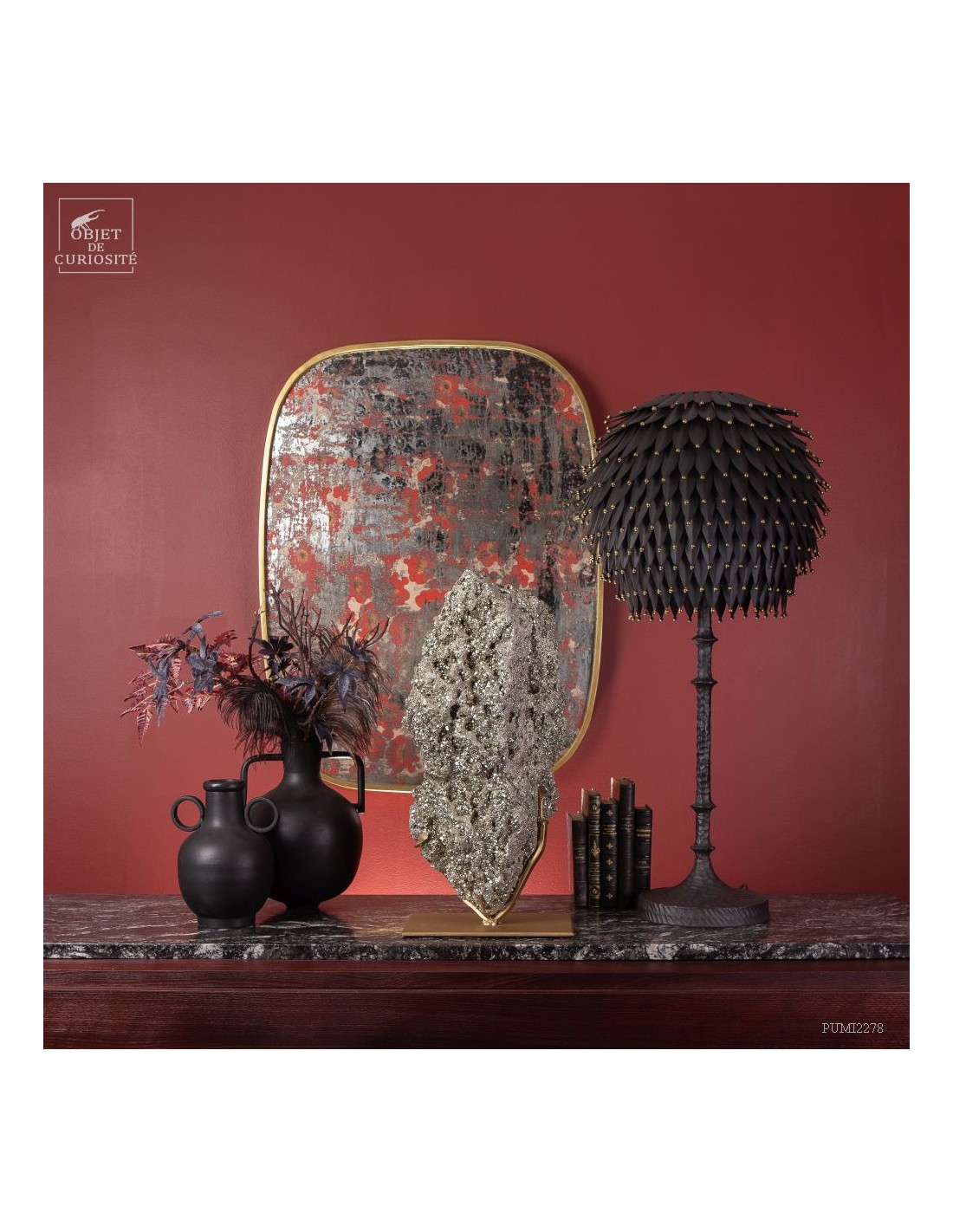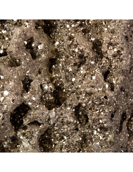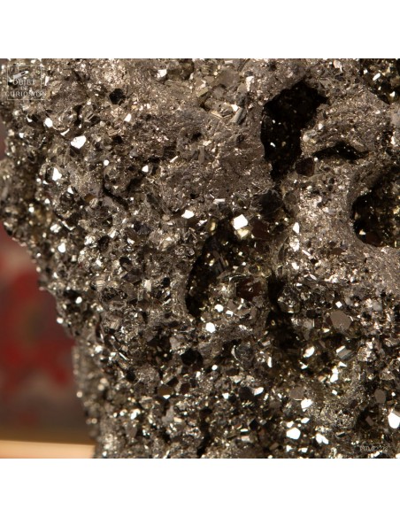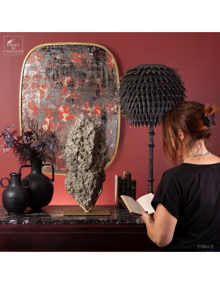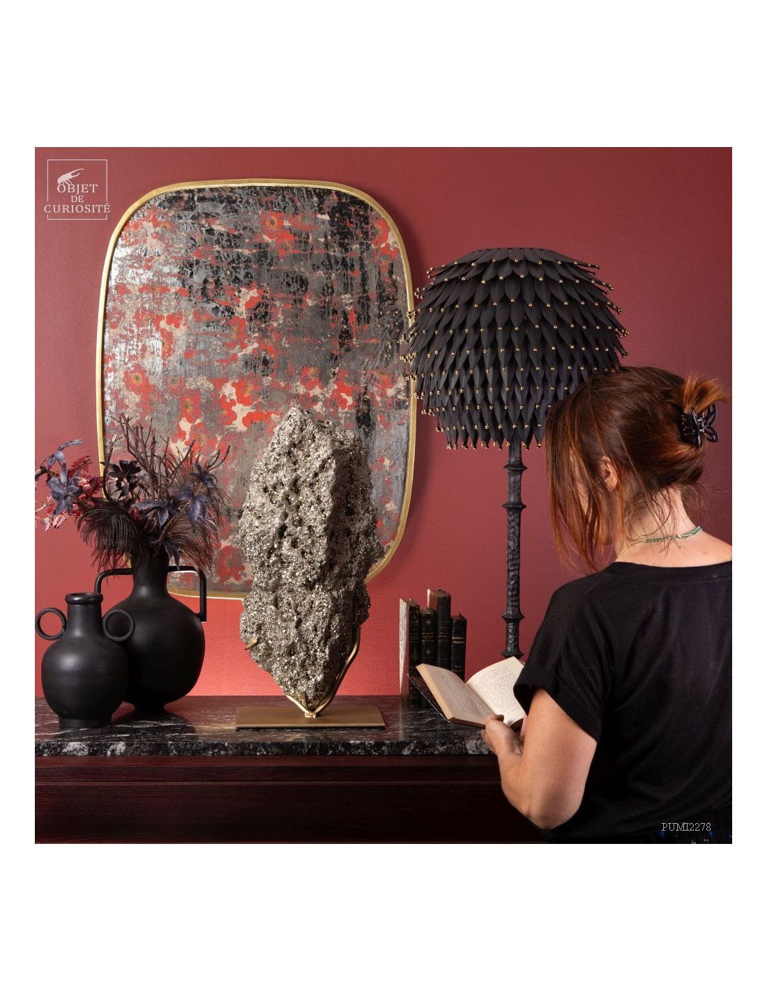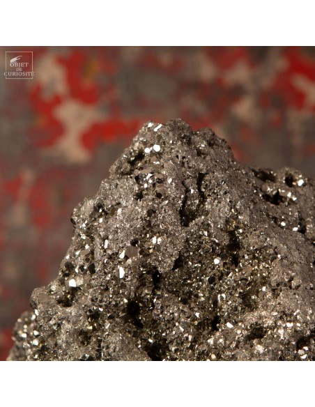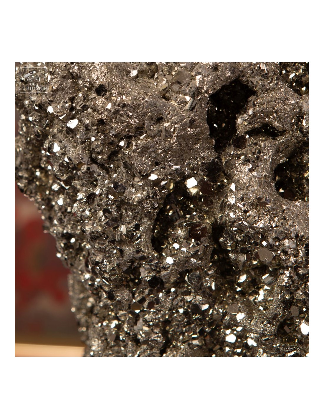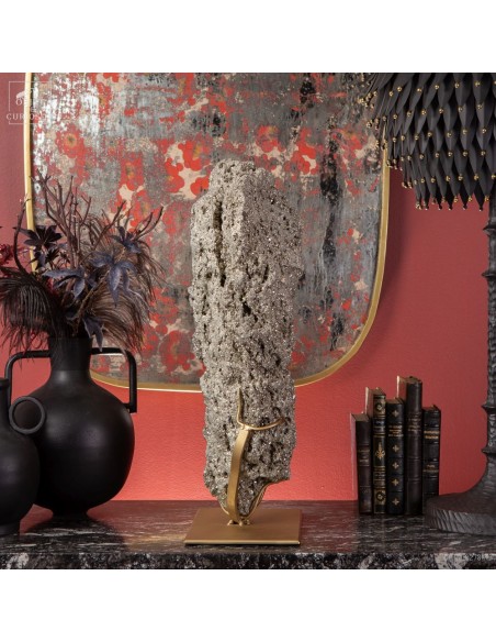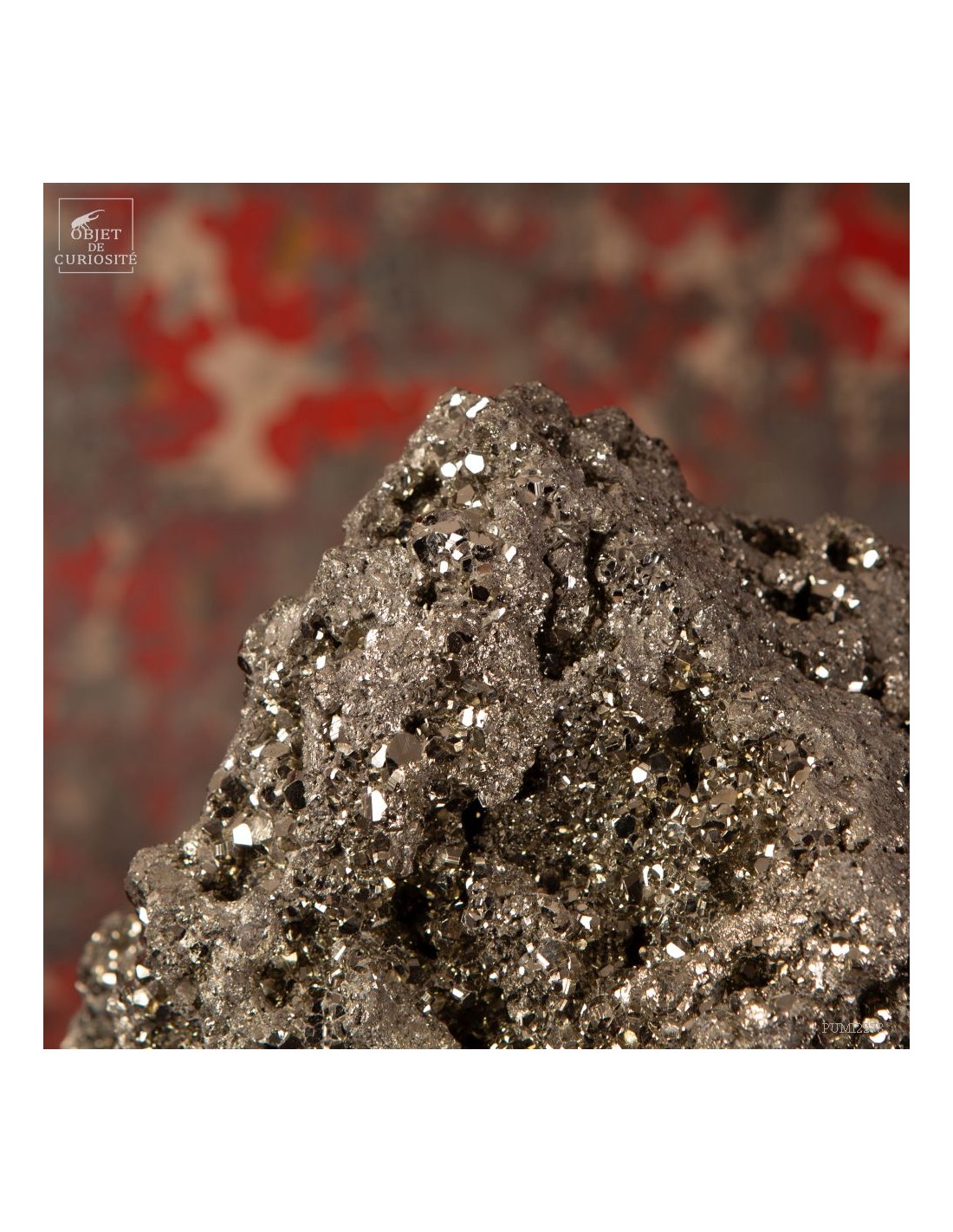 Bien sûr, avec 50cm de Haut, cette Pyrite ne pouvait pas être légère. Ce métal naturellement doré est un bloc constitué de centaine de milliers de magnifiques cristaux dodécaédriques (à douze faces), qui portent même le nom de Pyritoèdres. Ce minéral de 30 Kg vient du Pérou. Les petits cristaux sont parfois soudés entre eux, parfois nettement détachés, créant même de petites "grottes" entièrement dorées. La pyrite est un minéral composé de sulfure de fer (FeS₂) et est souvent appelée "l'or des fous" en raison de sa similitude avec l'or. Même si ce n'est pas de l'or, le pouvoir attractif de cette masse scintillante est indéniable.