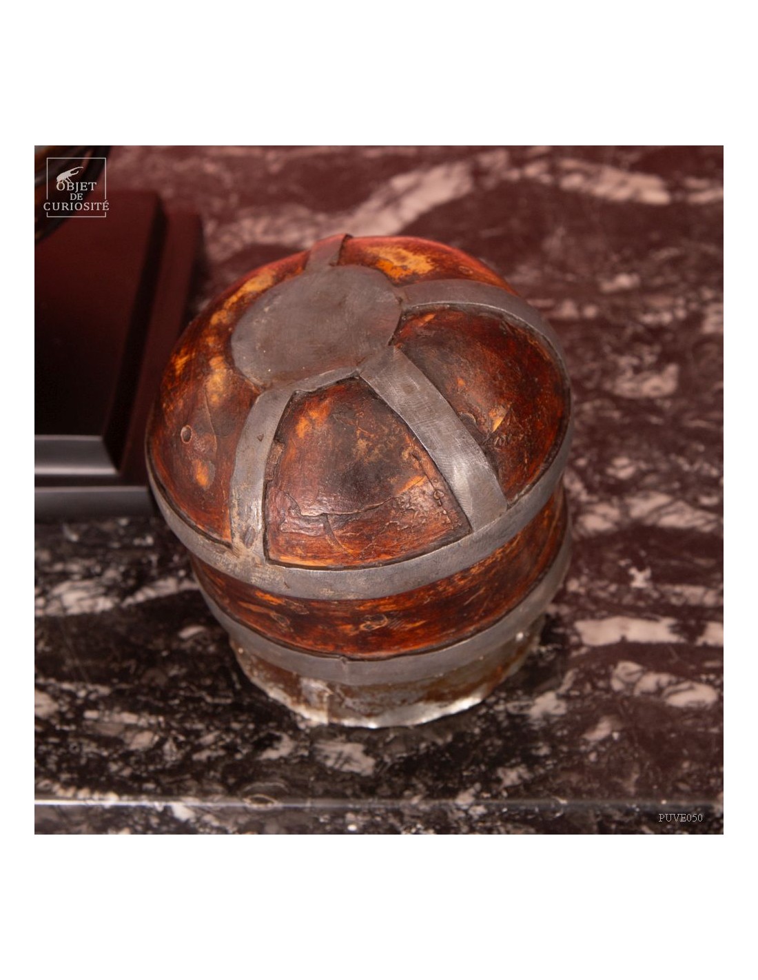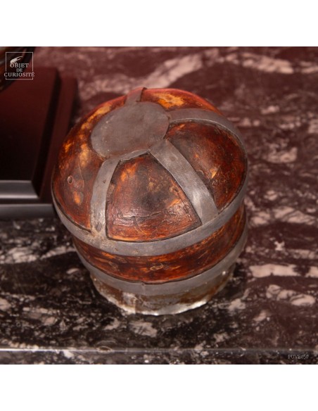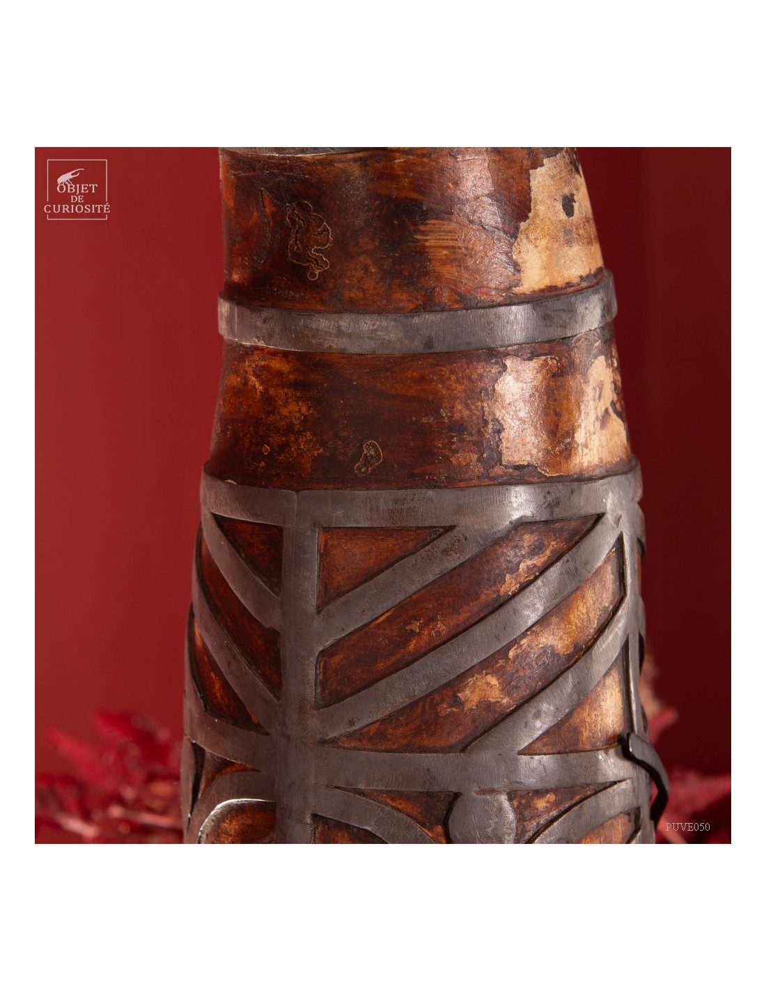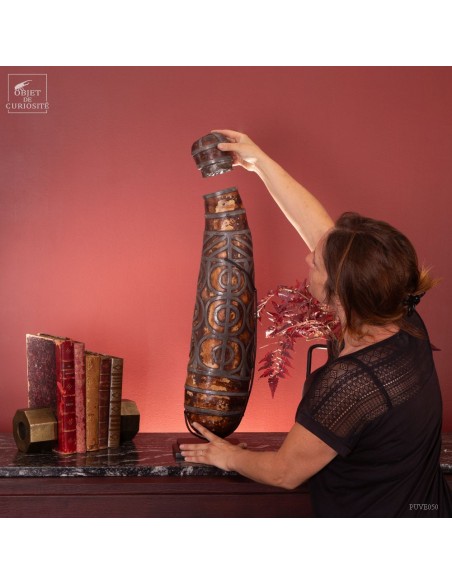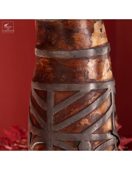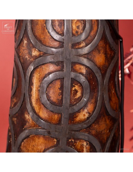 Cette calebasse est décorée d'étain selon l'art traditionnel de la culture berbère. Cet objet avait une double fonction : il servait à contenir et à conserver des liquides tels que l'eau ou l'huile, tout en étant également une pièce artistique ornementale qui exprimait l'esthétique et les valeurs culturelles de la société berbère. Les calebasses séchées avaient la particularité d'être légères, solides et imperméables, en faisant donc des récipients adaptés aux déplacements de ces populations nomades.