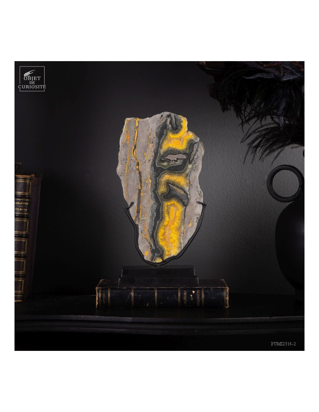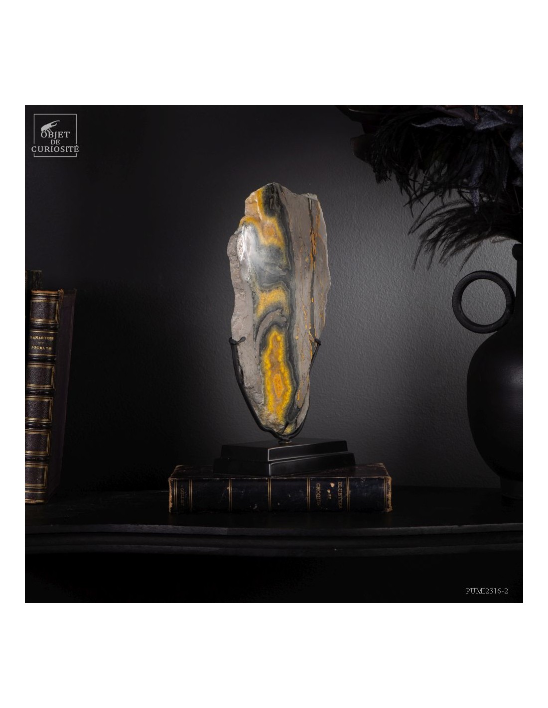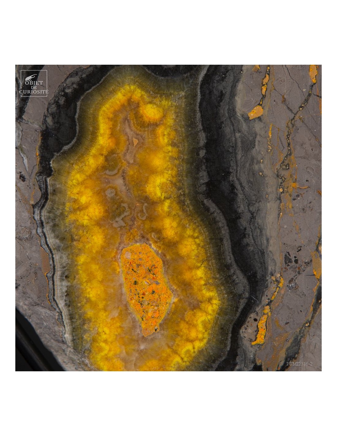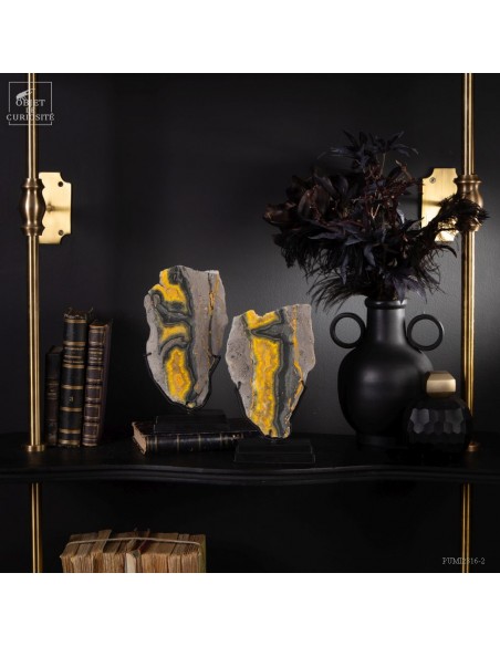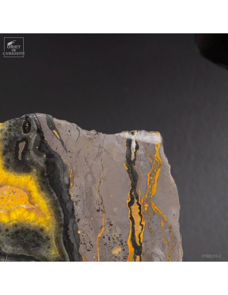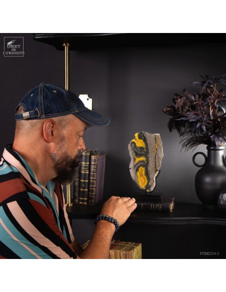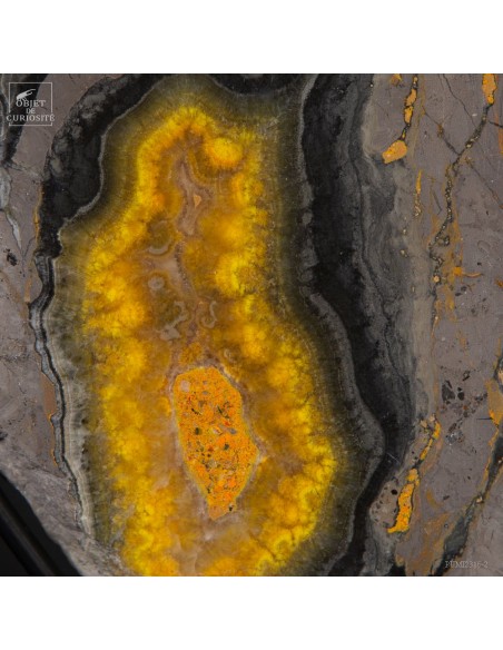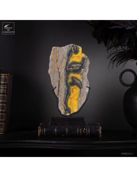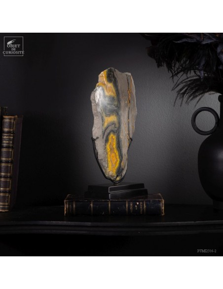 Un mélange de couleurs inhabituel dans le monde minéral. Le Jaspe Bourdon fait effectivement penser à cet insecte avec ses lignes jaunes noires et orangées. Cette pierre a été trouvée au pied d'un volcan toujours en activité à l'Ouest de Java: le Papandayan. Ce n'est pas exactement un Jaspe, mais il a souvent une structure botryoïde (cristaux radiés à partir d'un nucleus), comme certains Jaspes. Ces bandes jaunes/orange et noires se sont formées avec la compression de couches issues du volcan. Les lignes noires sont chargée en hématite, après oxydation de la pyrite, et les veines jaunes orangées sont chargée en Orpiment, un sulfure d'Arsenic. Cette pierre s'est répandue en occident à partir de 1990, quand les ouvriers qui vont chercher du souffre parmi les fumerolles toxiques du volcan, ont commencé à récolter ces magnifiques curiosités. Un tranche de bourdon d'une taille exceptionnelle...
