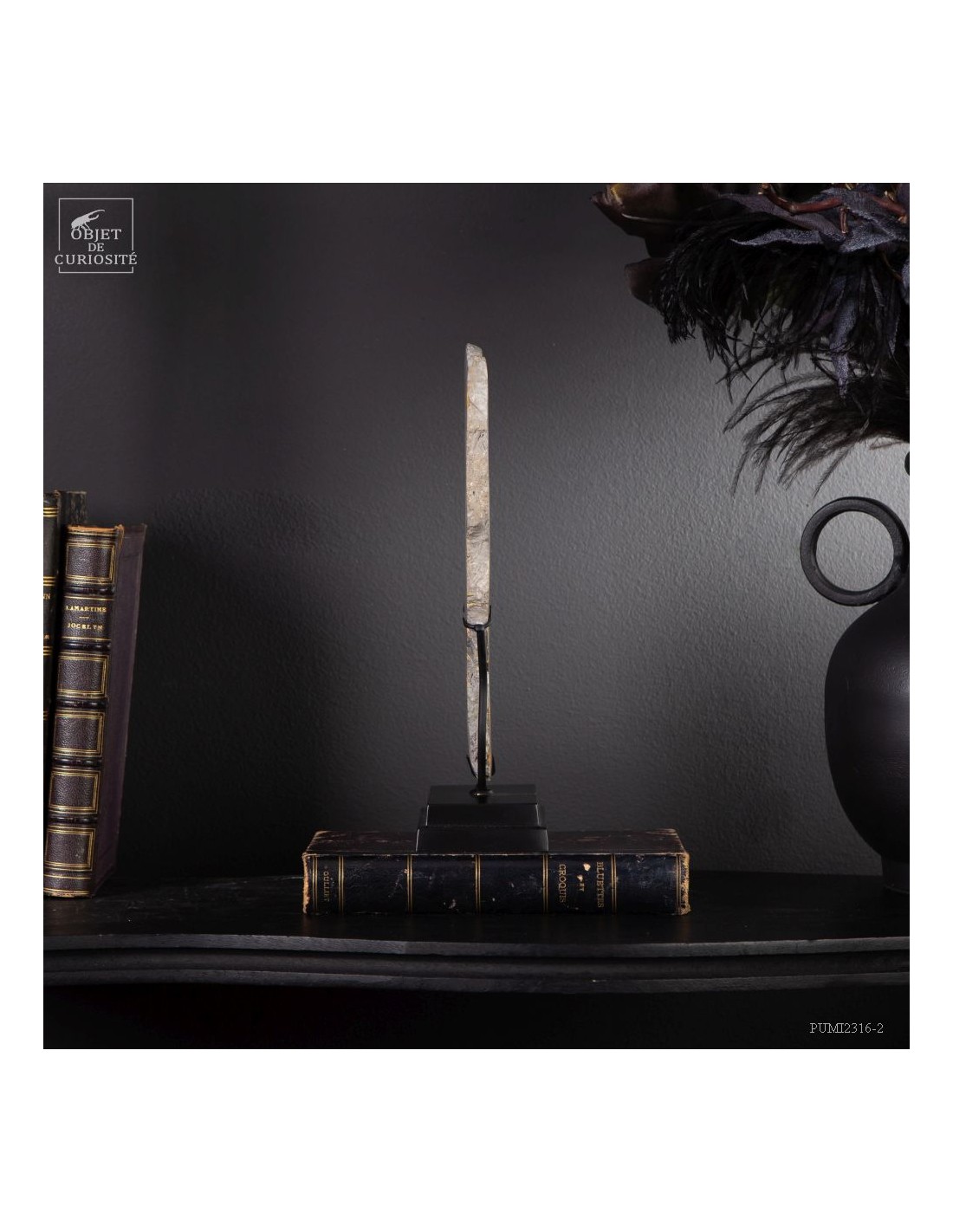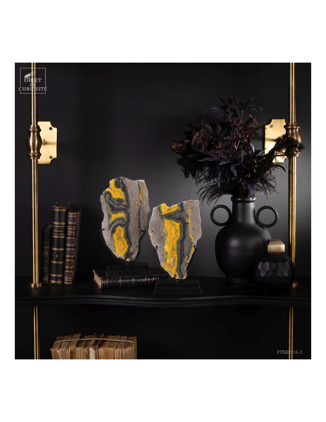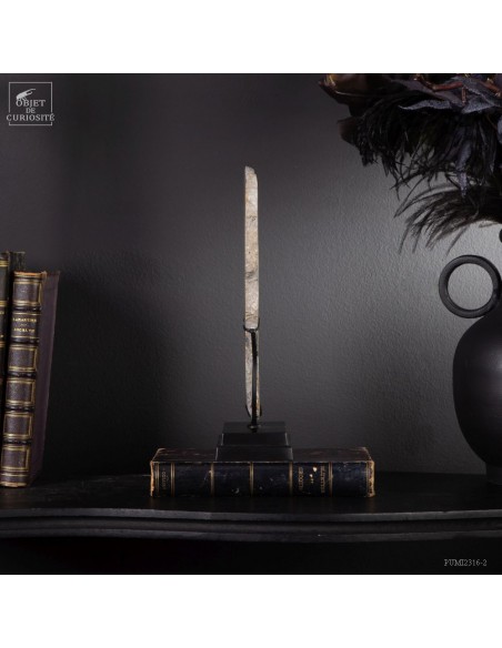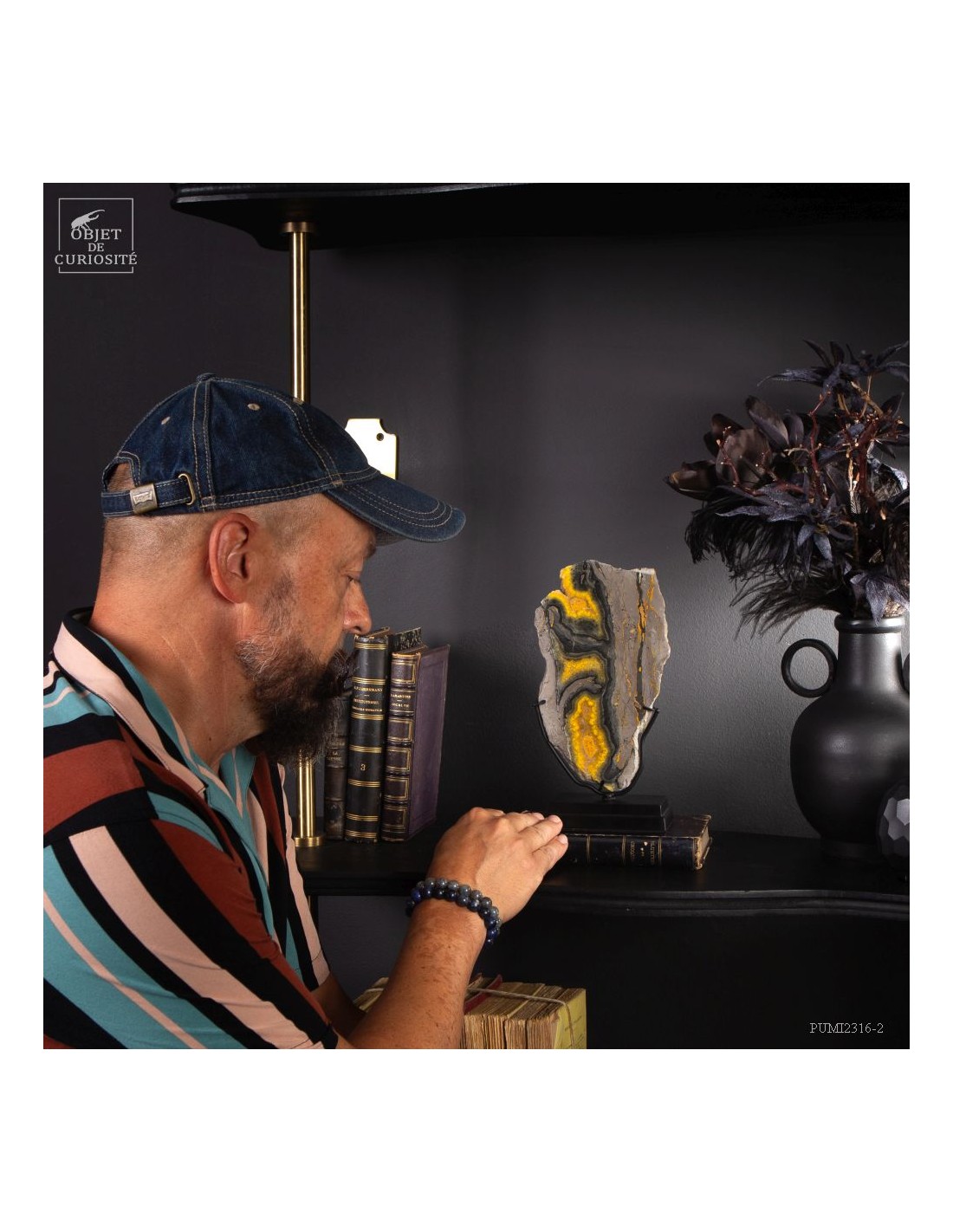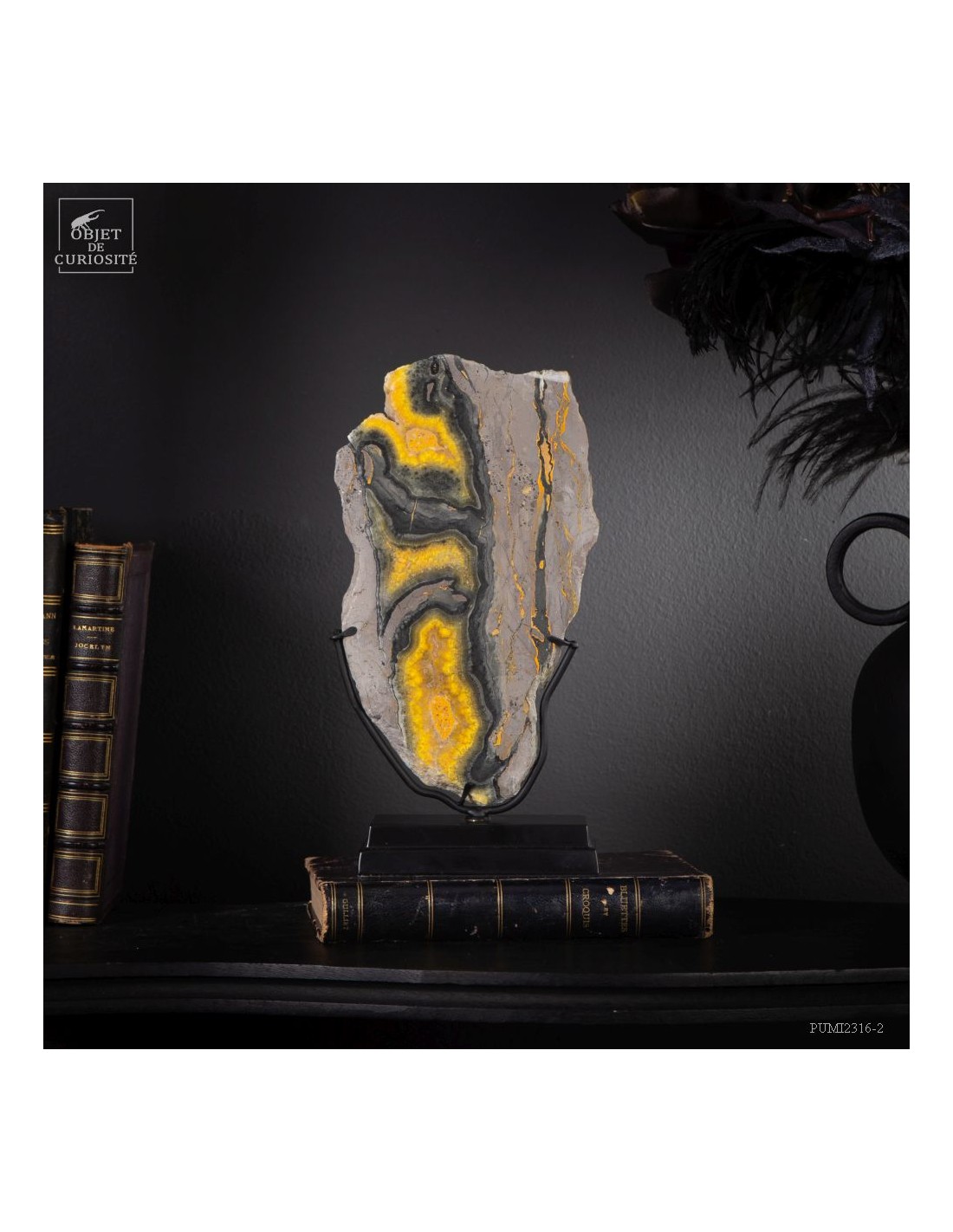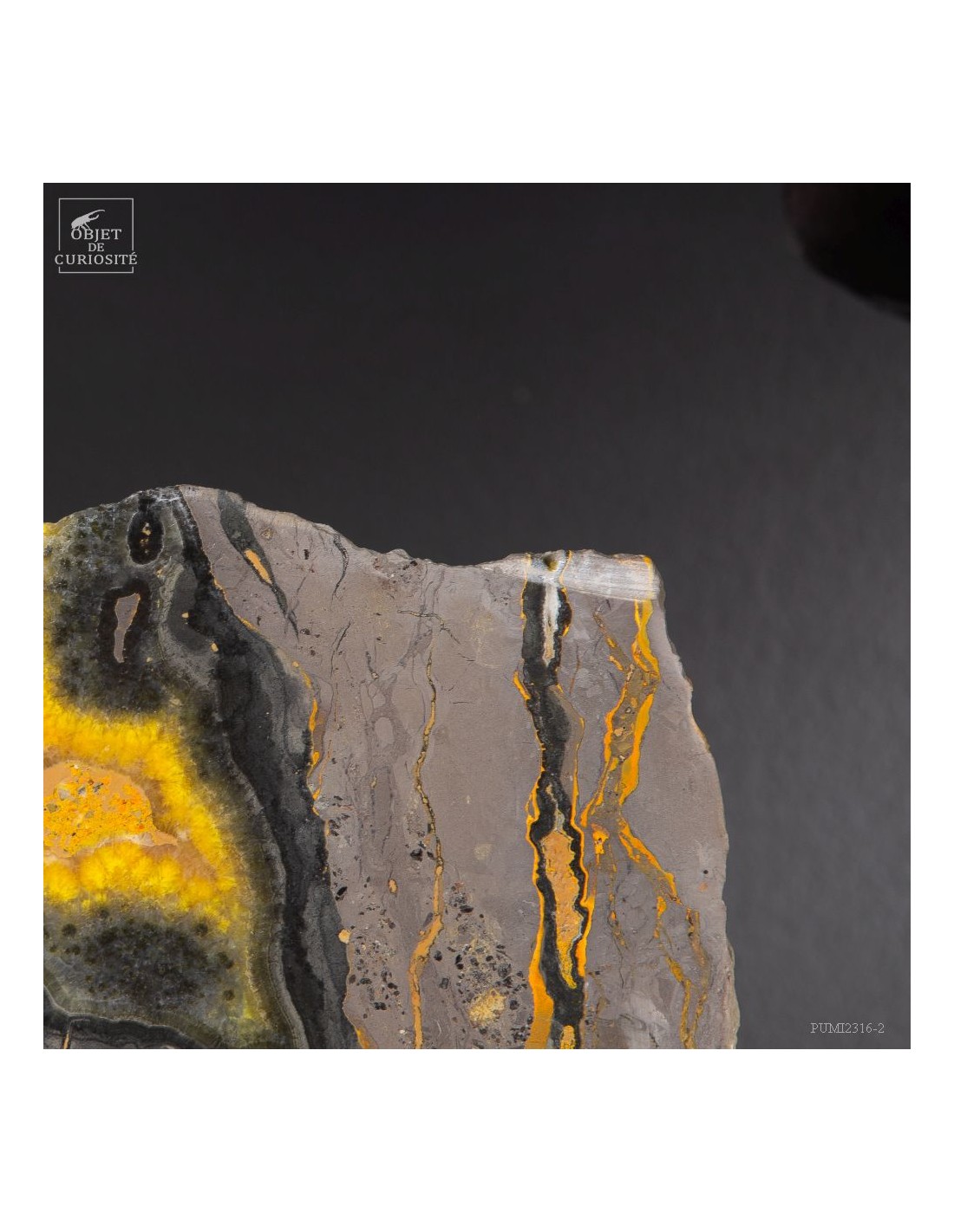 Un mélange de couleurs inhabituel dans le monde minéral. Le Jaspe Bourdon fait effectivement penser à cet insecte avec ses lignes jaunes noires et orangées. Cette pierre a été trouvée au pied d'un volcan toujours en activité à l'Ouest de Java: le Papandayan. Ce n'est pas exactement un Jaspe, mais il a souvent une structure botryoïde (cristaux radiés à partir d'un nucleus), comme certains Jaspes. Ces bandes jaunes/orange et noires se sont formées avec la compression de couches issues du volcan. Les lignes noires sont chargée en hématite, après oxydation de la pyrite, et les veines jaunes orangées sont chargée en Orpiment, un sulfure d'Arsenic. Cette pierre s'est répandue en occident à partir de 1990, quand les ouvriers qui vont chercher du souffre parmi les fumerolles toxiques du volcan, ont commencé à récolter ces magnifiques curiosités. Un tranche de bourdon d'une taille exceptionnelle...