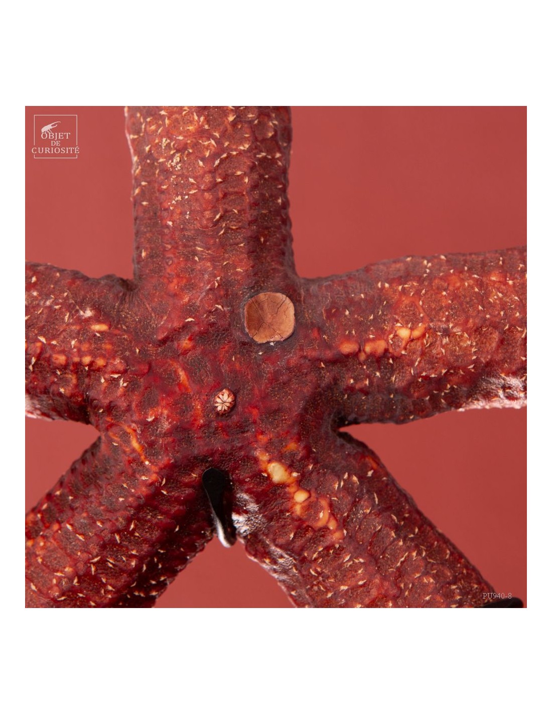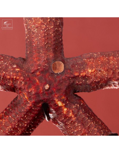 Cette géante est une étoile de mer qui approche la taille record! De la famille des Linckia, ses bras sont à peu près cylindriques et son dessin est réellement celui d'une étoile. Mais contrairement à Echinaster Sepositus qui est l'étoile de mer rouge que l'on rencontre en mer Méditerranée, celle-ci atteint ici une envergure de 50cm... A noter, légèrement excentrée, un cercle un peu plus gros que le reste des motifs de cette étoile: la plaque madréporique. C'est par cet organe que l'étoile de mer respire et filtre l'eau de mer.