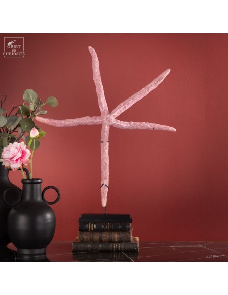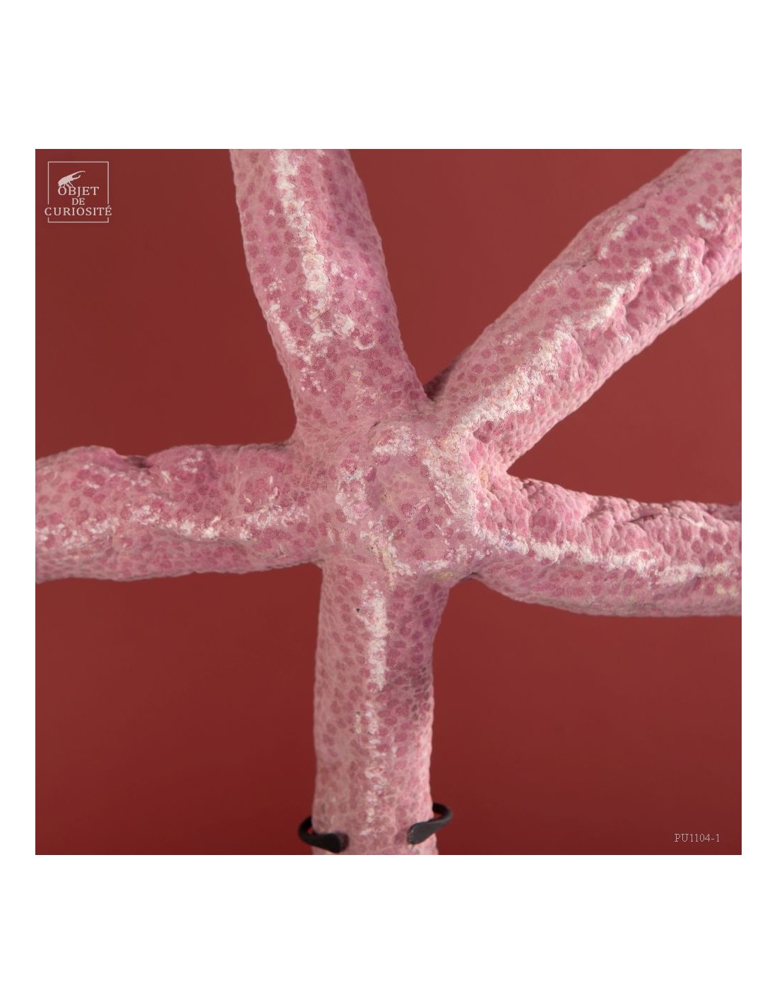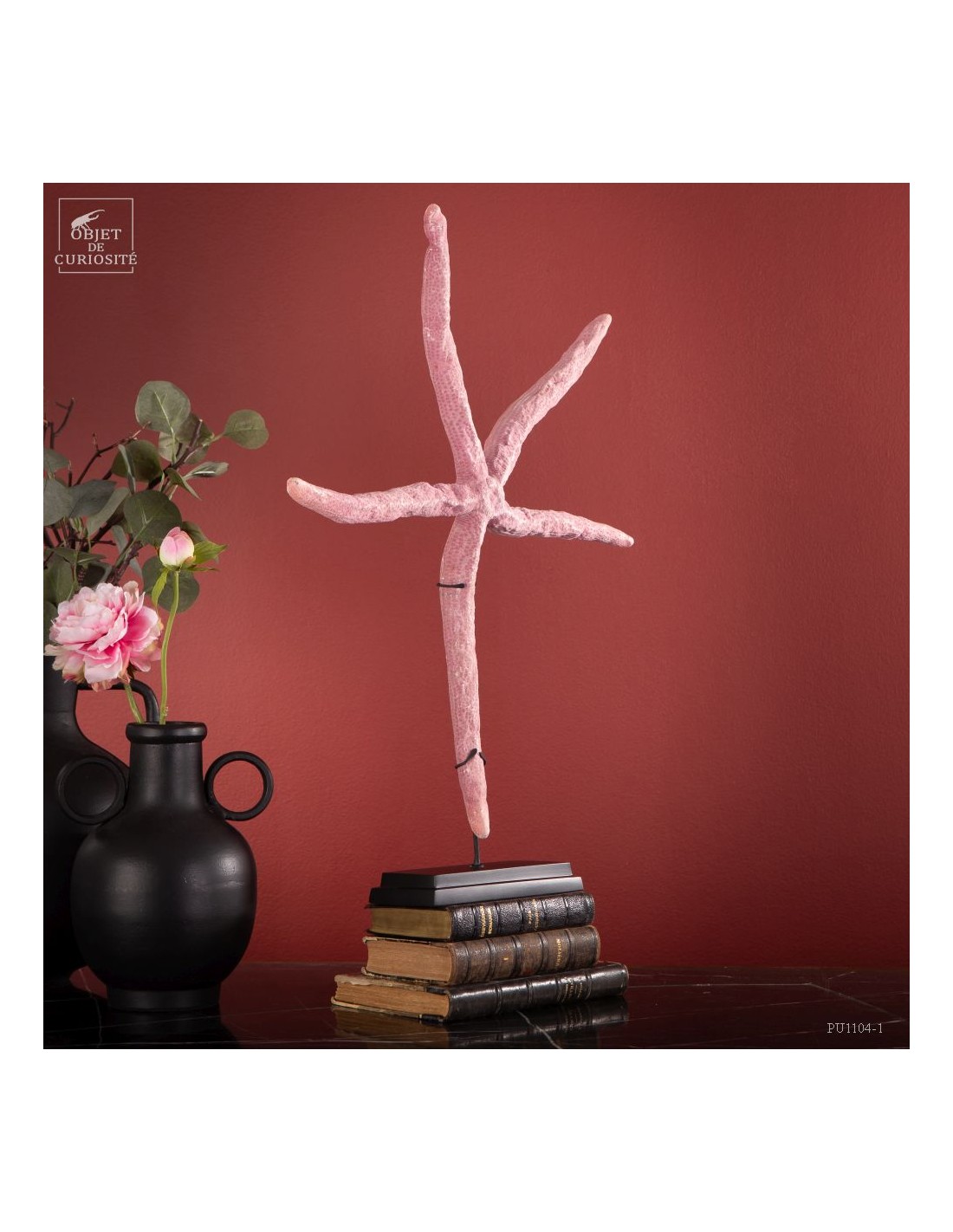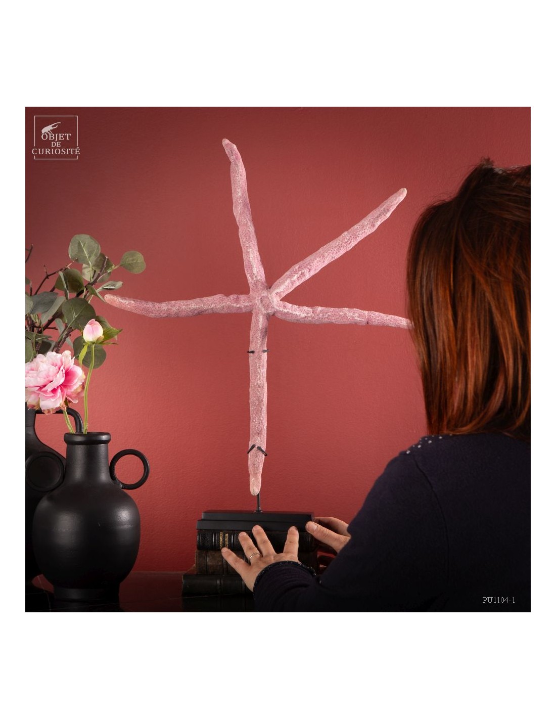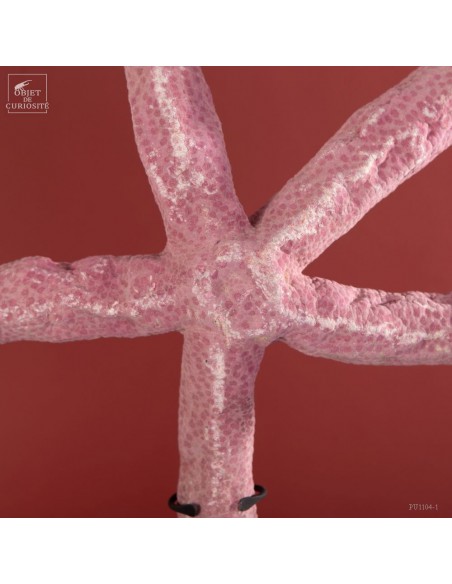 Elle est naturellement rose, et géante: une étoile de mer Linckia des Philippines. Mais celle-ci est extrêmement rare: c'est une comète. Donc avec un bras plus grand que les autres. En effet les étoiles de mer ont cette capacité étonnante de faire repousser un bras qui a été sectionné (le plus souvent par un poisson ou un crabe qui a tenté de la dévorer). Mais le summum de la rareté, c'est quand l'étoile s'est recrée complètement à partir d'un seul bras! et c'est pour cela qu'un bras est plus long que les autres. Une curiosité rose.