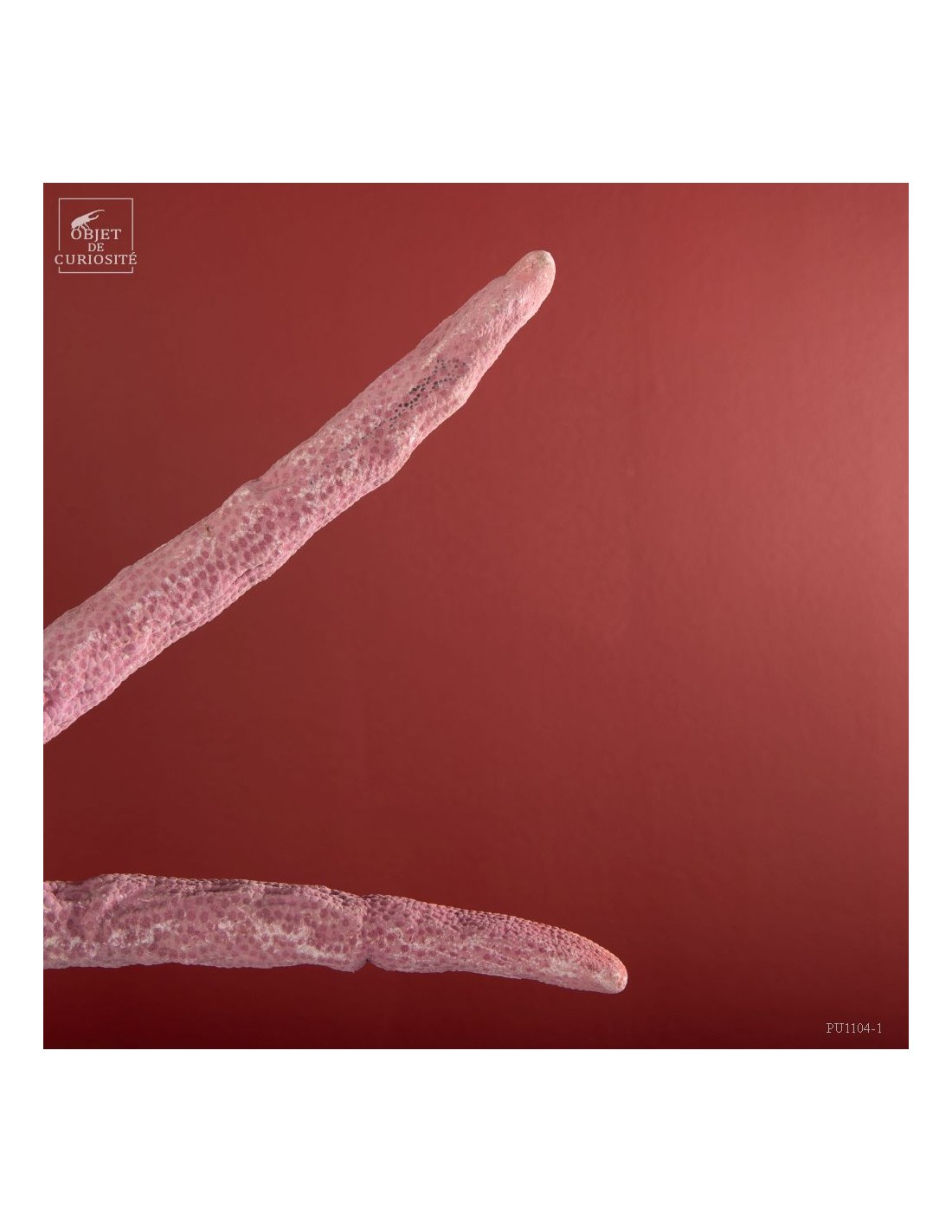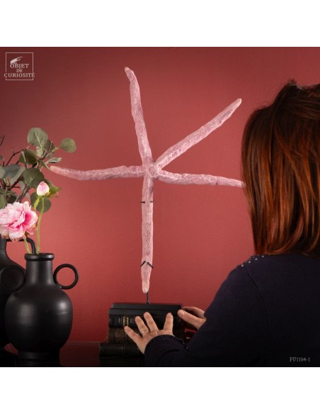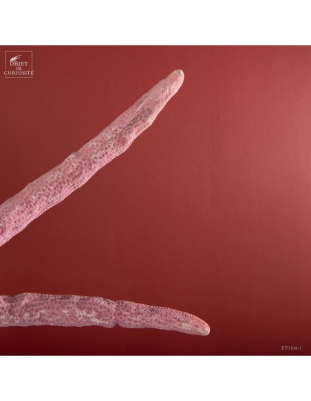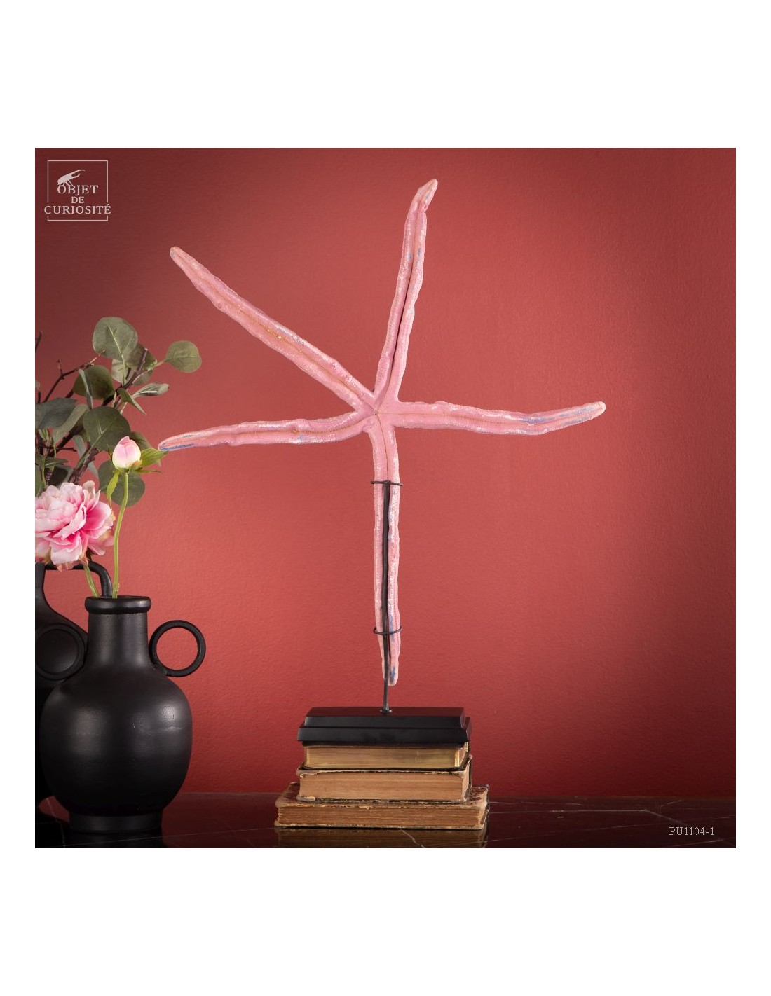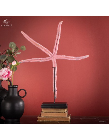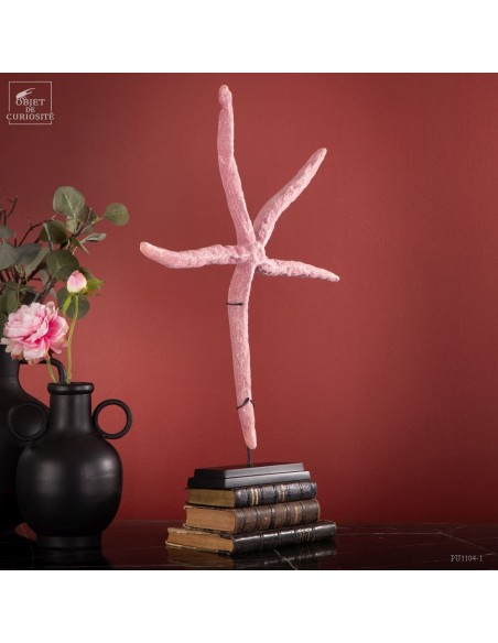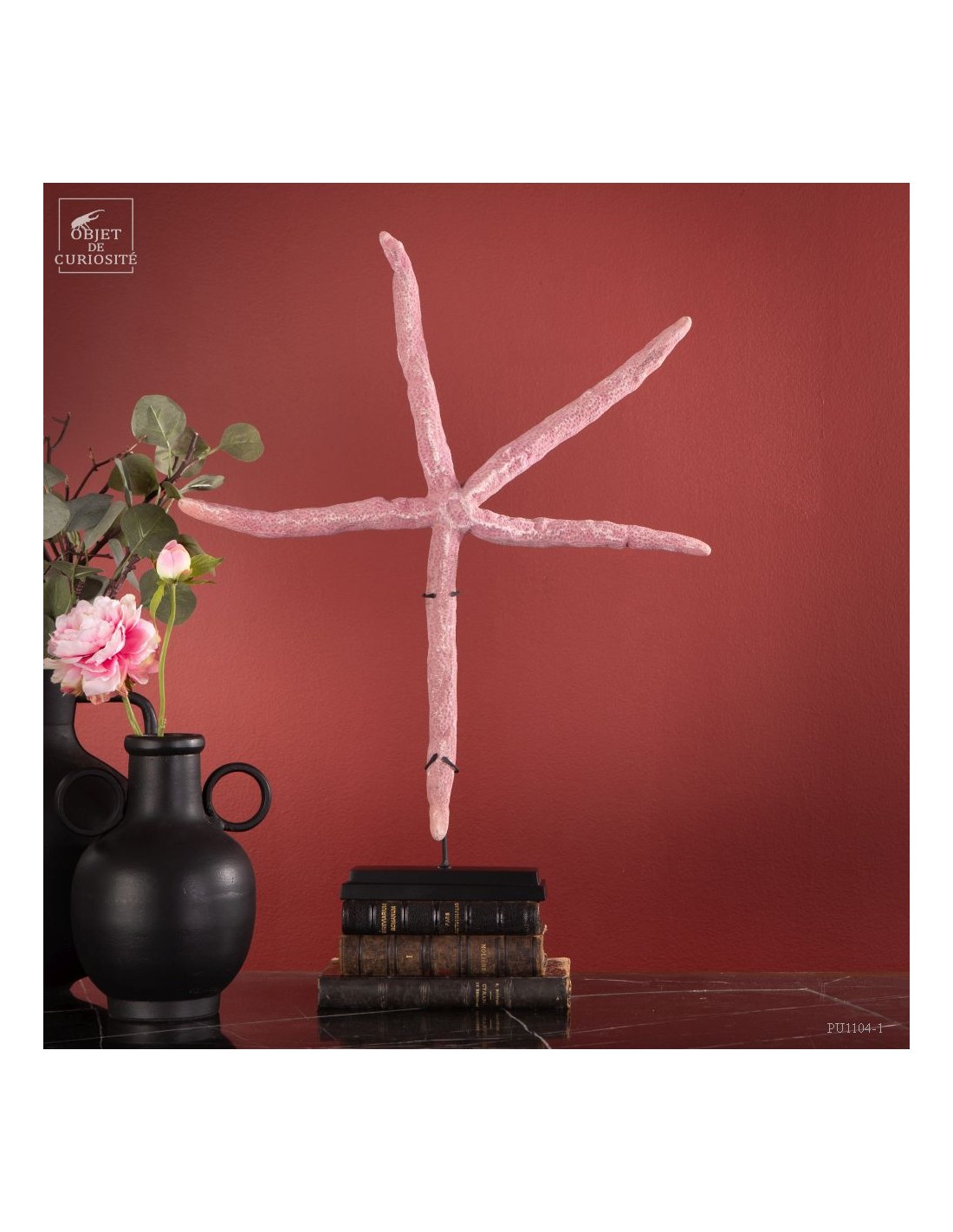 Elle est naturellement rose, et géante: une étoile de mer Linckia des Philippines. Mais celle-ci est extrêmement rare: c'est une comète. Donc avec un bras plus grand que les autres. En effet les étoiles de mer ont cette capacité étonnante de faire repousser un bras qui a été sectionné (le plus souvent par un poisson ou un crabe qui a tenté de la dévorer). Mais le summum de la rareté, c'est quand l'étoile s'est recrée complètement à partir d'un seul bras! et c'est pour cela qu'un bras est plus long que les autres. Une curiosité rose.