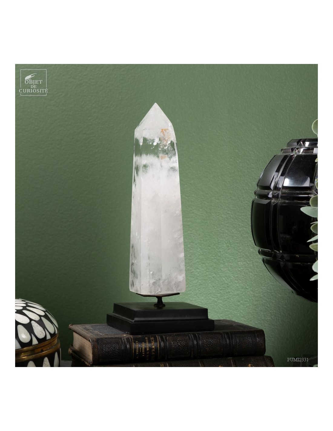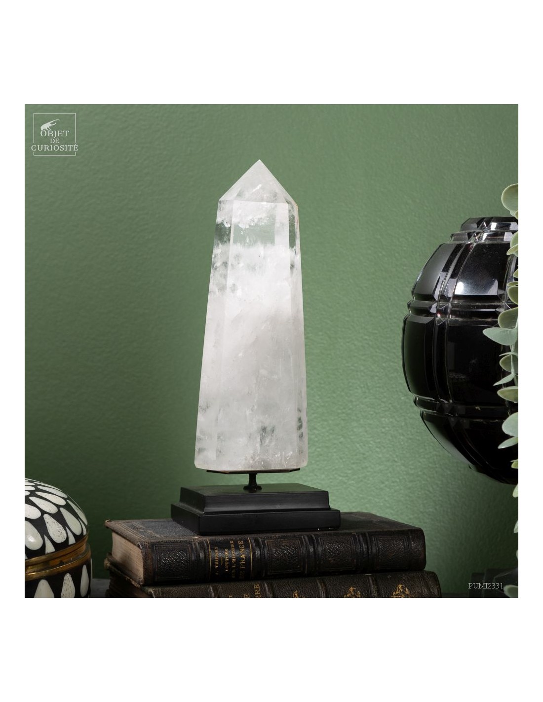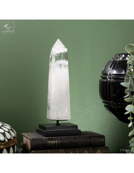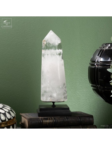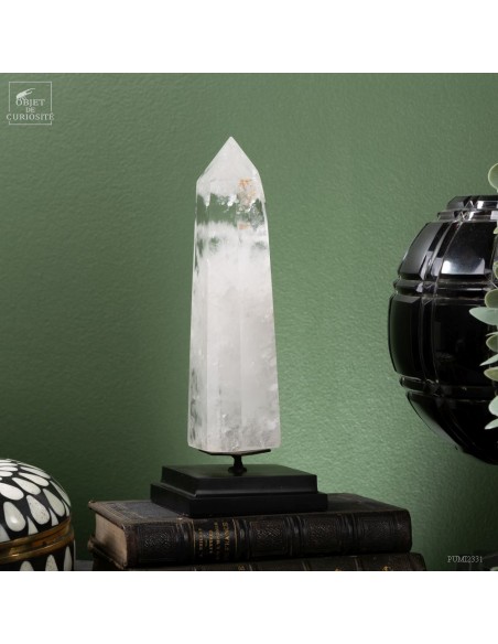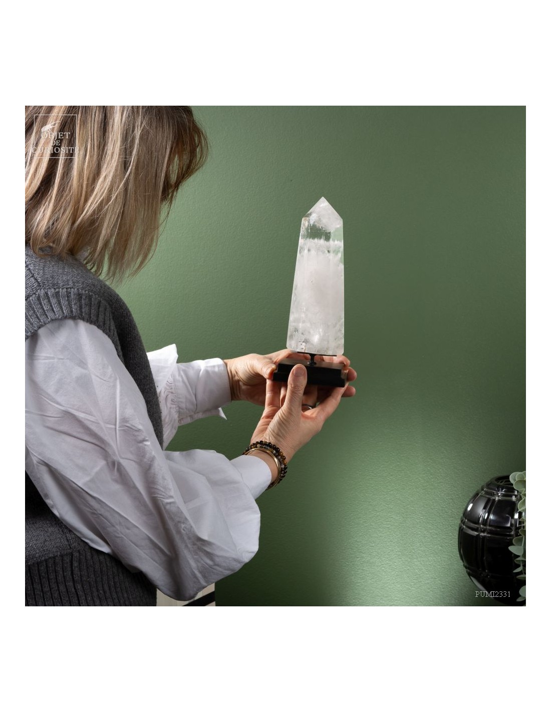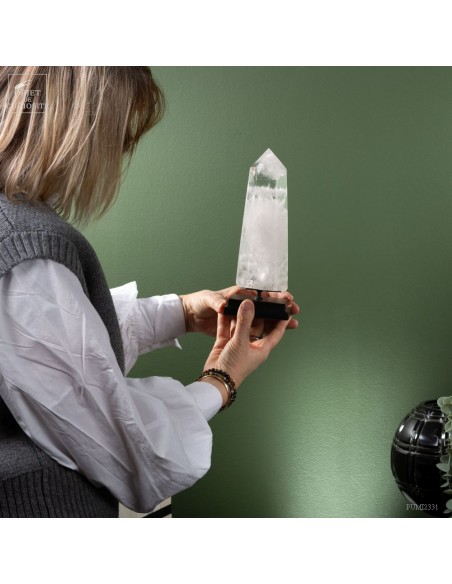 Cette pointe de cristal de 1 Kg vient de Madagascar et est présentée sur une base noire. C'est un cristal très transparent, mais il semble qu'il contienne des voiles de mystère... En fait il est le résultat d'un mélange imparfait de la solution de minéraux qui le composent (dioxyde de Silicium+selenite, antimonite...) lors de sa croissance il y a plusieurs millions d'années. Un mélange imparfait, mais qui constitue le "jardin" de ce cristal: sa signature unique.
