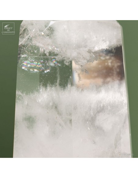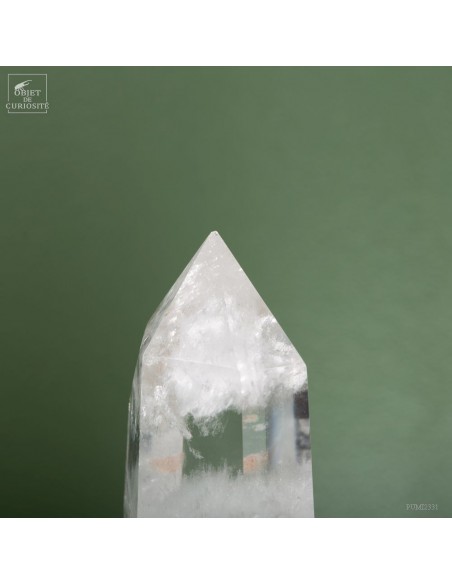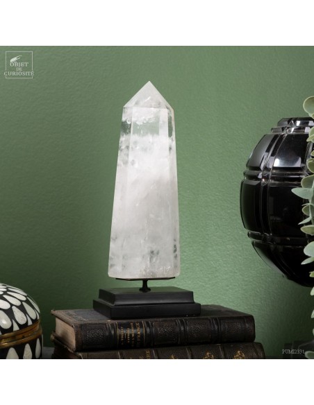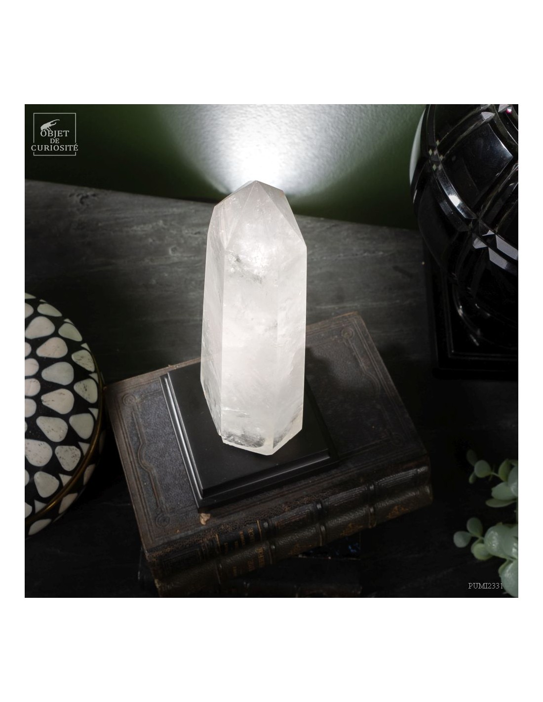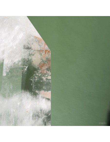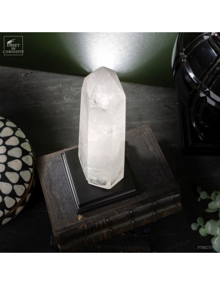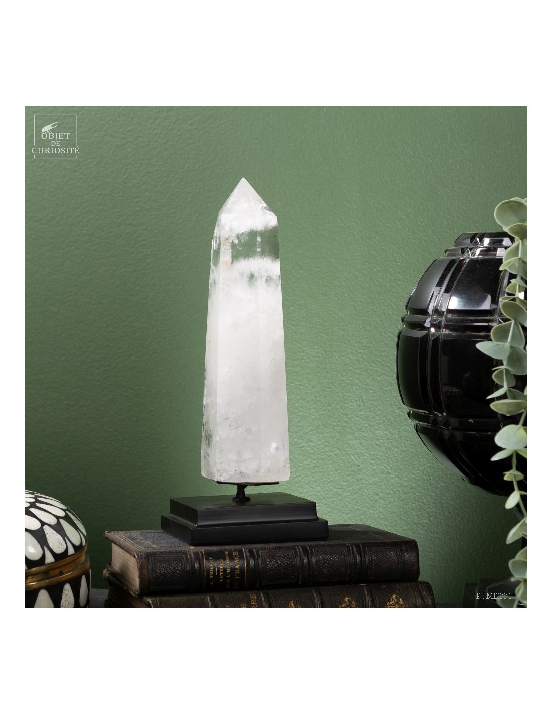 Cette pointe de cristal de 1 Kg vient de Madagascar et est présentée sur une base noire. C'est un cristal très transparent, mais il semble qu'il contienne des voiles de mystère... En fait il est le résultat d'un mélange imparfait de la solution de minéraux qui le composent (dioxyde de Silicium+selenite, antimonite...) lors de sa croissance il y a plusieurs millions d'années. Un mélange imparfait, mais qui constitue le "jardin" de ce cristal: sa signature unique.