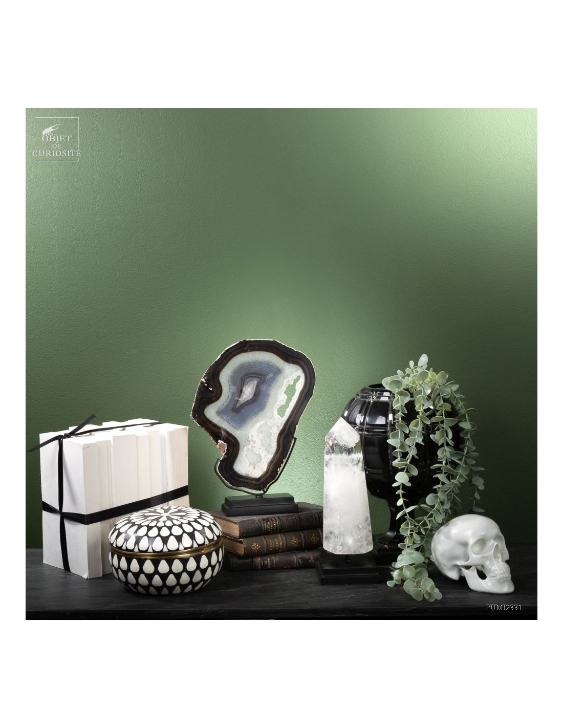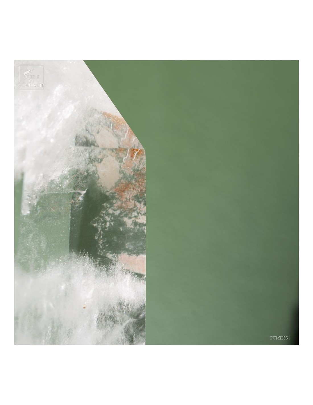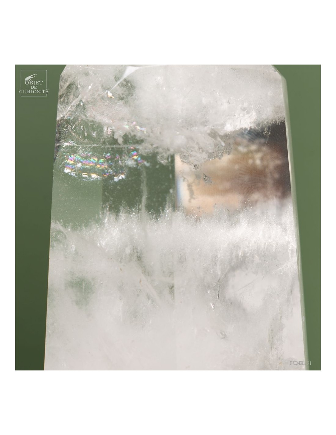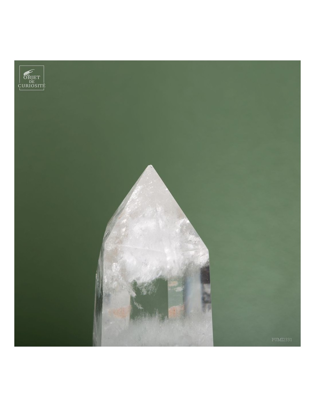 Cette pointe de cristal de 1 Kg vient de Madagascar et est présentée sur une base noire. C'est un cristal très transparent, mais il semble qu'il contienne des voiles de mystère... En fait il est le résultat d'un mélange imparfait de la solution de minéraux qui le composent (dioxyde de Silicium+selenite, antimonite...) lors de sa croissance il y a plusieurs millions d'années. Un mélange imparfait, mais qui constitue le "jardin" de ce cristal: sa signature unique.