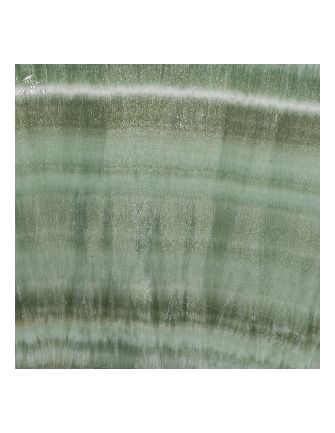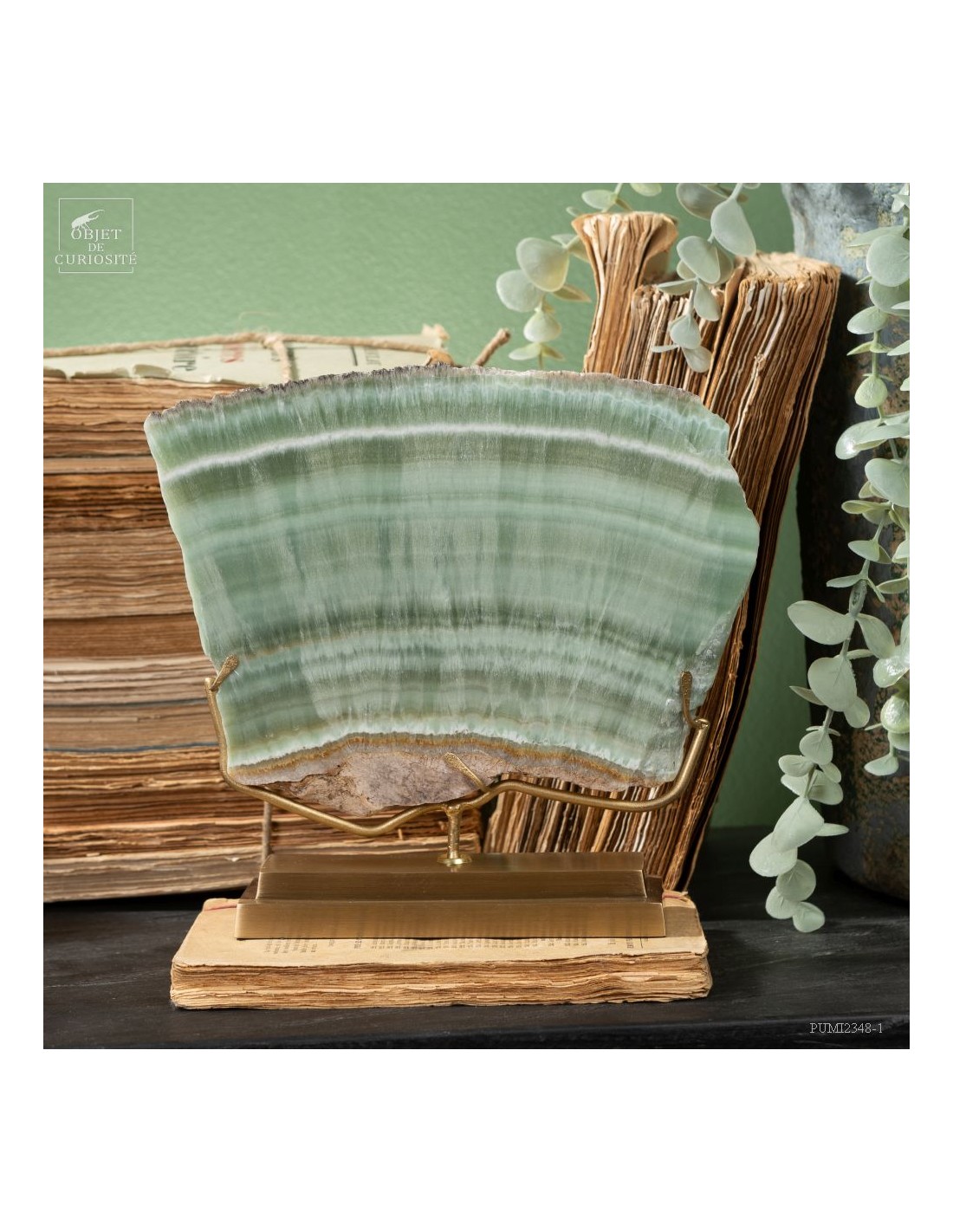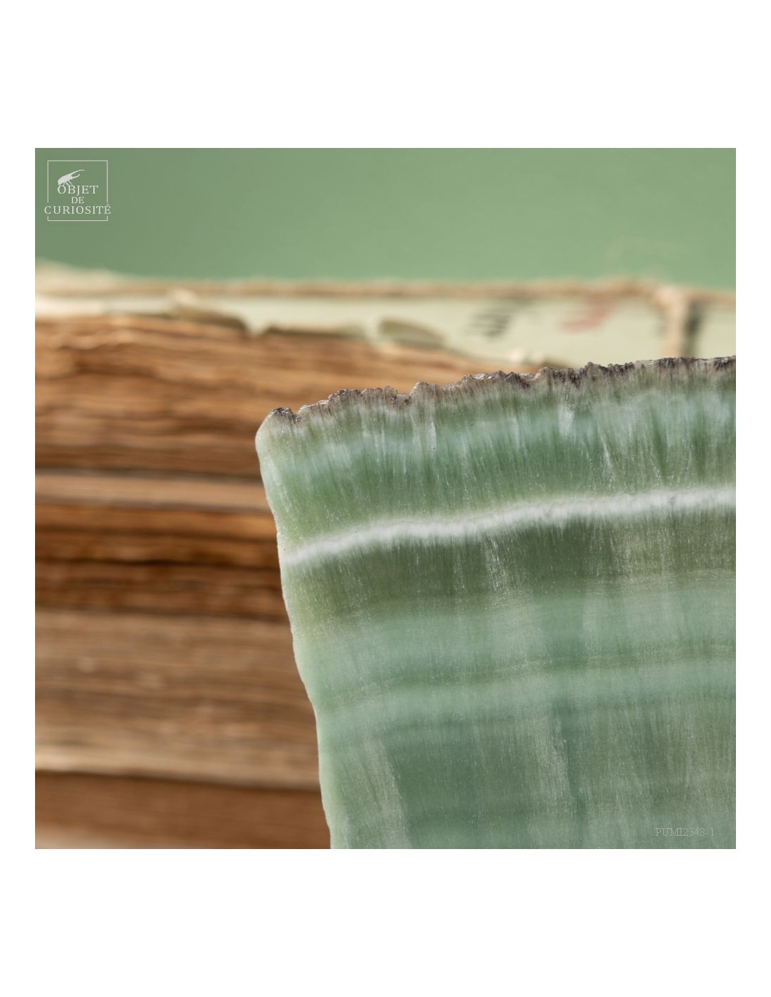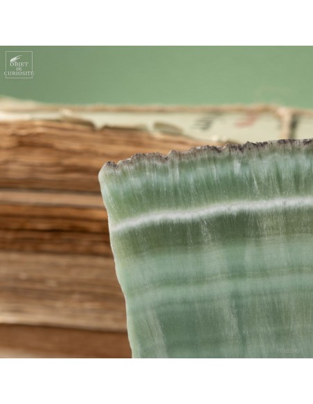 L'Aragonite est un Carbonate de calcium composé de cristaux rayonnants. Elle se rencontre souvent avec une belle couleur orangée, mais aussi sous un beau blanc immaculé. Cette variété verte est plus rare, et elle provient de la mine Espagnole de Mina La Profunda, dans la province de Castille et Leon. Cette belle couleur verte vient des infiltrations d'eau en contact avec du minerai de cuivre. Cette tranche polie ressemble à l'océan Atlantique marbré d'écume. Un hasard de la nature Espagnole.