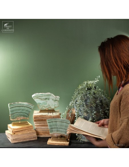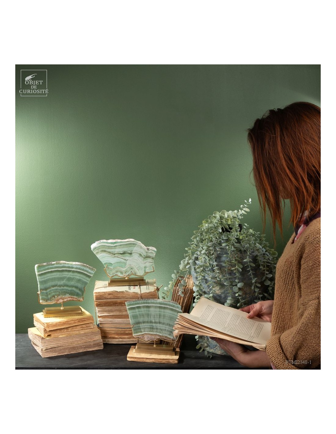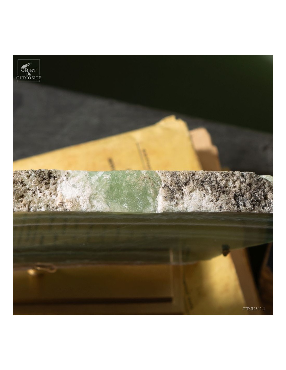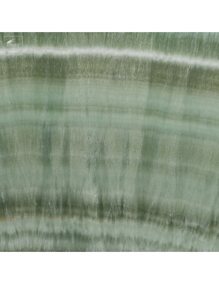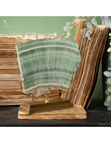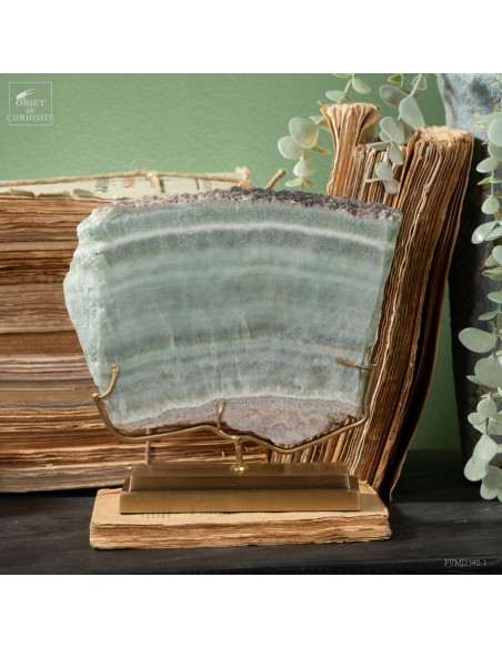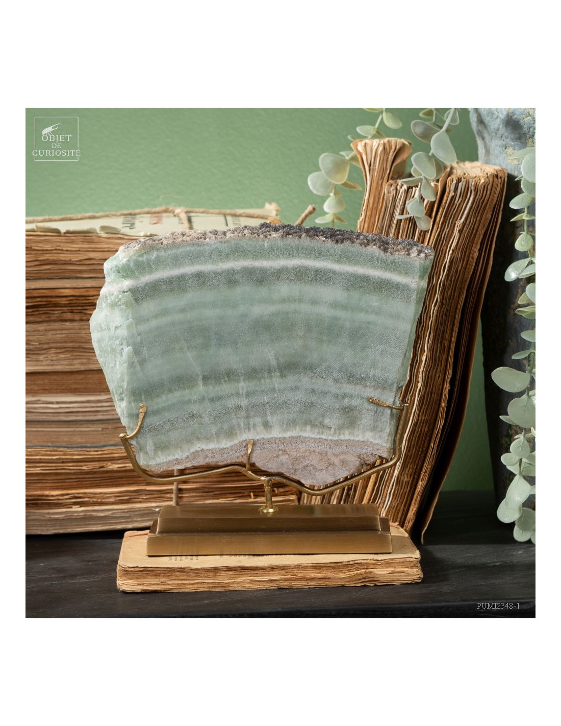 L'Aragonite est un Carbonate de calcium composé de cristaux rayonnants. Elle se rencontre souvent avec une belle couleur orangée, mais aussi sous un beau blanc immaculé. Cette variété verte est plus rare, et elle provient de la mine Espagnole de Mina La Profunda, dans la province de Castille et Leon. Cette belle couleur verte vient des infiltrations d'eau en contact avec du minerai de cuivre. Cette tranche polie ressemble à l'océan Atlantique marbré d'écume. Un hasard de la nature Espagnole.