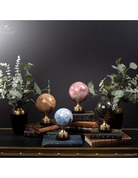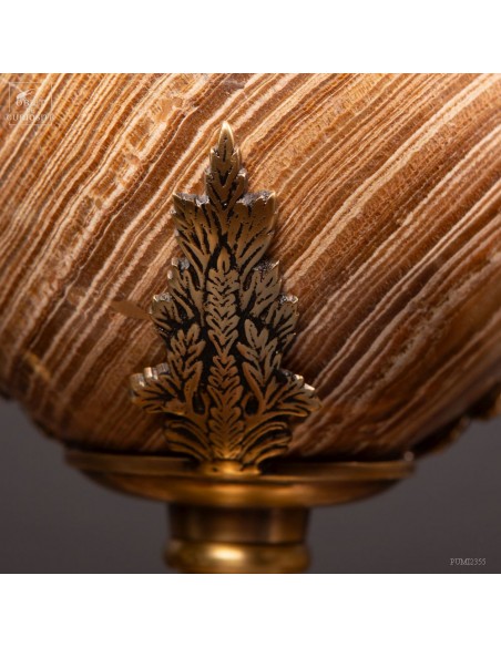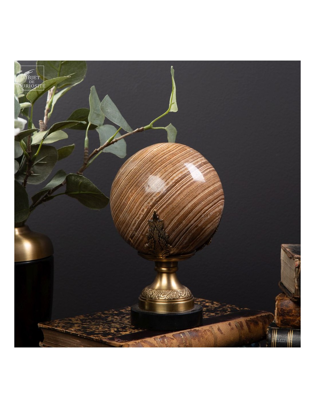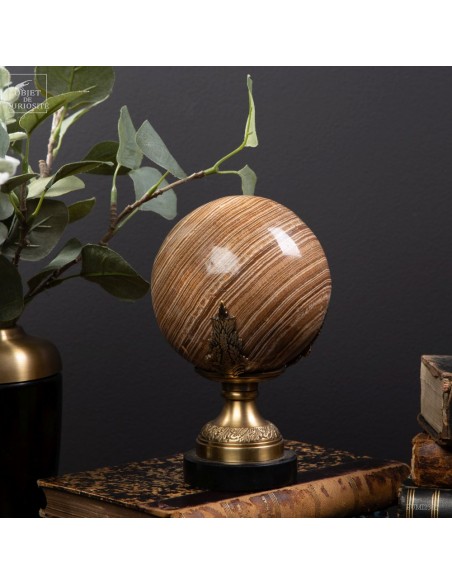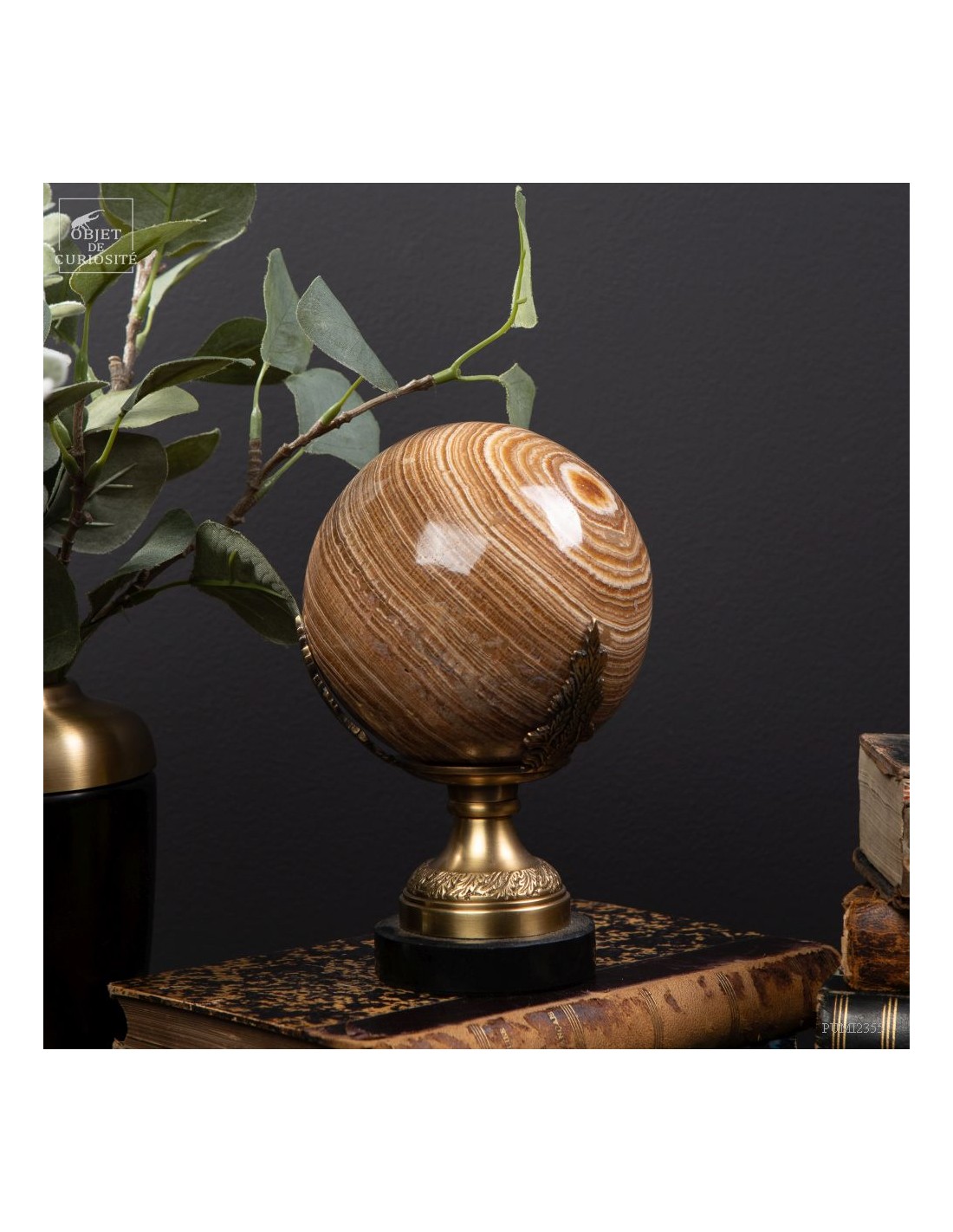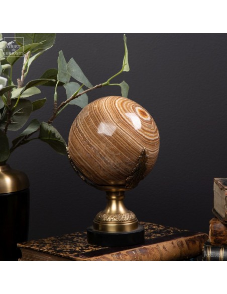 Sphère d'aragonite ambrée du Maroc sur pied laiton et marbre