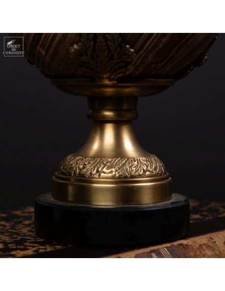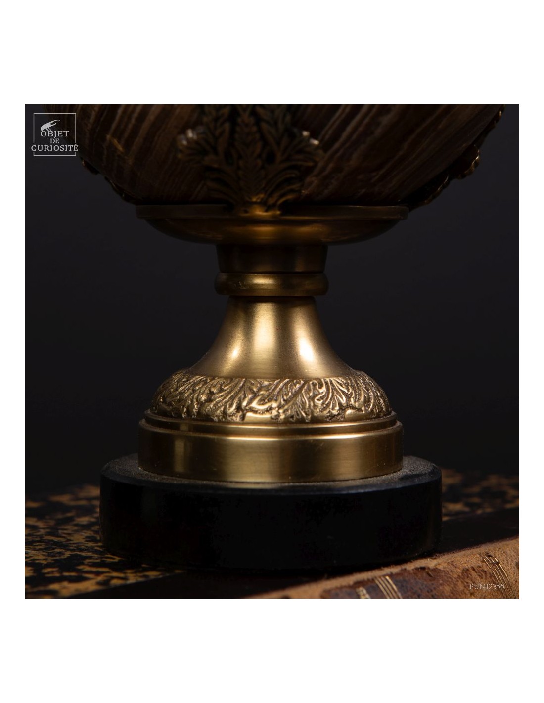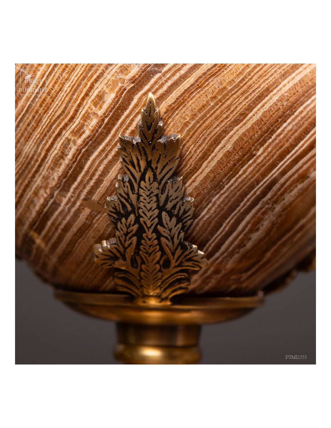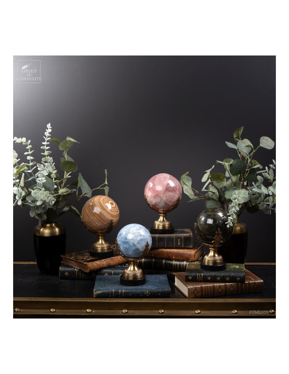Sphère d'aragonite ambrée du Maroc sur pied laiton et marbre