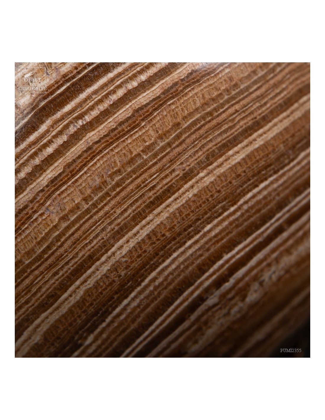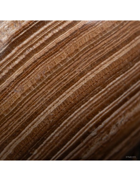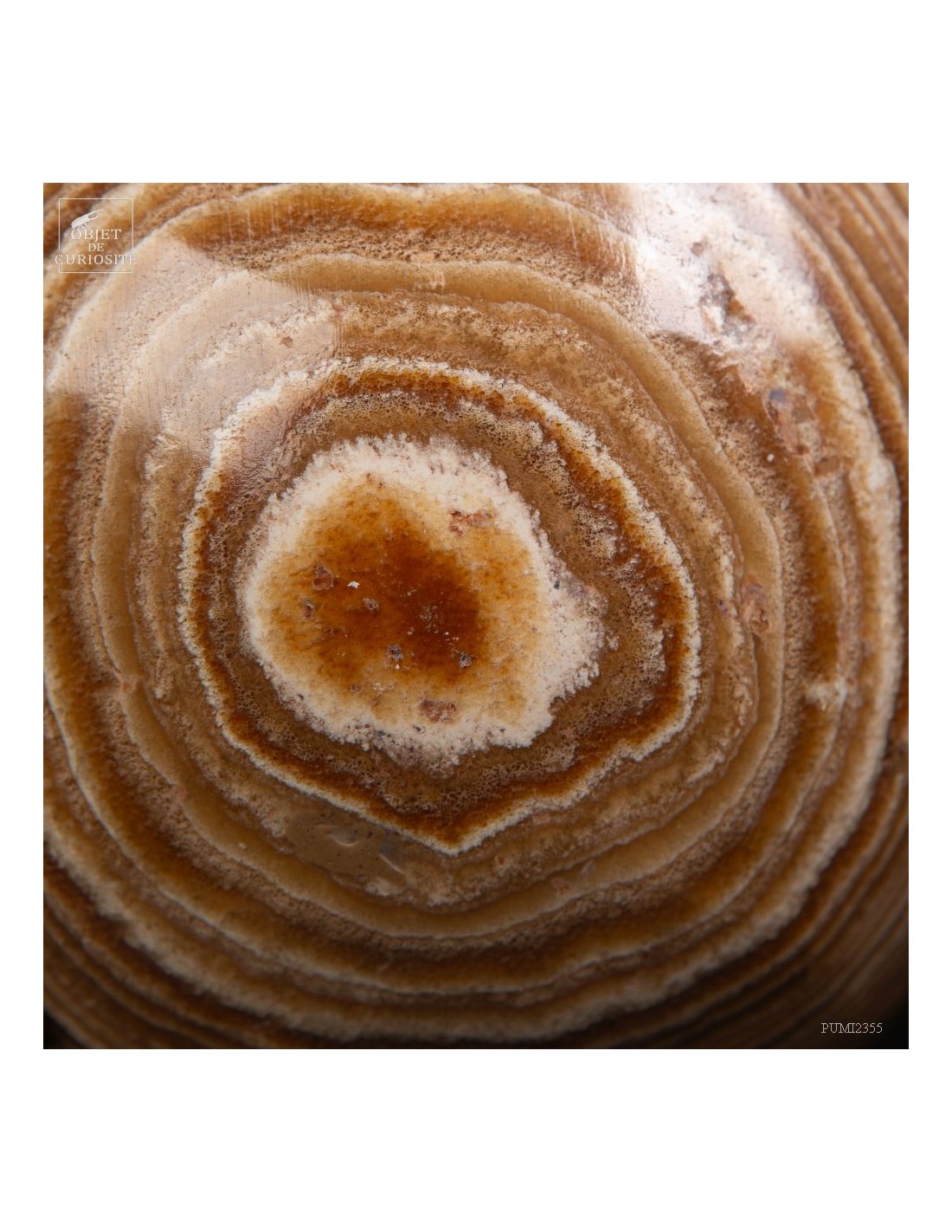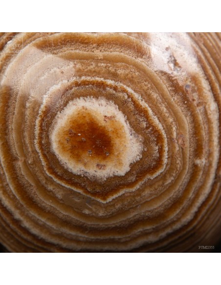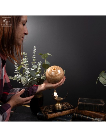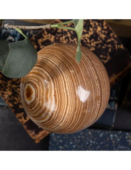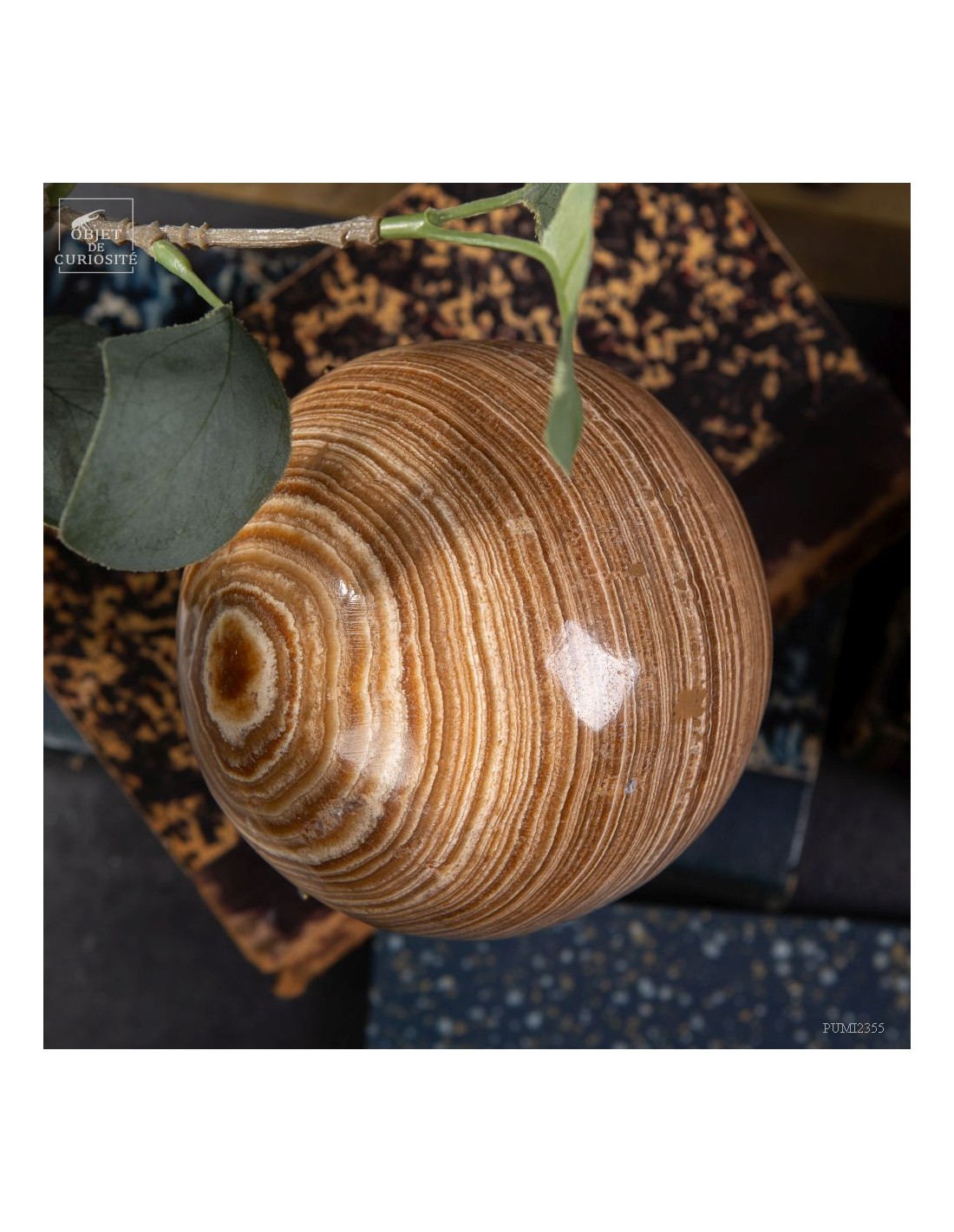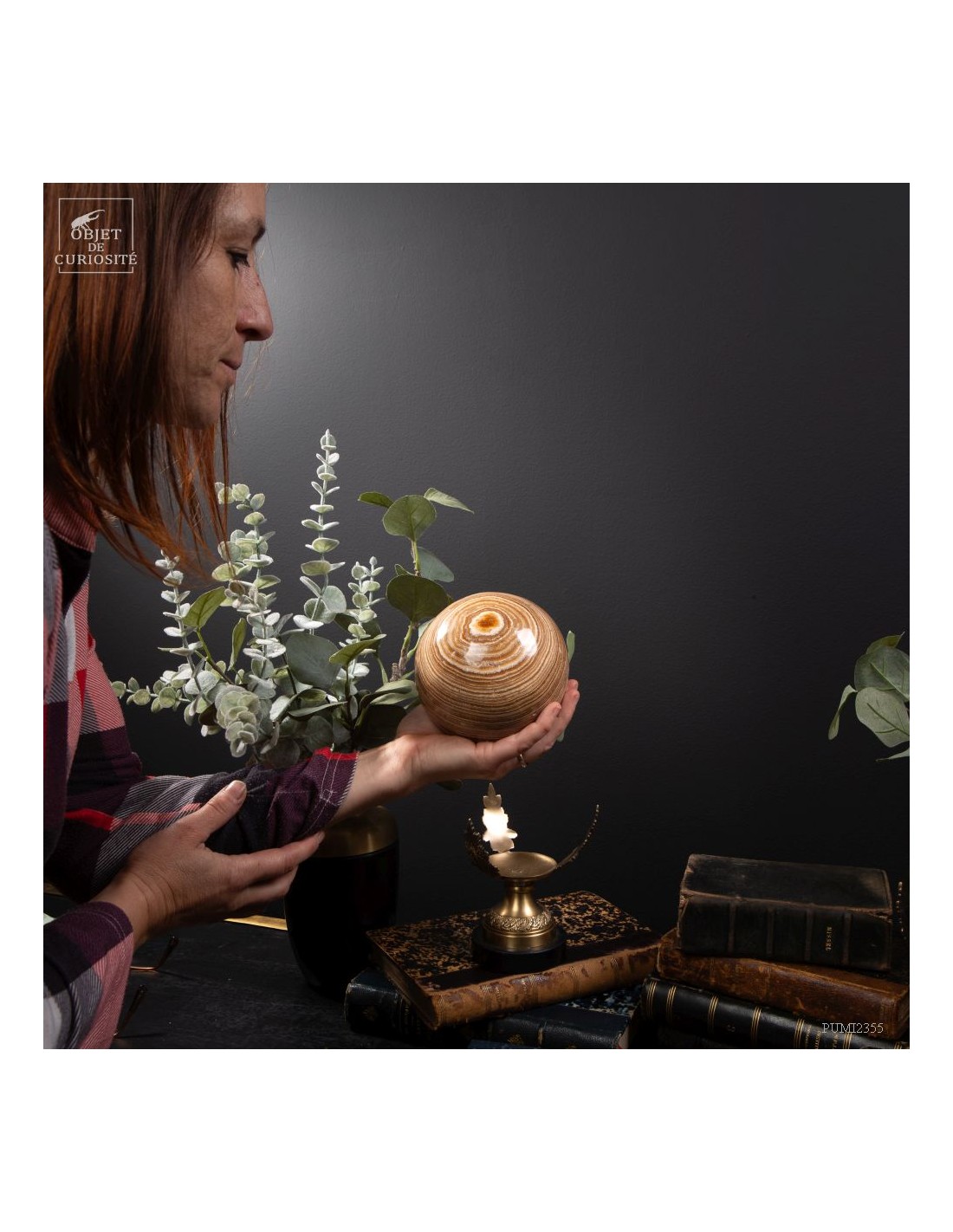 Cette planète sur un socle en laiton et marbre vient du Maroc et est en Aragonite. C'est en tout cas sous ce nom que nous l'avons découverte dans la région de Séfrou au Nord du Maroc. Il s'agit donc d'une variété de Calcite à bandes qui reprend exactement les couleurs de la célèbre Aragonite Marocaine qui , elle, se présente sous forme de cristaux tabulaires qui poussent dans toutes les directions. L'alternance des couches de couleur ambre et de couleur claire la rend spécialement graphique lorsqu'elle est taillée en sphère.