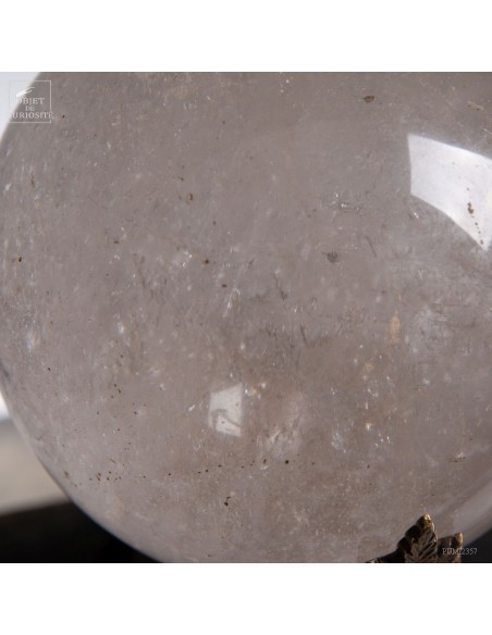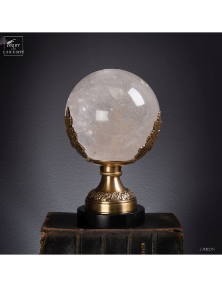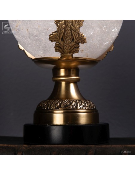 C'est l'objet de divination mythique: la boule de cristal. Mais c'est avant tout un cristal de roche naturel et transparent, mais il semble qu'il contienne des voiles de mystère... En fait il est le résultat d'un mélange imparfait de la solution de minéraux qui le composent (dioxyde de Silicium+ selenite, antimonite...) lors de sa croissance il y a plusieurs millions d'années. Un mélange imparfait, mais qui constitue le "jardin" de ce cristal: sa signature unique. Socle de feuilles d'Acanthe en laiton massif et marbre noir.