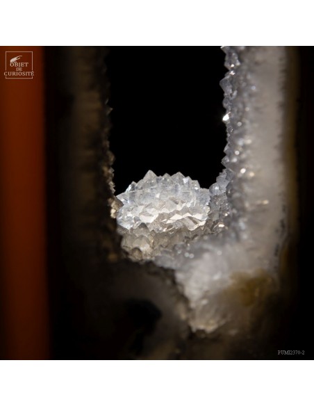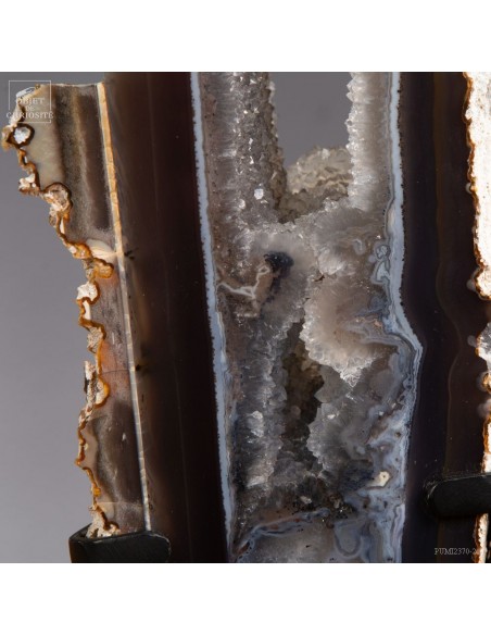 Au départ il y a une bulle d'air au Brésil: les laves basaltiques chargées de gaz remontant à la surface de la terre libèrent des bulles de gaz qui sont parfois restées bloquées par la viscosité de la lave refroidissant. Ces cavités recevront des dépôts de silice amenés par des solutions hydrothermales. Chaque nouvelle infiltration amènera des oxydes différents, et donc des couleurs différentes: l’hématite, le manganèse, la limonite, le chlorite verdâtre... Après les beaux dépôts d'agate dorée, la géode s'est arrêtée sur une cristallisation d'Améthyste assez pâle. La photo 6 montre l'éclat des couleurs quand une lumière la traverse. 5 tranches ont été taillées à partir de cette géode.