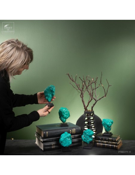 Voici la pierre qui a donné son nom à la couleur Turquoise. Quelle couleur inhabituelle dans la nature! C'est pour cela qu'elle a été choisi par les Indiens d'Amérique comme pierre fétiche: de nombreux bijoux, ceintures, ornements pectoraux... arborent cette pierre. Mais elle est plutôt rare, et donc chère. Cette belle pièce est, comme un très grand nombre de bijoux actuels en turquoise, de la Howlite. La howlite naturelle est blanche avec des fines veines noires, et comme c'est un borosilicate hydroxylé de calcium, il est poreux. C'est donc parfait pour prendre cette belle couleur turquoise... A un prix très différent! Cette pièce vient de Marmara en Turquie.