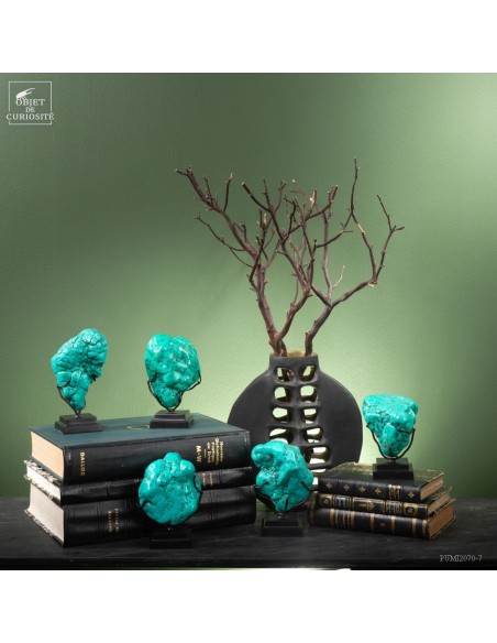 Voici la pierre qui a donné son nom à la couleur Turquoise. Quelle couleur inhabituelle dans la nature! C'est pour cela qu'elle a été choisi par les Indiens d'Amérique comme pierre fétiche: de nombreux bijoux, ceintures, ornements pectoraux... arborent cette pierre. Mais elle est plutôt rare, et donc chère. Cette belle pièce est, comme un très grand nombre de bijoux actuels en turquoise, de la Howlite. La howlite naturelle est blanche avec des fines veines noires, et comme c'est un borosilicate hydroxylé de calcium, il est poreux. C'est donc parfait pour prendre cette belle couleur turquoise... A un prix très différent! Cette pièce vient de Marmara en Turquie. C'est celle tout à droite, sur la photo de groupe.