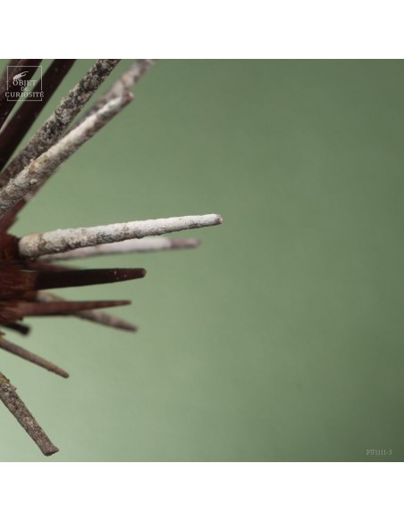 Chez les oursins-crayons du Pacifique, c'est comme dans une papeterie: il y a plusieurs sortes de crayons! Cette espèce, le Stylocidaris affinis, a des "crayons" plutôt fins, avec des anneaux plus clairs sur certains crayons. Il s'agit bien-sûr de ses piques. Et on peut le rencontrer de 30 à -1000 mètres dans la zone de Cuba aux Antilles. c'est un animal plutôt nocturne qui essaie de se montrer discret dans la journée en restant caché sous les rochers. Celui-ci ne sera pas discret du tout, derrière sa loupe verticale.