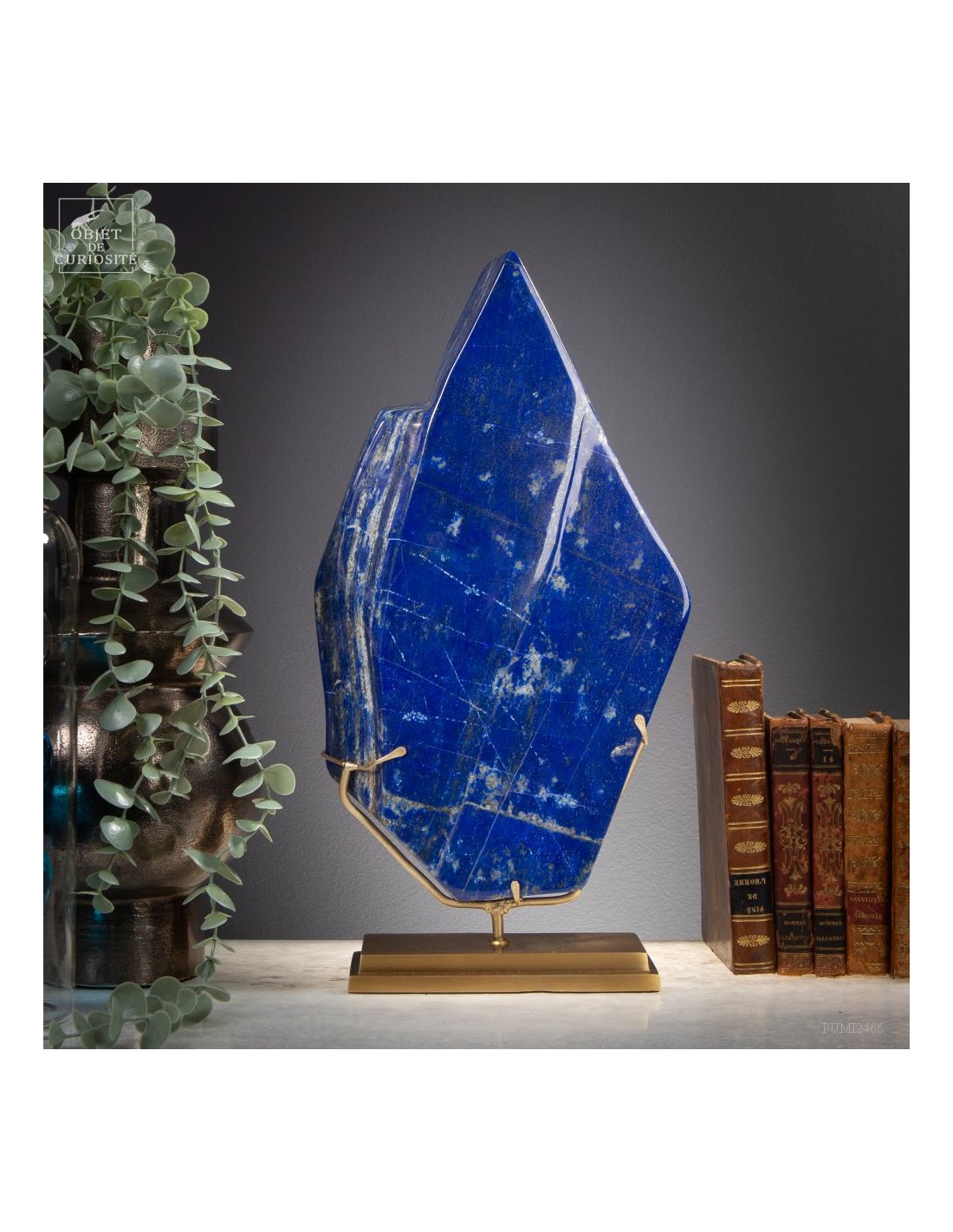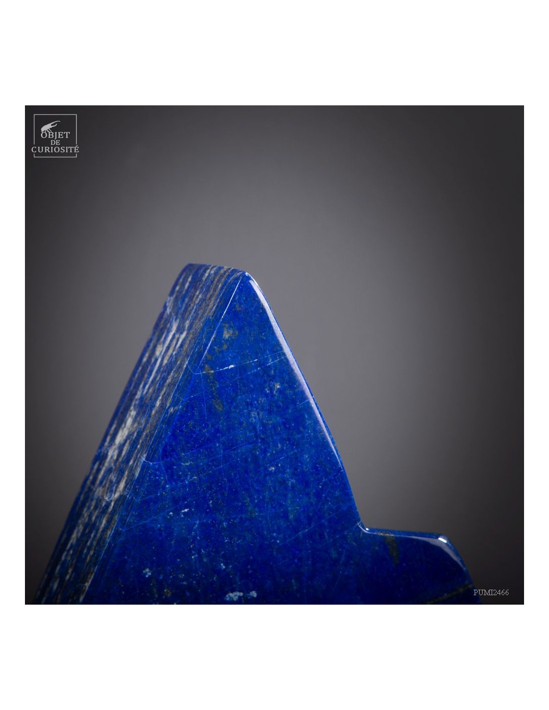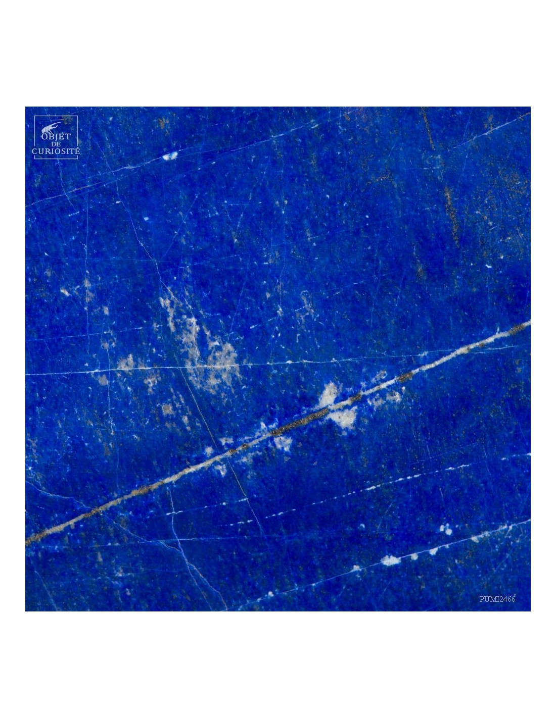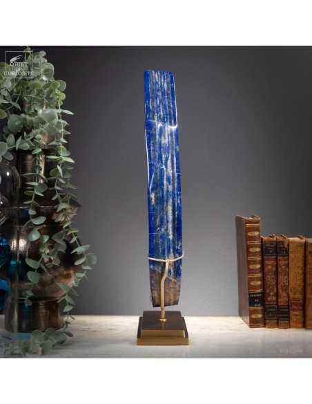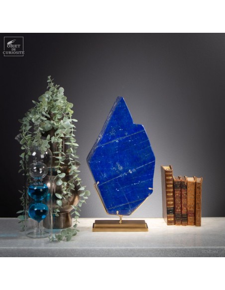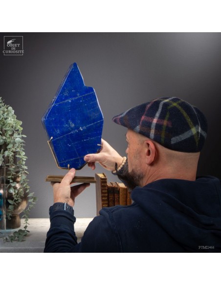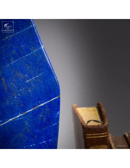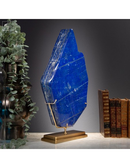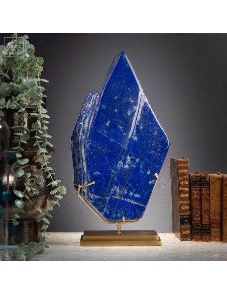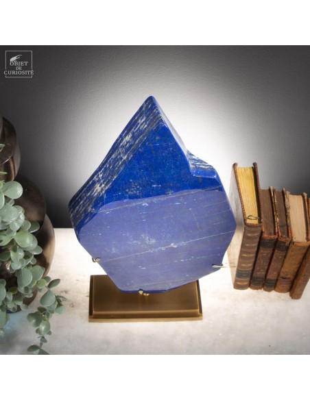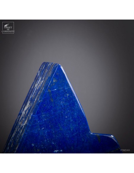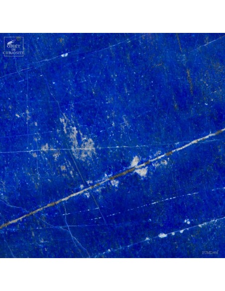 Les plus beaux Lapis-Lazuli proviennent de la province de Badakhshan an nord de l'Afghanistan. Dans une vallée étroite, recouverte de neige la majorité de l'année, des mines sont exploitées depuis 6000 ans! Les Sumériens, puis plus tard les Egyptiens appréciaient cette pierre bleue, comme en atteste les nombreuses statues et perles bleues que l'on a retrouvé dans les tombeaux des personnages importants. Et tous, comme celui-ci, provenaient des montagnes Afghanes. Le Lapis-Lazuli est une roche composée de 14 minéraux différents, dont le principal est la Lazurite, bleue, et la petite touche dorée apportée par la Pyrite qui parsème ce minéral. Celui-ci est de qualité extra: on pourrait tailler de nombreuses pierre pou bijoux dedans.