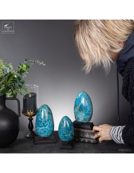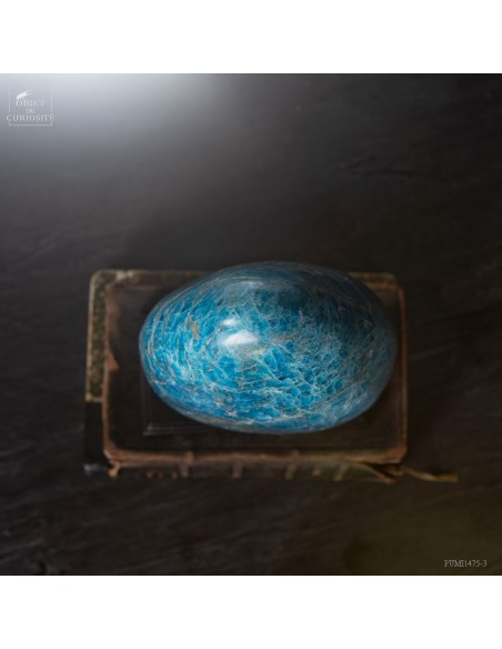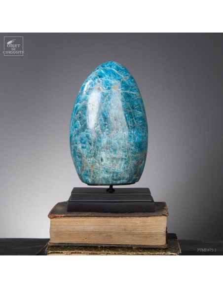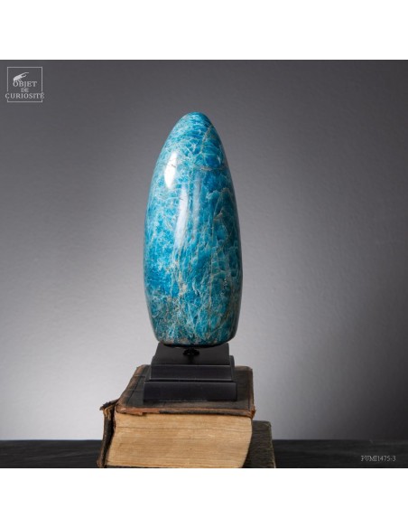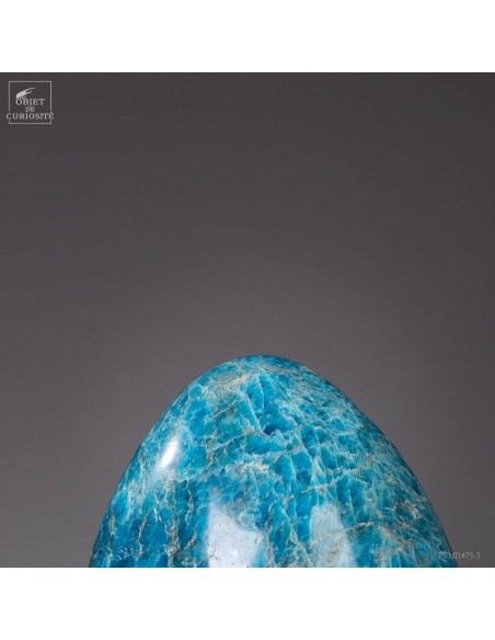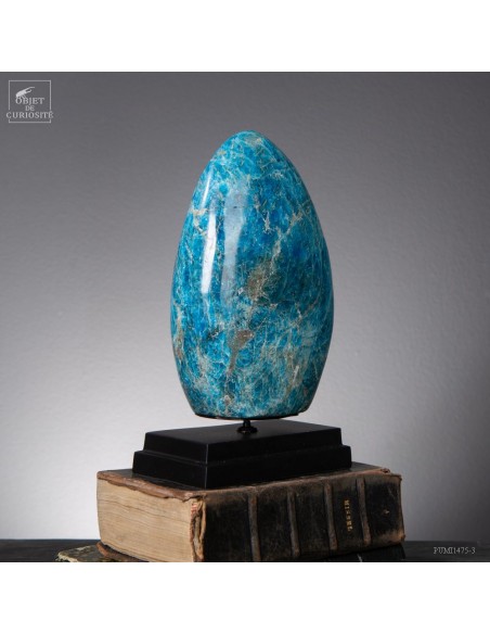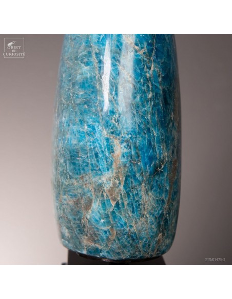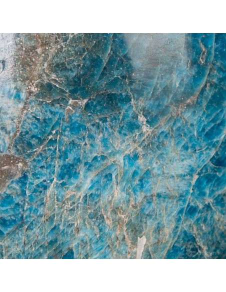 Venue de L'extrême Sud Est de Madagascar -Betroka- Les meilleures Apatite bleue proviennent d’une mine exploitée par Norcross. L’apatite peut être trouvée de vert à bleu, mais les plus belles Apatite bleues sont comme celle-ci : une vue au-dessus d’un océan rugissant. Provenant d’une origine hydrothermale, et se formant dans les veines, c’est un phosphate de calcium. Et le plus souvent une Fluorapatite, car elle contient de la fluorite. Mais le nom commercial reste l'Apatite bleue...Historiquement, le nom "apatite" a des racines dans le grec ancien, signifiant "tromper", en raison de sa similitude avec d'autres minéraux (notamment avec la barytine).
