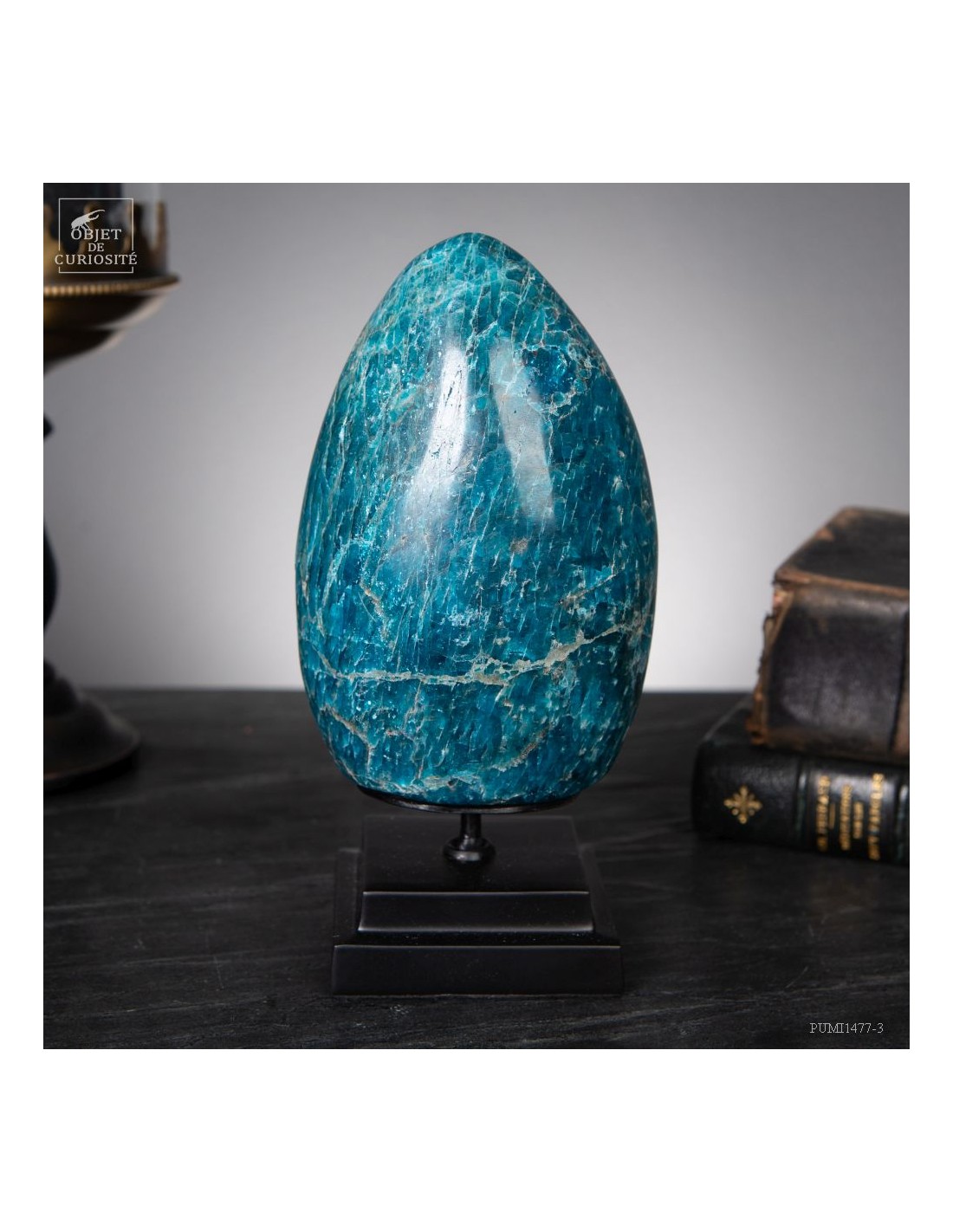 Venue de L'extrême Sud Est de Madagascar -Betroka- Les meilleures Apatite bleue proviennent d’une mine exploitée par Norcross. L’apatite peut être trouvée de vert à bleu, mais les plus belles Apatite bleues sont comme celle-ci : une vue au-dessus d’un océan rugissant. Provenant d’une origine hydrothermale, et se formant dans les veines, c’est un phosphate de calcium. Et le plus souvent une Fluorapatite, car elle contient de la fluorite. Mais le nom commercial reste l'Apatite bleue...sur la photo de groupe, c'est celle du milieu.