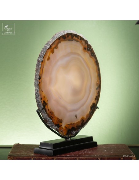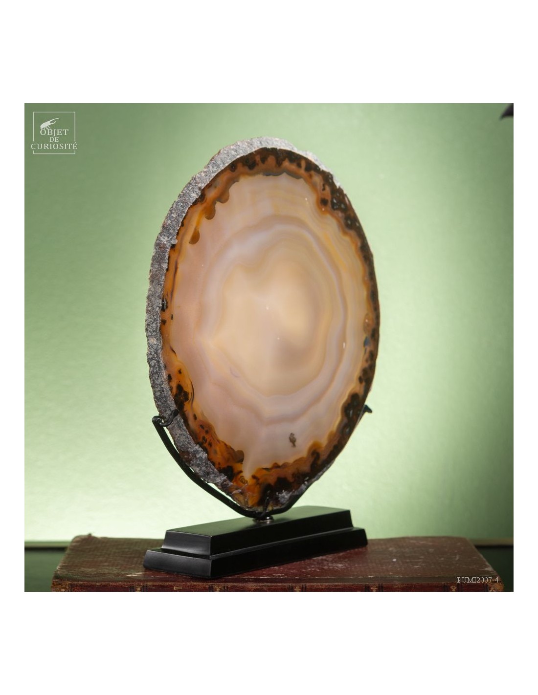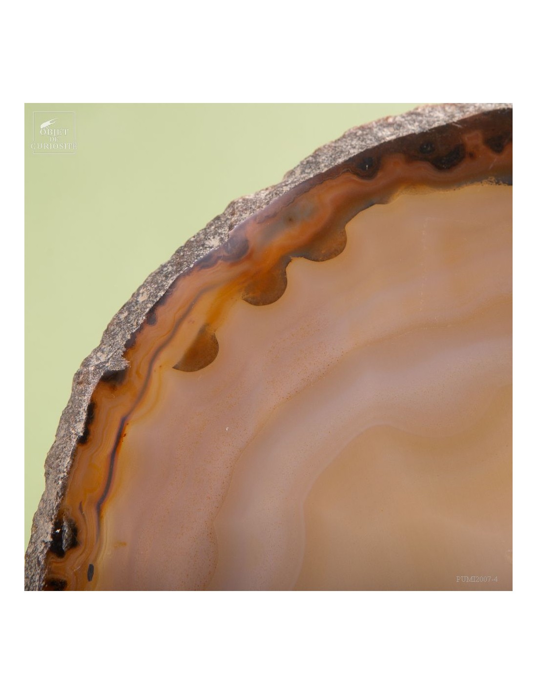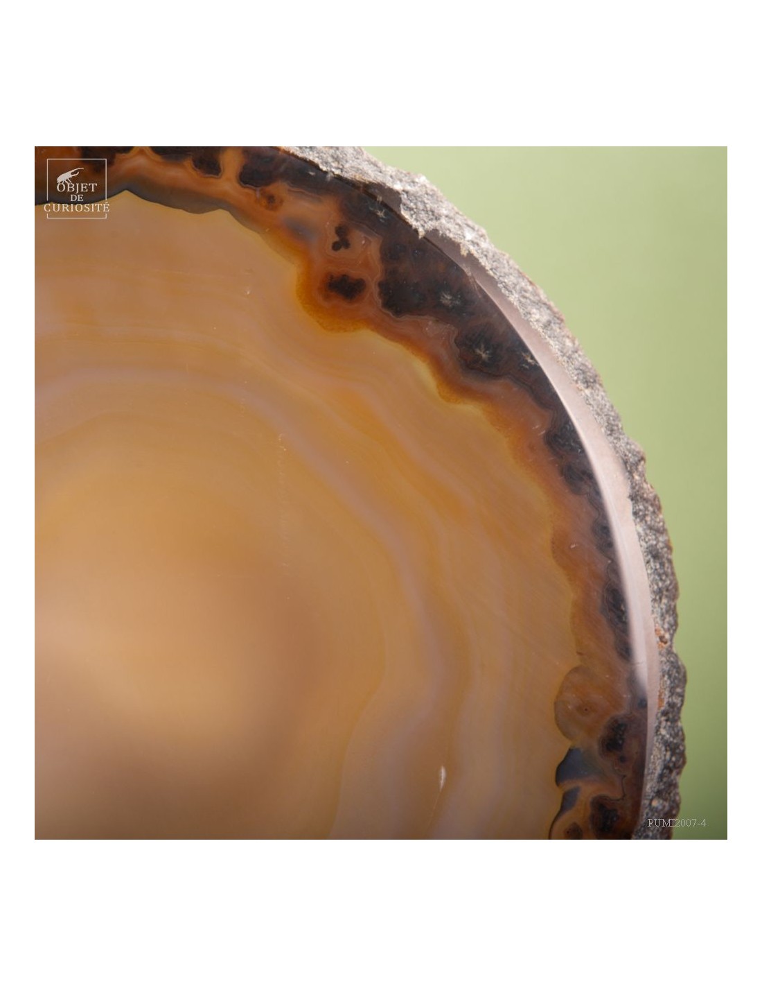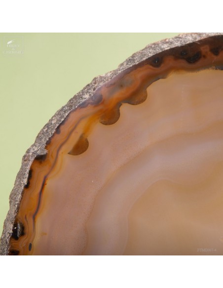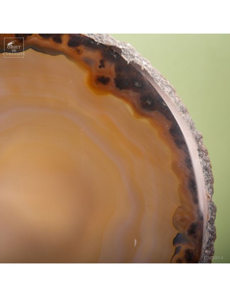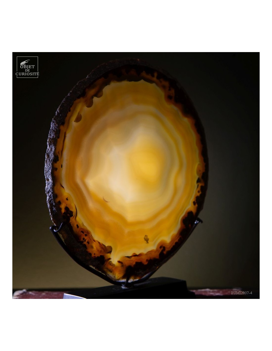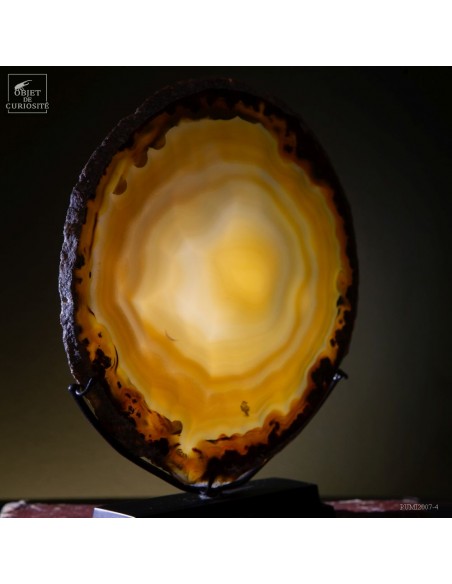 Si vous placez cette tranche d'Agate devant une source de lumière, vous serez ébloui par la couleur dorée qu'elle prend, comme sur la 2eme photo L'ancienne bulle de gaz qui s'est solidifiée dans la lave d'un volcan a reçu année après année des dépôts de silice amenés par des solutions hydrothermales. Chaque nouvelle infiltration amènera des oxydes différents, et donc des couleurs différentes: l’hématite, le manganèse, la limonite, le chlorite verdâtre... C'est ce qui a fait ces cercles à l'intérieur de l'agate.