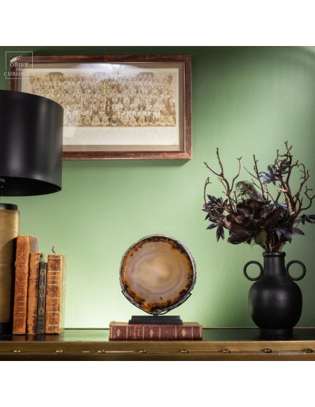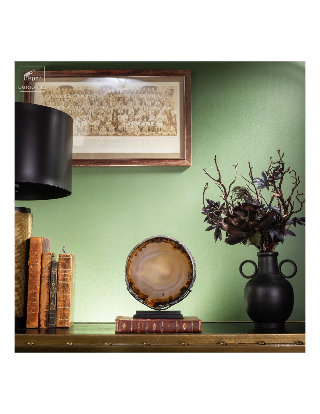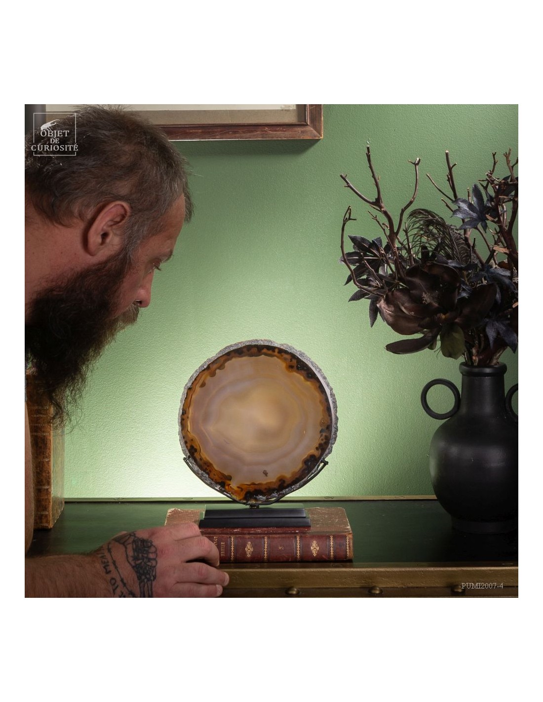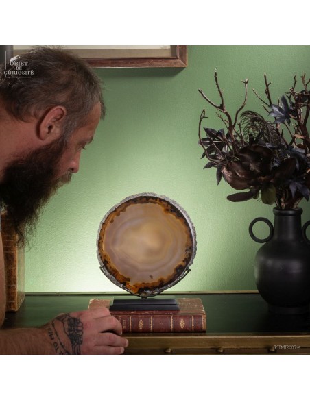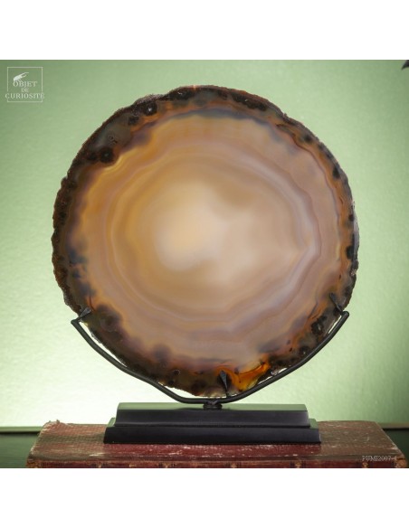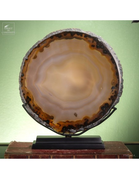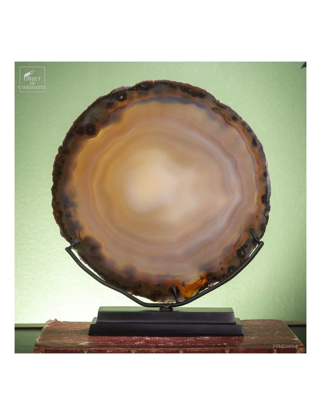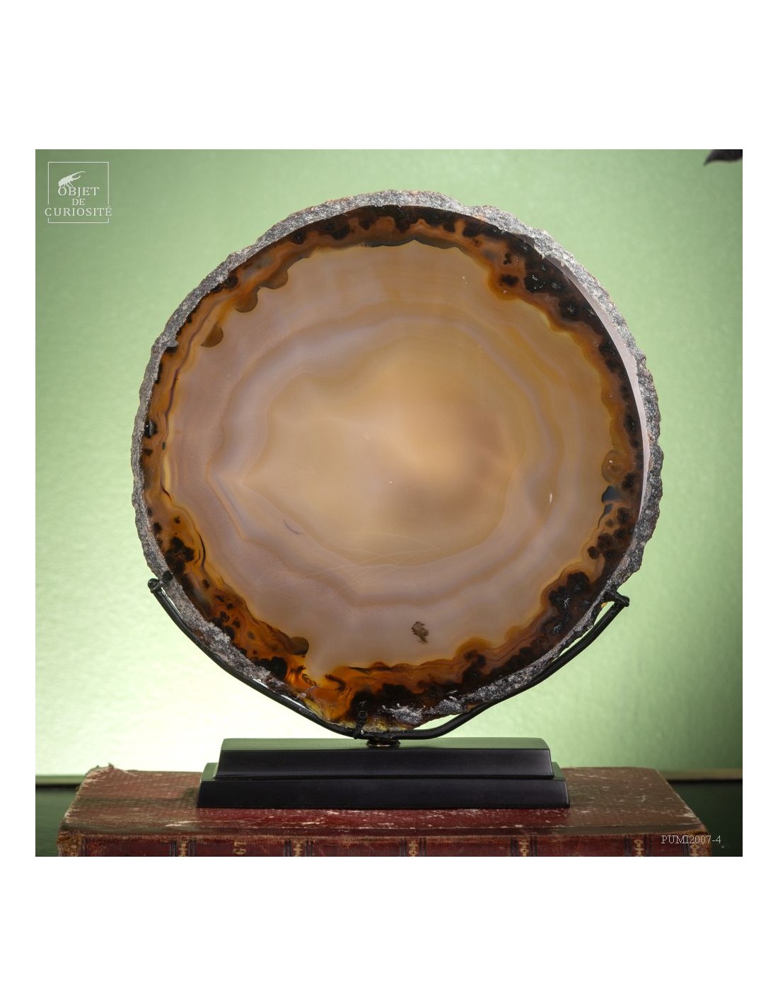 Si vous placez cette tranche d'Agate devant une source de lumière, vous serez ébloui par la couleur dorée qu'elle prend, comme sur la 2eme photo L'ancienne bulle de gaz qui s'est solidifiée dans la lave d'un volcan a reçu année après année des dépôts de silice amenés par des solutions hydrothermales. Chaque nouvelle infiltration amènera des oxydes différents, et donc des couleurs différentes: l’hématite, le manganèse, la limonite, le chlorite verdâtre... C'est ce qui a fait ces cercles à l'intérieur de l'agate.