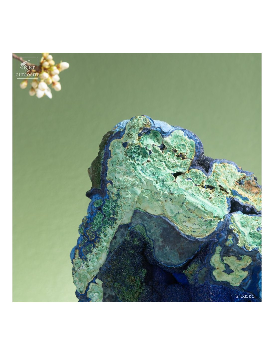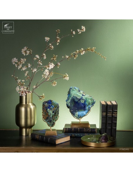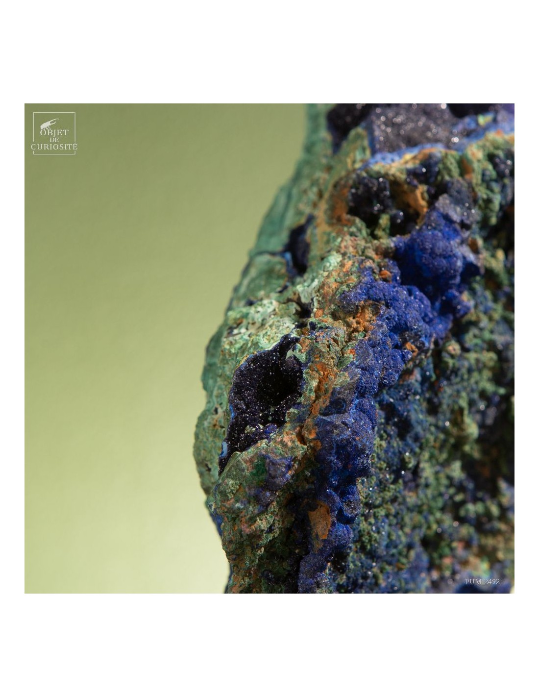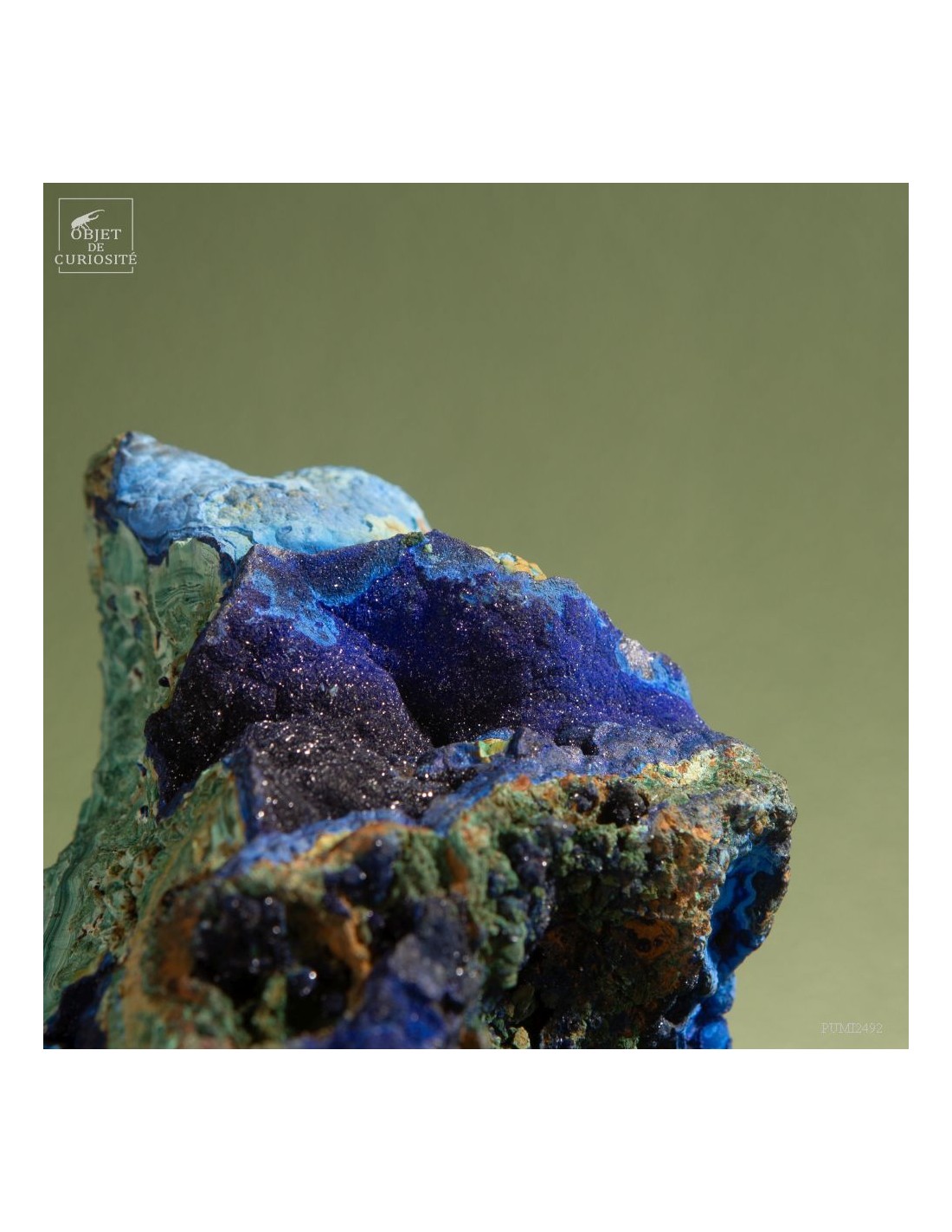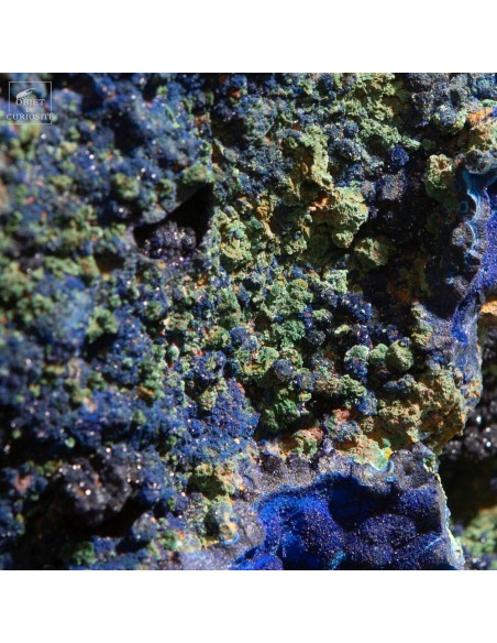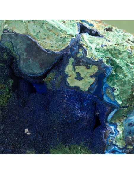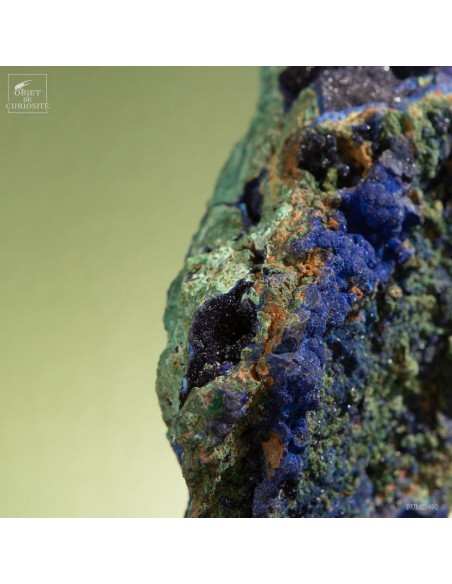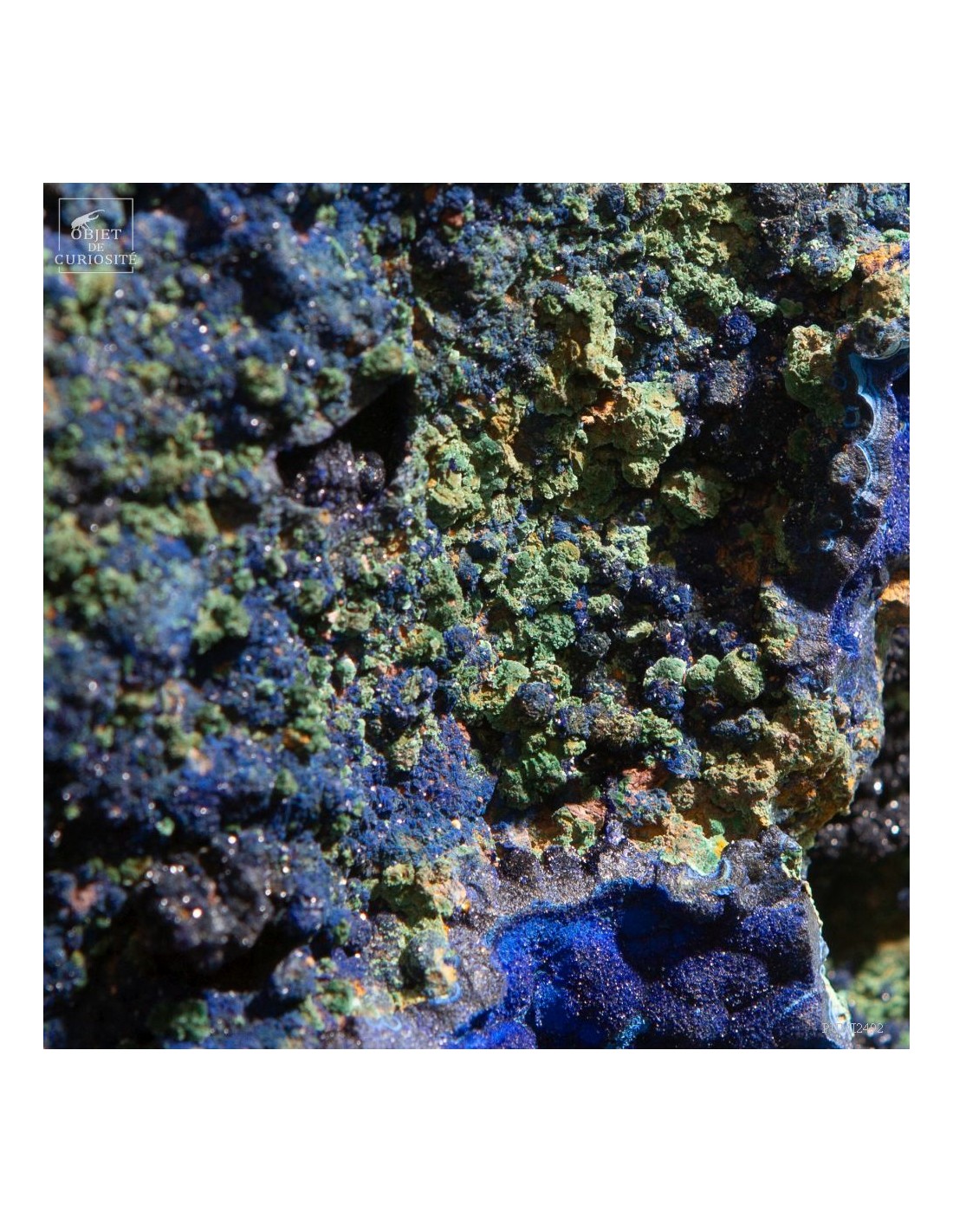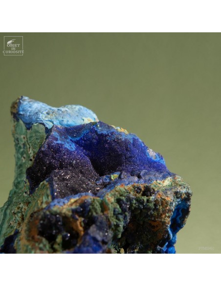 Deux couleurs éclatantes : ces deux minéraux sont souvent trouvés ensemble a proximité de veines de cuivre. L'Azurite, incroyablement bleue, est en fait en carbonate de cuivre, et peut dans certains cas évoluer vers la Malachite, intensément verte. Ces deux minéraux ont été utilisés comme pigments pour la peinture dès le 27ème siècle avant J.C. par les Egyptiens!